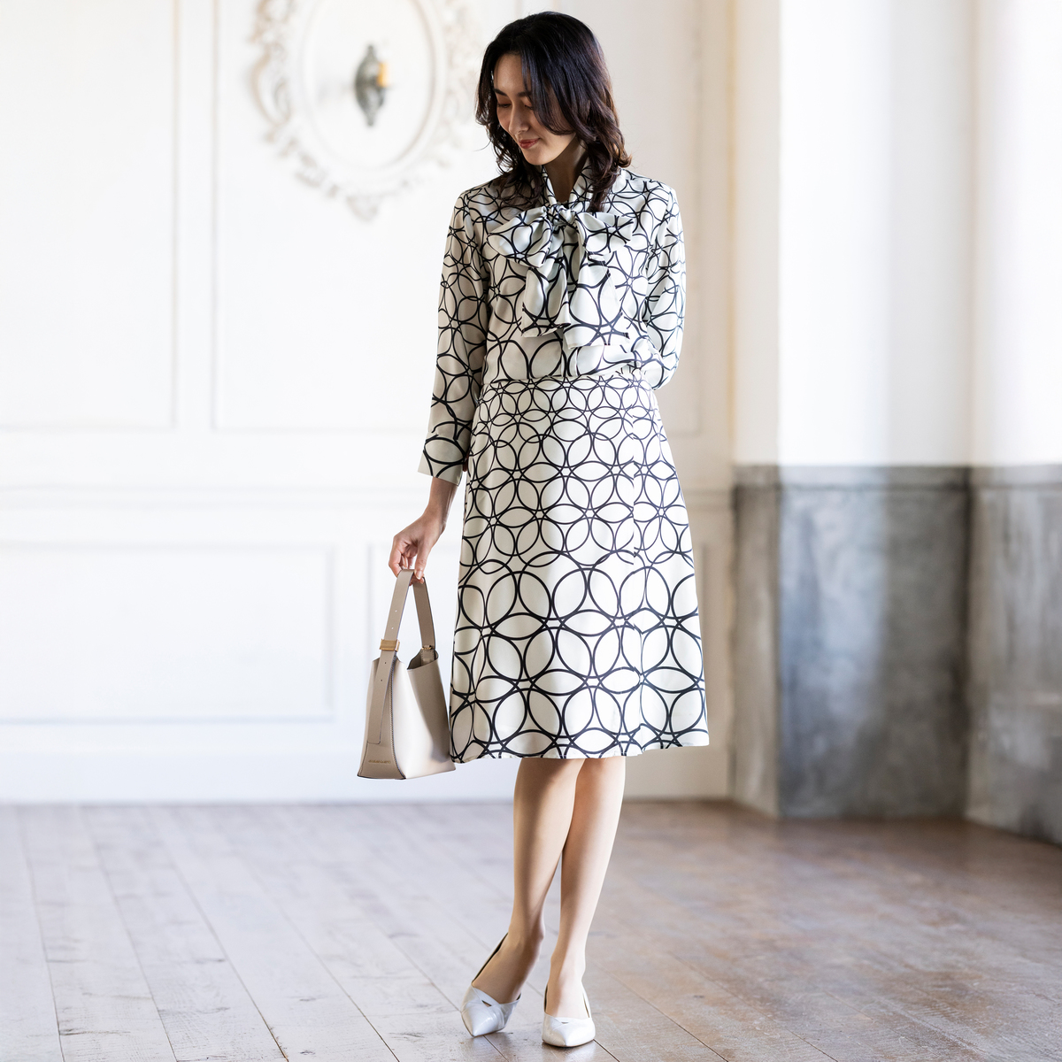 微光沢のサテンが柄を引き立て、肌映りも華やかに。大人の上品さが漂う洗練されたデザインで、オフィスやお出かけにも映えます