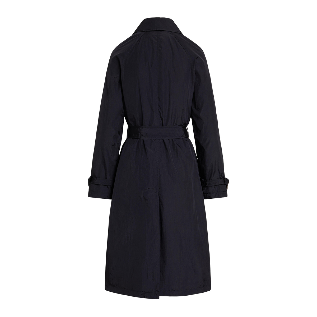 控えめな光沢のある薄手のタフタでトラディショナルなトレンチコートのシルエットを一新