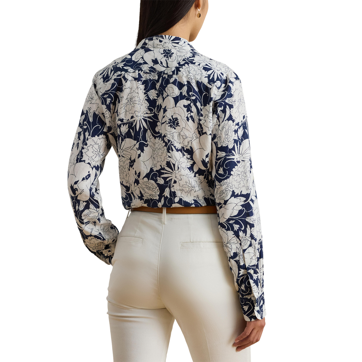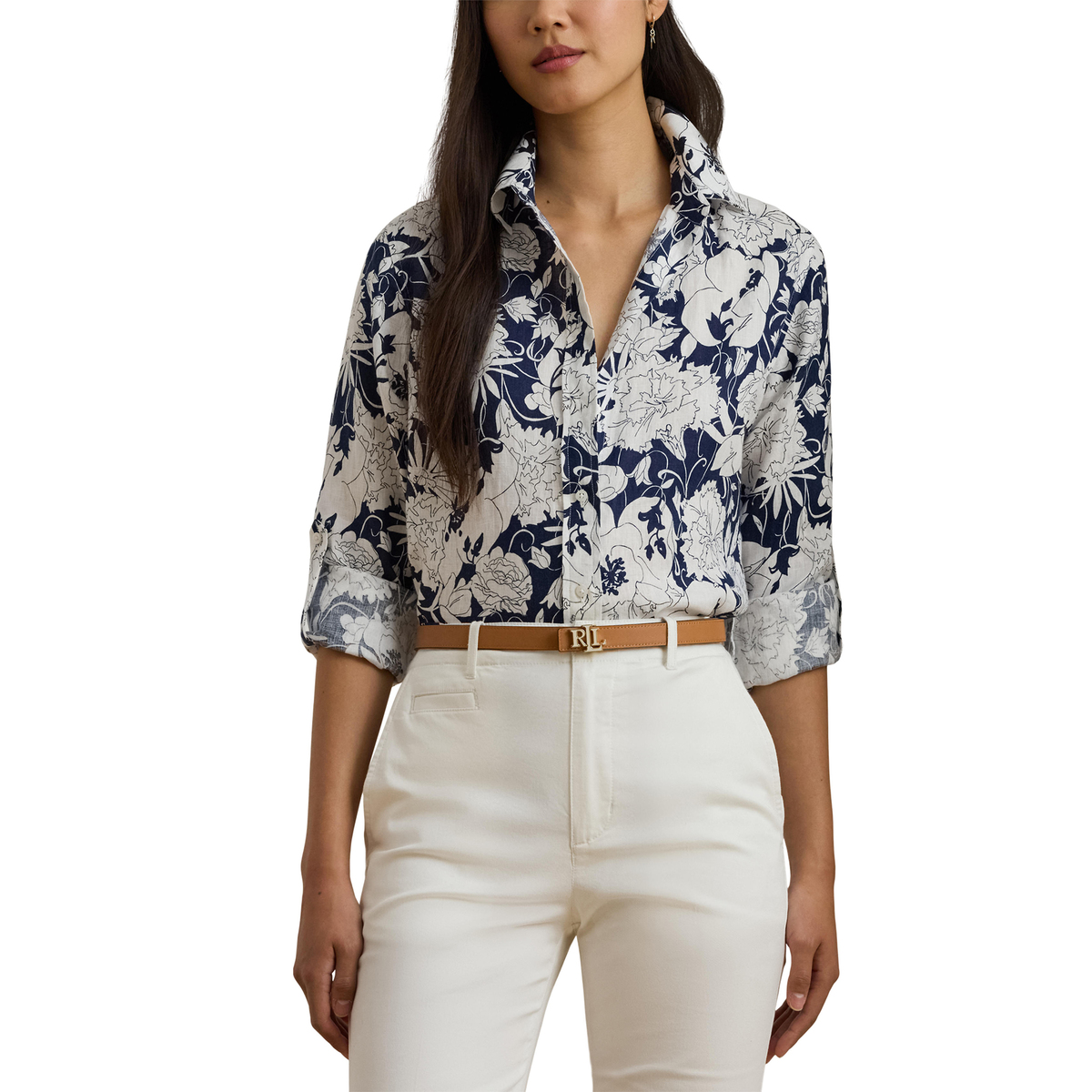 Lauren Ralph Lauren スプリングシーズンのスタイライズされたツートーン フローラル モチーフがあしらわれている。ロールタブ付きの長袖、ボタン付きバレルカフス / プリーツ入りのカフス。バックヨーク / ラウンド型にカーブした裾
