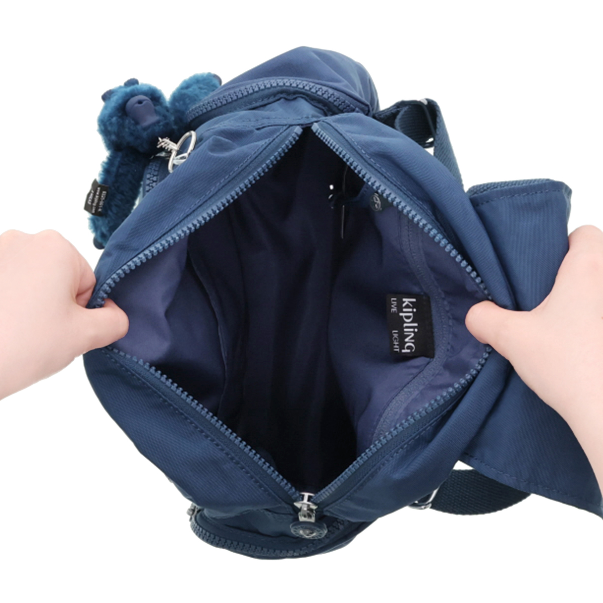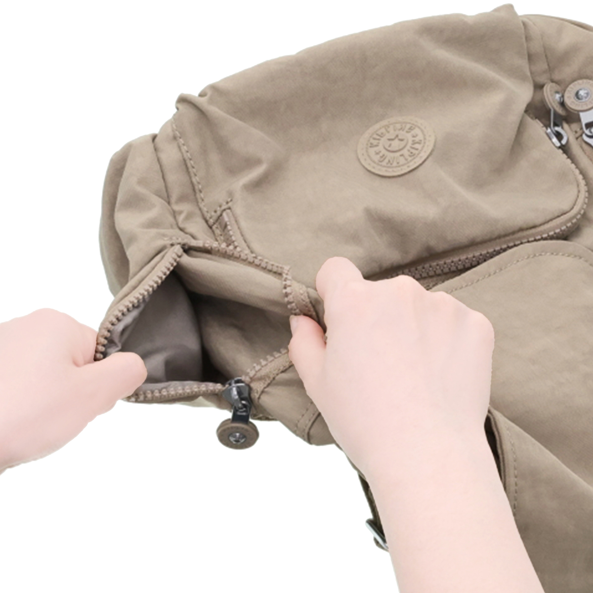 両サイドにファスナーポケット、さらに背面いっぱいのファスナーポケットや、正面のマチ付きコの字ファスナーポケットなど、全方向にそれぞれ異なるポケットがついています。背面部と底部はクッション入りで、背中が痛くなりにくく、型崩れがしにくい構造です