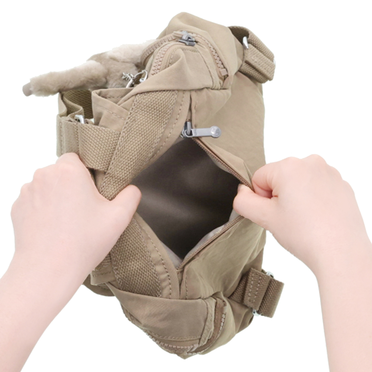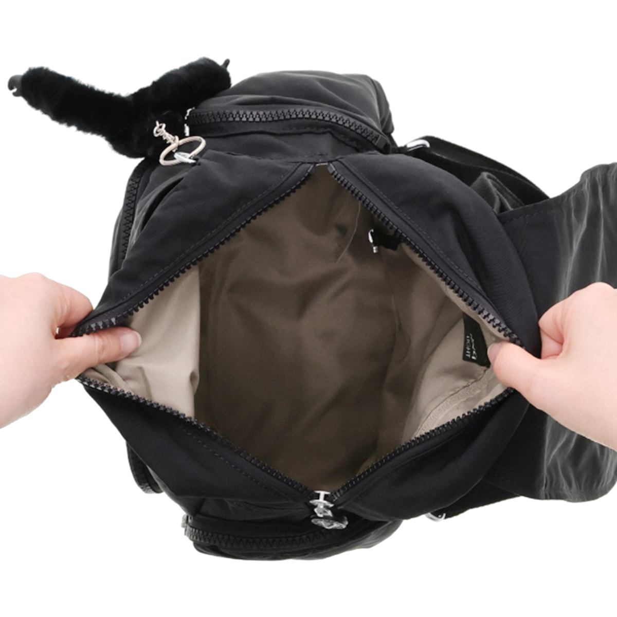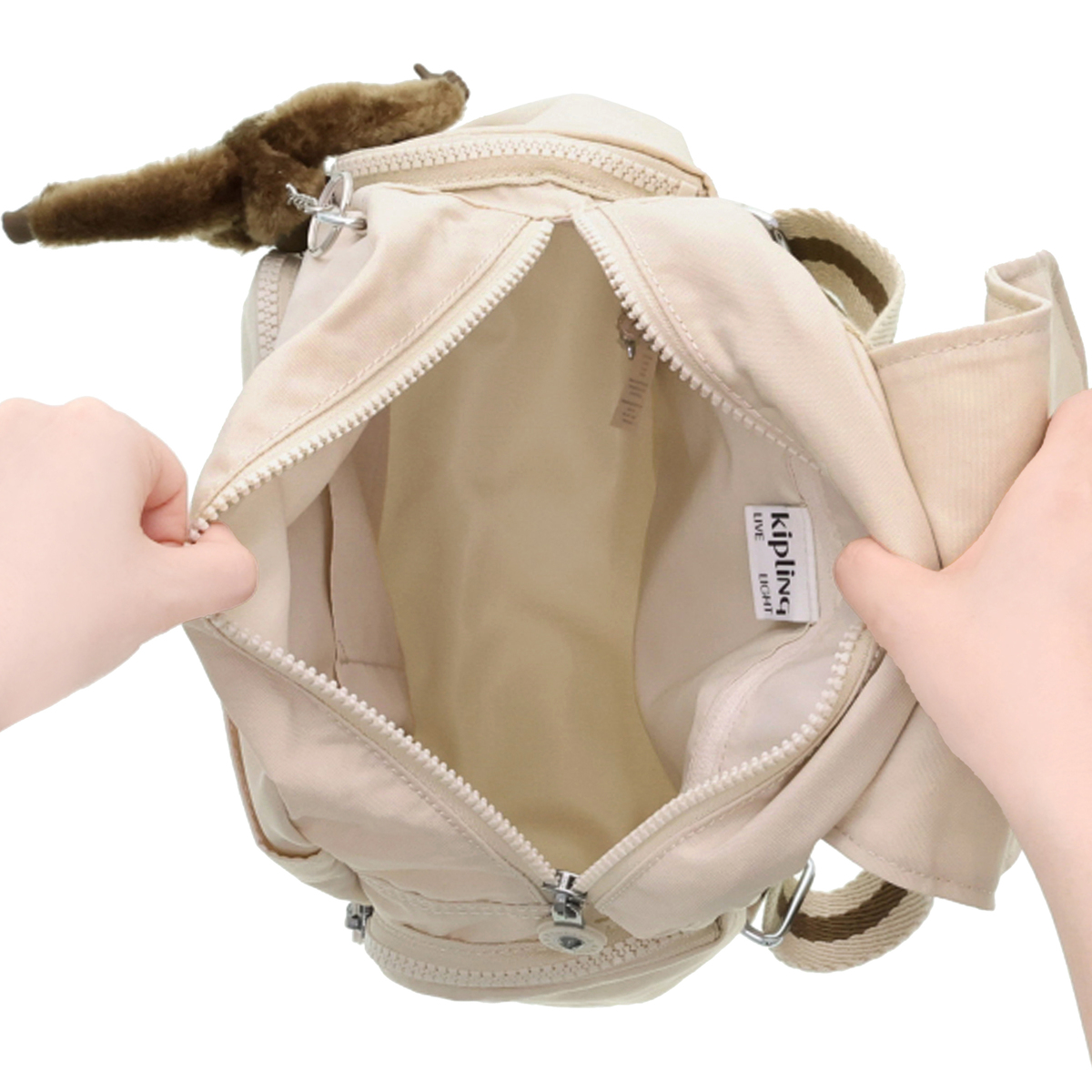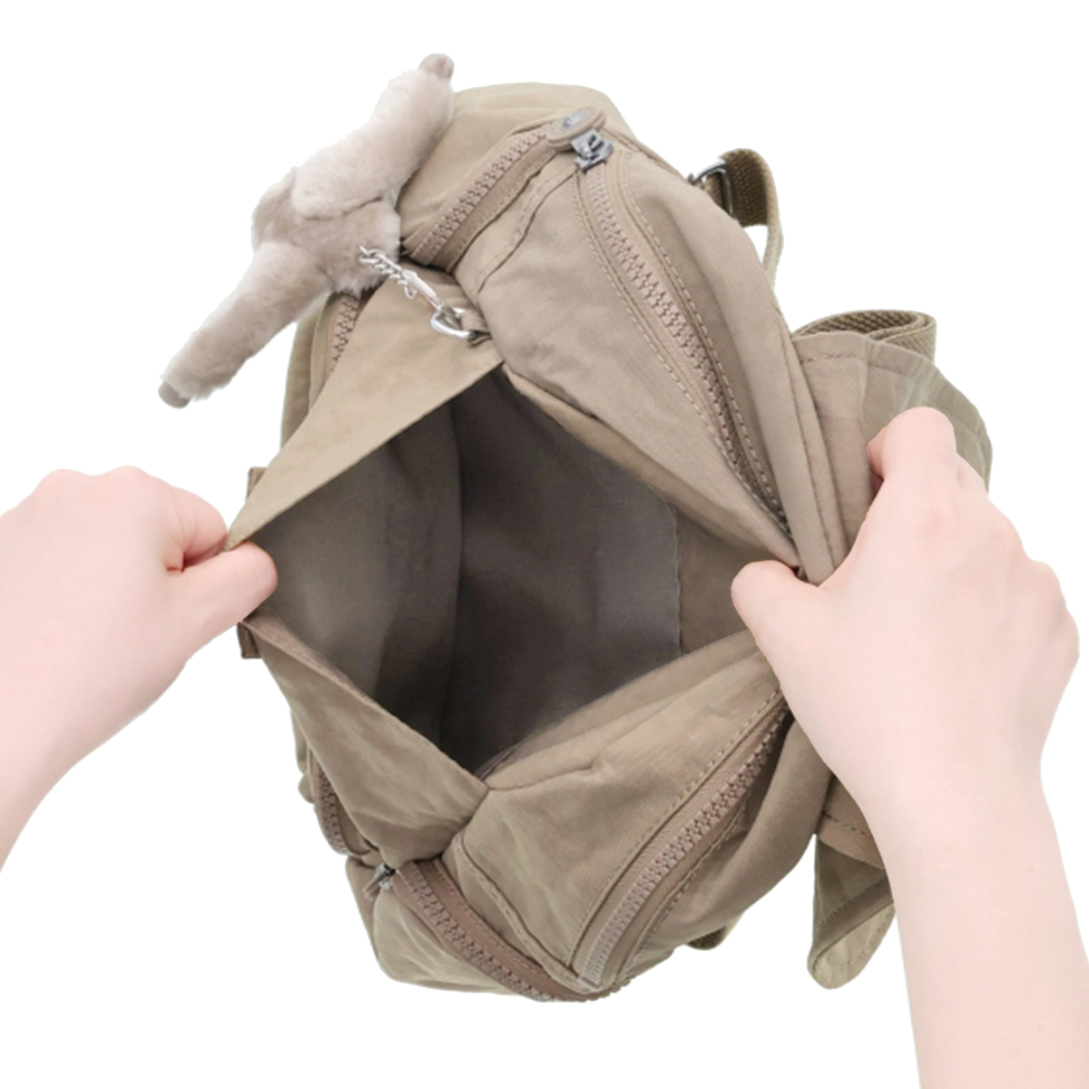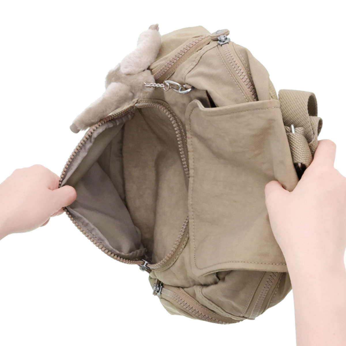 [サイズ(約)] 縦29×横27×マチ14cm ショルダーベルト長さ:47〜86cm ハンドル立ち上り8cm [重量(約)]※付属品含む 430g [素材] ナイロン ※裏地有 [仕様] 付属(取り外し可):チャーム×1 開閉:かぶせ蓋マグネット式+ファスナー式 底ビョウ:無 [ポケット] <内側> ファスナーポケット×1、オープンポケット×1、ペン挿し×1 <外側> 前面:ファスナーポケット×1、フラップ内側にオープンポケット×1 側面:ファスナーポケット×2 後面:ファスナーポケット×1 [注意事項] ※直射日光や蛍光灯の影響で変色する場合がありますのでご了承ください 【トープベージュ:インドネシア、トープベージュ以外:中国製】