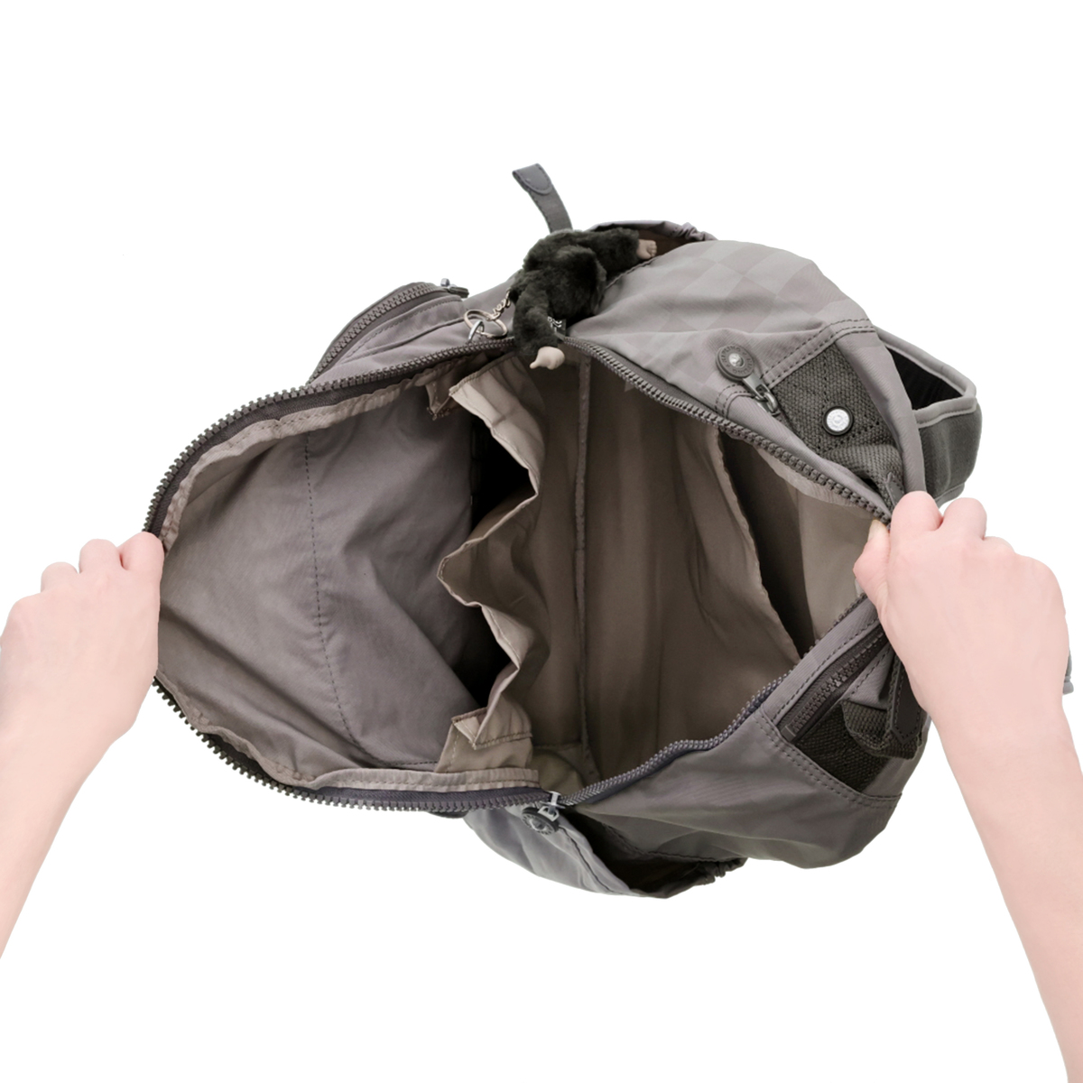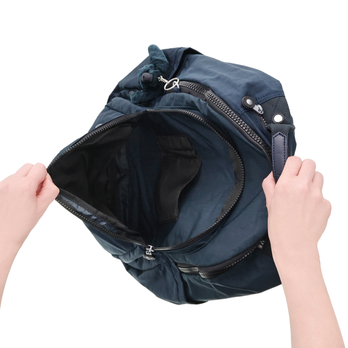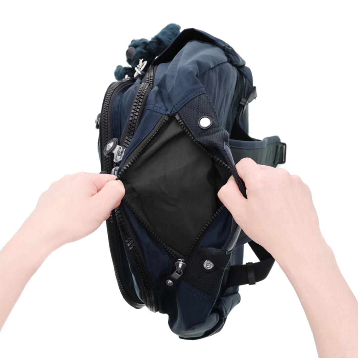 メインは左右どちらでも開閉可能な、ダブルファスナー仕様。最上部から半分以上の深さで広く開くので、荷物の出し入れがしやすく。さらにメイン収納の中には、ノートPC(15インチまで)やタブレットが直接入る、クッション材入りのポケットが付いています