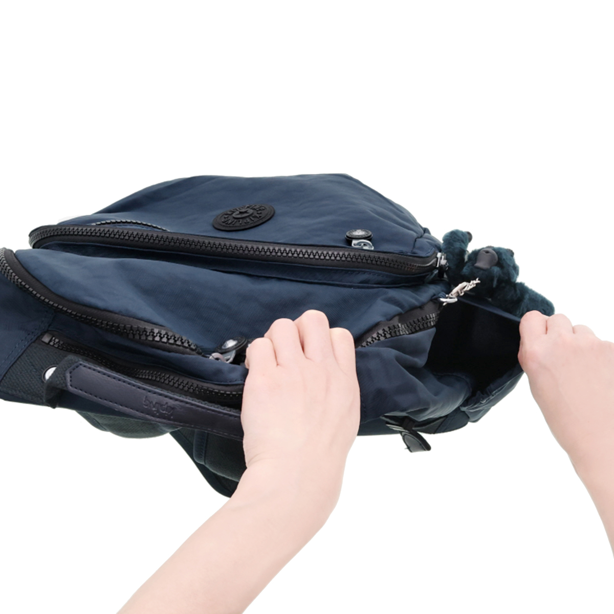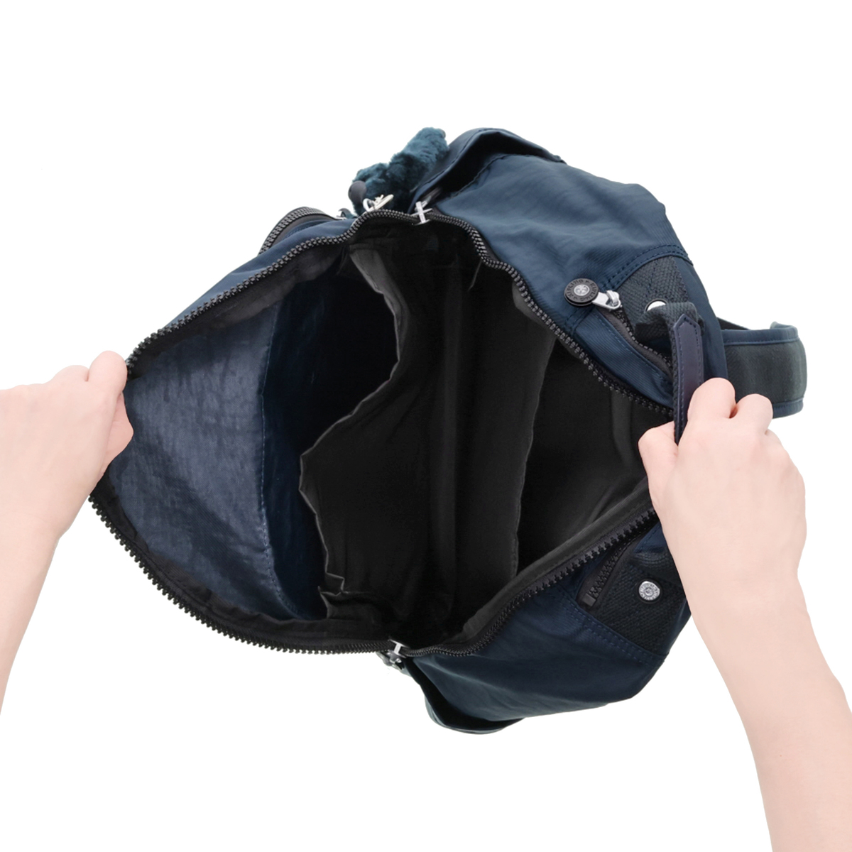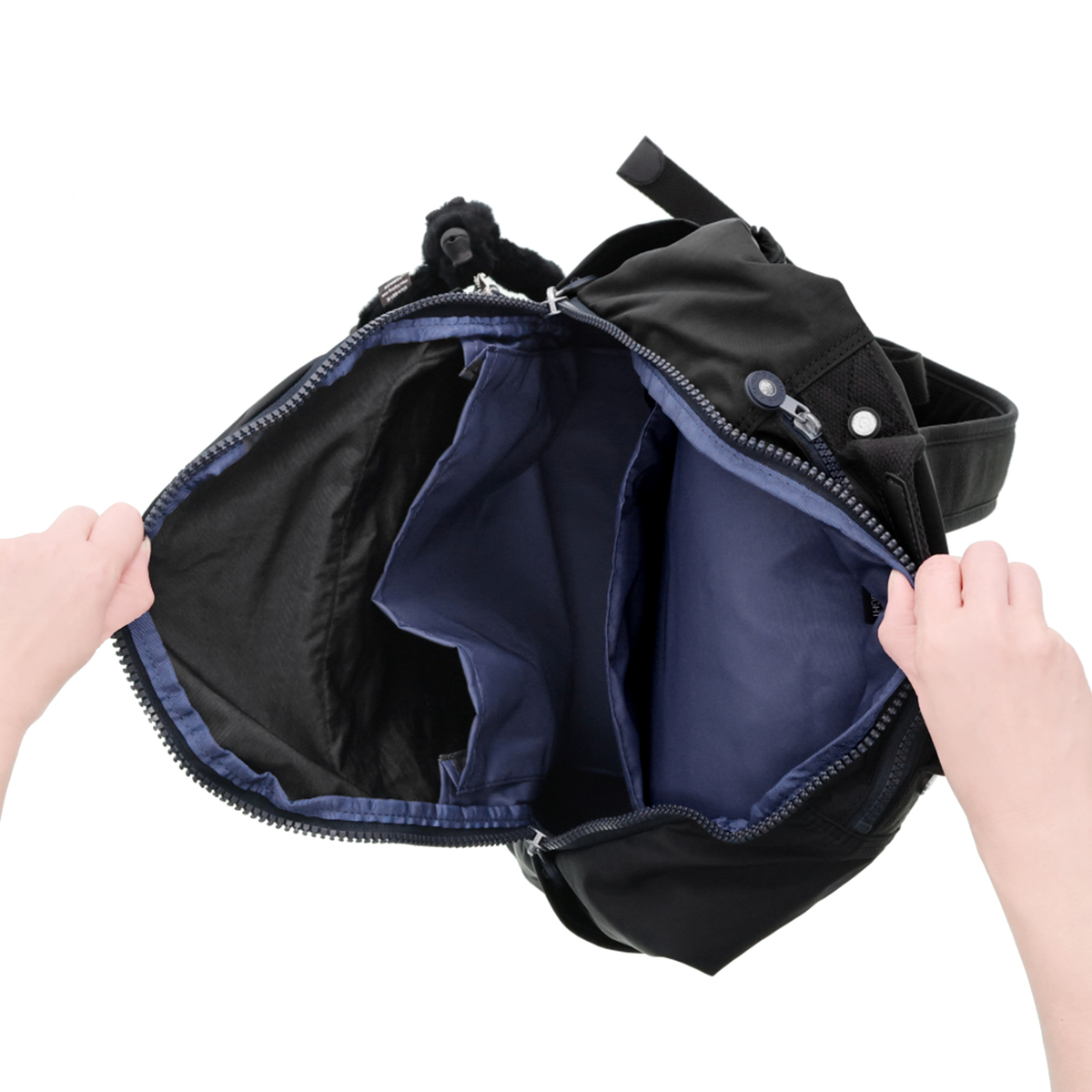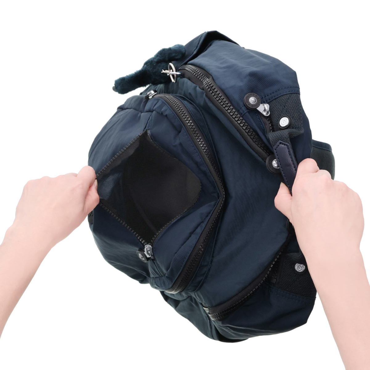 メインは左右どちらでも開閉可能な、ダブルファスナー仕様。最上部から半分以上の深さで広く開くので、荷物の出し入れがしやすく。さらにメイン収納の中には、ノートPC(15インチまで)やタブレットが直接入る、クッション材入りのポケットが付いています