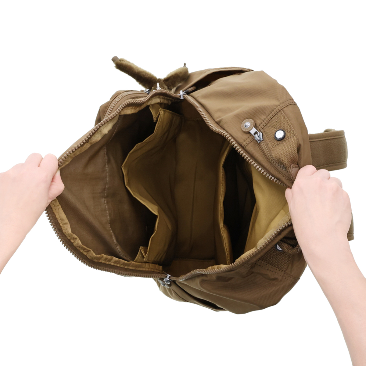 [サイズ(約)] 縦43×横33×マチ18.5cm ショルダーベルト長さ:49〜87cm ハンドル立ち上り4cm [重量(約)]※付属品含む 630g [素材] ナイロン ※裏地有 [仕様] 付属(取り外し可):チャーム×1 開閉:ダブルファスナー式 底ビョウ:無 [ポケット] <内側> オープンポケット×2 <外側> 前面:ファスナーポケット×2(内1つの内側にオープンポケット×1、ペン挿し×2) 側面:オープンポケット×2 天面:ファスナーポケット×1 [注意事項] ※直射日光や蛍光灯の影響で変色する場合がありますのでご了承ください 【バングラデシュ製】