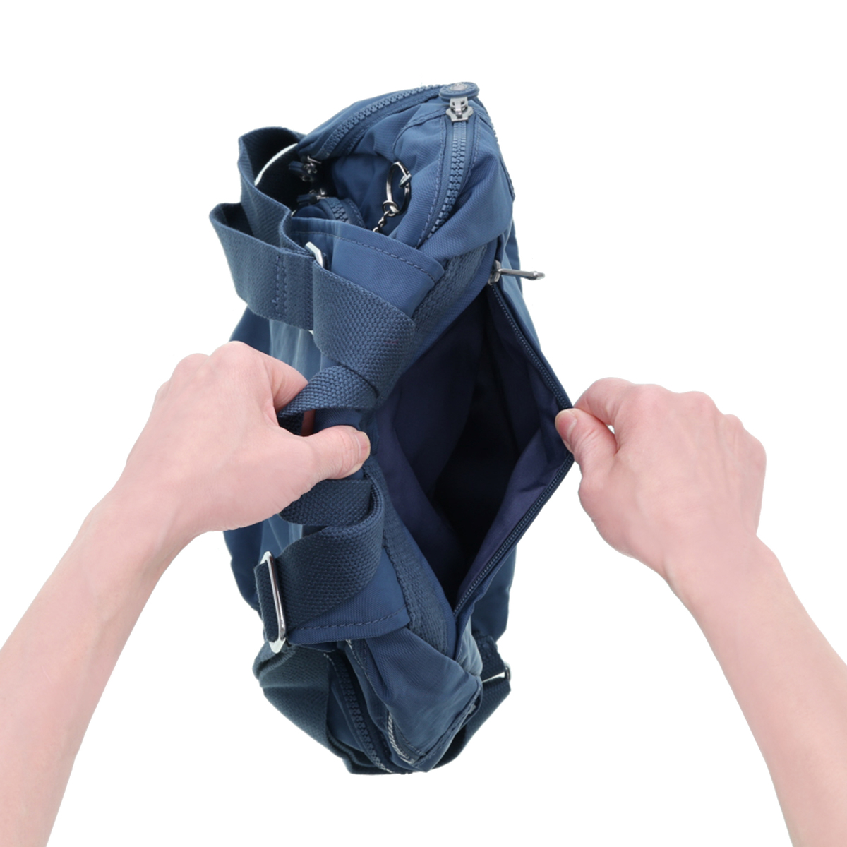 [サイズ(約)] 縦34×横35(最大)×マチ17.5cm ショルダーベルト長さ:45〜83cm ハンドル立ち上り8cm [重量(約)]※付属品含む 480g [素材] ナイロン ※裏地有 [仕様] 付属(取り外し可):チャーム×1 開閉:かぶせ蓋マグネット式+ファスナー式 底ビョウ:無 [ポケット] <内側> ファスナーポケット×1、オープンポケット×1、ペン挿し×2、 キーフック×1(メイン収納内) <外側> (前面)ファスナーポケット×1、オープンポケット×1 (サイド)ファスナーポケット×2 (後面)ファスナーポケット×1 [注意事項] ※直射日光や蛍光灯の影響で変色することがありますのでご了承ください 【カジュアルブルー:インドネシア製、ソフトサンド、ブラックエンボス:中国製】