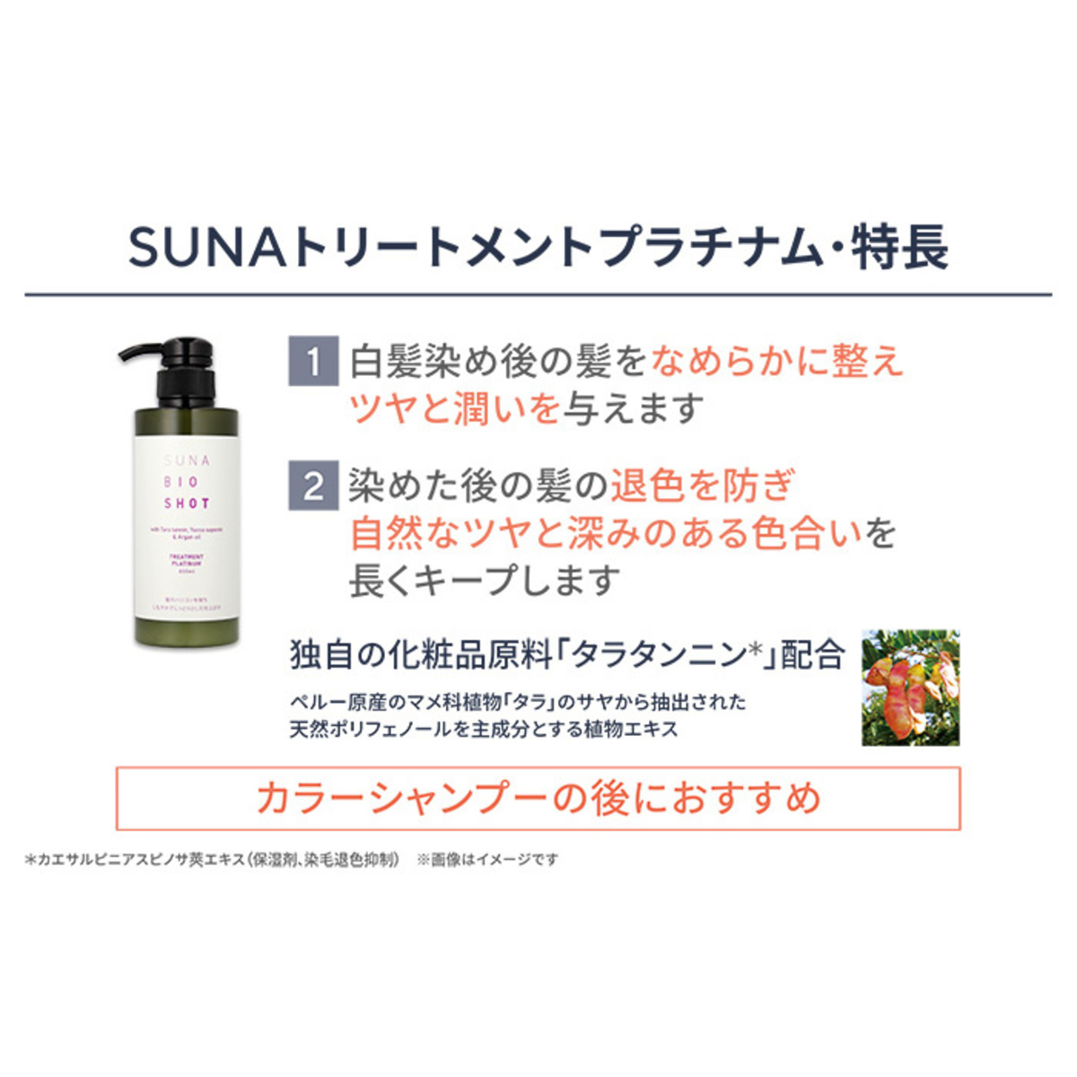 [商品内容] ・SUNA トリートメント PT 400ml×2 ・SUNA リペアシャンプーOZ 8ml パウチ (プレゼント) ・SUNA トリートメント PT 8ml パウチ(プレゼント) [使用方法] <トリートメント> シャンプー後、水気を軽くきってから適量を手に取り髪全体に馴染ませた後、丁寧に洗い流してください [注意事項] ※お肌に合わないときは、ご使用をおやめください ※使用中や使用後に赤み、はれ、かゆみ、刺激等の異常が現れた時は、使用を中止し、皮膚科専門医等へご相談されることをおすすめします ※傷、はれもの、湿疹等異常のある部位にはお使いにならないでください ※乳幼児の手の届かないところに保管してください ※極端に高温又は低温の場所、直射日光のあたる場所には保管しないでください ※天然由来成分を配合していますので、変色や沈殿が生じる場合がございますが、製品の品質には問題ございません 【日本製】 [成分] トリートメント:水、パルミチン酸エチルヘキシル、セテアリルアルコール、ジメチコン、グリセリン、水添ナタネ油アルコール、カエサルピニアスピノサ莢エキス、ユッカシジゲラ茎エキス、キラヤ樹皮エキス、ラベンダー油、ローズマリー葉油、アルニカ花エキス、キュウリ果実エキス、セイヨウキズタ葉/茎エキス、ゼニアオイ花エキス、パリエタリアエキス、セイヨウニワトコ花エキス、サンザシエキス、ナツメ果実エキス、グレープフルーツ果実エキス、リンゴ果実エキス、 オレンジ果汁、レモン果汁、ライム果汁、アルガニアスピノサ核油、ケラチン(羊毛)、(メタクリル酸グリセリルアミドエチル/メタクリル酸ステアリル)コポリマー、ジラウロイルグルタミン酸リシンNa、ダイマージリノール酸ダイマージリノレイル、トリ(カプリル酸/カプリン酸)グリセリル、ヒドロキシエチルセルロース、ステアルトリモニウムクロリド、ベヘントリモニウムクロリド、アモジメチコン、乳酸、BG、PG、イソペンチルジオール、イソプロパノール、ペンテト酸5Na、フェノキシエタノール シャンプー パウチ:水、ラウロイルメチルアラニンNa、コカミドプロピルベタイン、コカミドDEA、ペンチレングリコール、ラウロイルアスパラギン酸Na、セテアレス-60ミリスチルグリコール、カエサルピニアスピノサ莢エキス、キラヤ樹皮エキス、ユッカシジゲラ茎エキス、ローズマリー葉油、ラベンダー油、アルニカ花エキス、キュウリ果実エキス、セイヨウキズタ葉/茎エキス、ゼニアオイ花エキス、 パリエタリアエキス、セイヨウニワトコ花エキス、サンザシエキス、ナツメ果実エキス、グレープフルーツ果実エキス、リンゴ果実エキス、オレンジ果汁、レモン果汁、ライム果汁、コカミドMEA、ジラウロイルグルタミン酸リシンNa、(メタクリル酸グリセリルアミドエチル/メタクリル酸ステアリル)コポリマー、ポリクオタニウムー10、 グリセリン、エチルヘキシルグリセリン、BG、イソペンチルジオール、PG、塩化Na、クエン酸、クエン酸Na、ペンテト酸5Na、フェノキシエタノール