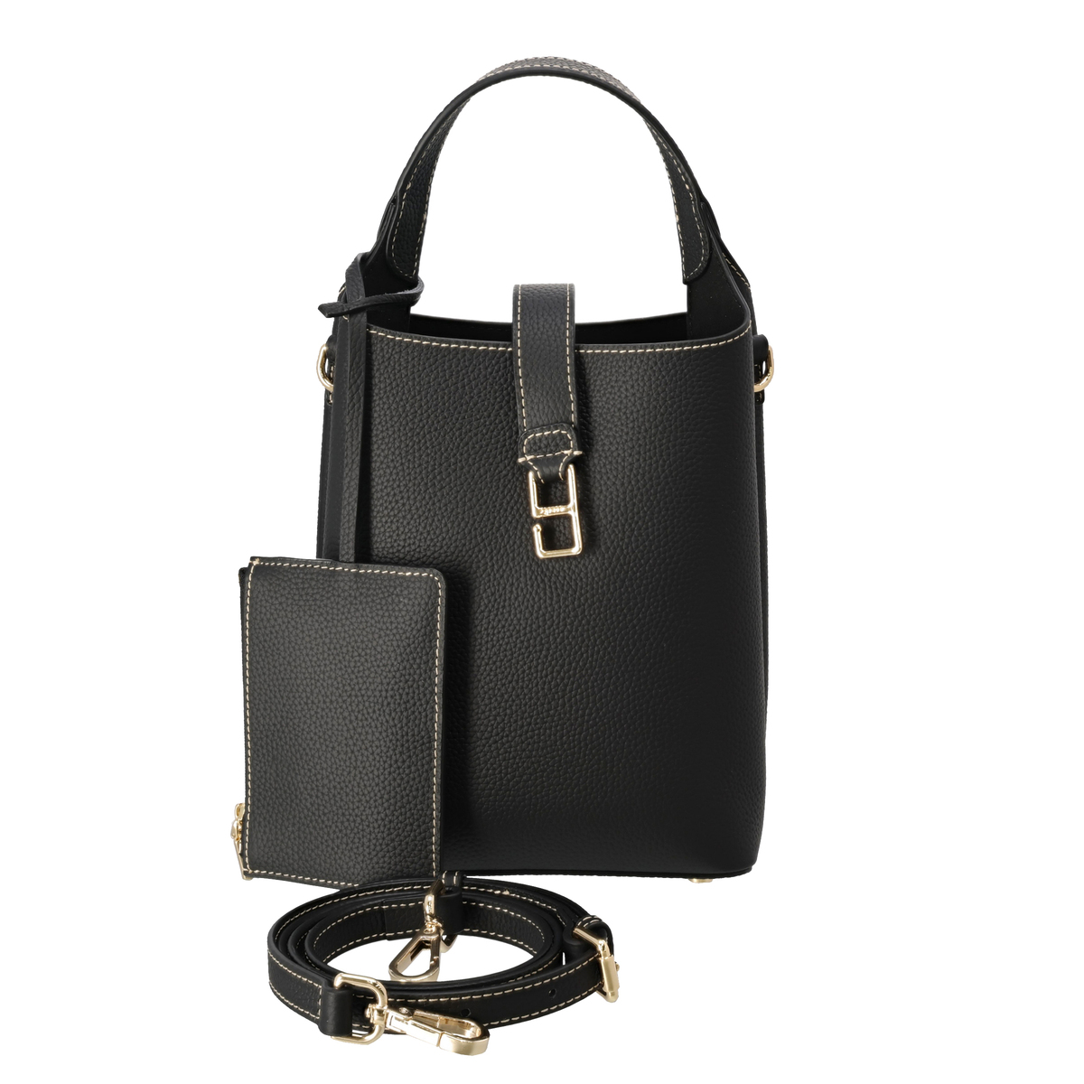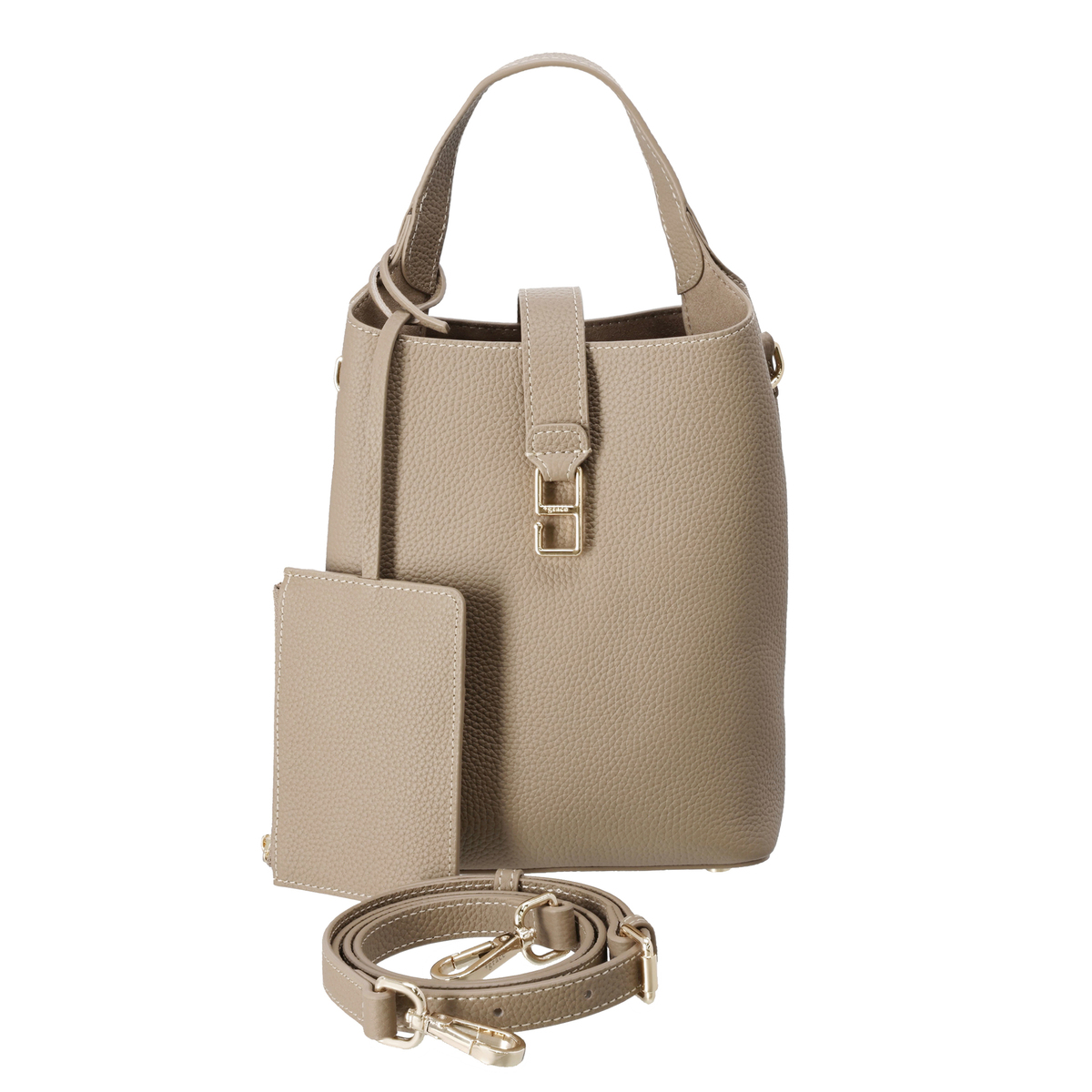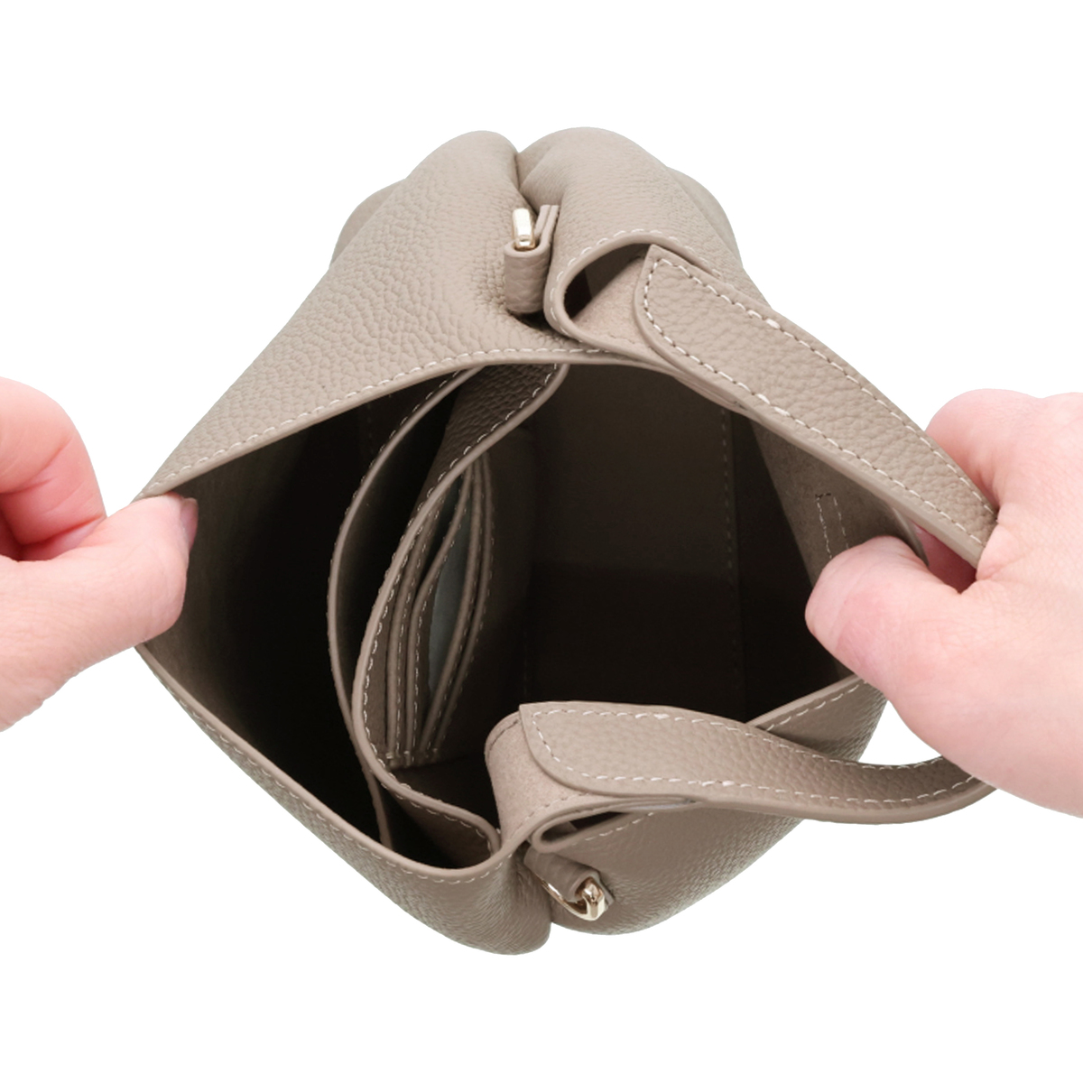 [サイズ(約)] 縦20×横17×マチ8.5cm ハンドル立ち上がり:11cm ショルダー立ち上がり:50〜58cm [重量(約)]※付属品含む 420g [素材] 表地:牛革 持ち手、ショルダーストラップ:牛革 ※裏地有 [仕様] 付属(取り外し可):ショルダーストラップ×1、スリムパース×1、巾着袋×1 開閉:フラップ式隠しマグネット式 底ビョウ:有 [ポケット] <ポシェット> 内側:中央仕切り兼オープンポケット×1、カード入れ×4 外側:無 <スリムパース> [サイズ(約)] 縦8.0×横12.0cm [ポケット] ファスナーポケット×1、カード入れ×3、オープンポケット×1 【中国製】 [注意事項] ※摩擦や水濡れ等により、色落ちし、衣類などへ色移りする場合がございます。薄い色の洋服との組み合わせや雨の日のご使用は十分にご注意ください ※著しく重いものや、鋭利なものを入れた場合、通常のご使用でも型崩れを起こしたり、付属品及び製品が破損する恐れがありますので、お取り扱いにはご注意ください ※ファスナー・ホック・ボタン・金具・ストラップベルト等の付属品は正しくご使用ください。誤った使用をされた場合、もしくは極度の負担がかかった場合は、付属物及び製品が破損することがありますので、お取り扱いにはご注意ください ※水分やアルコールを含む製品(香水、ウエットティッシュなど)や油分を含む製品(化粧品など)に直接触れないようご注意ください <磁石を使用した製品について> ※磁石を飲み込んでしまった場合、重大事故につながる恐れがありますので、小さなお子様やペットの手の届かないところに保管してください ※万が一磁石を誤飲した場合は、直ちに医師の診察を受けてください ※マグネット近くに磁気カードなどを近づけると磁気データが消えてしまうことがあります <革製品のお手入れ方法及び保存方法> ※日常のお手入れとして、使用後はブラシでホコリや汚れを払ってください ※濡れた場合は、乾いたやわらかい布で手早く水気を取り、風通しの良い場所で陰干ししてください ※素材に合ったクリーナーやクリーム等を説明書に従って使用してください ※直射日光、高温な場所、湿度の高い場所での保管は、退色、色落ち、変形、型崩れ、質感の変化の原因となりますので、お避け下さい <防カビ剤が入っている場合> ※使用する製品にワサビの香りが移ることがありますが、袋から出し通気性の良い場所に置くことで香りは軽減されます