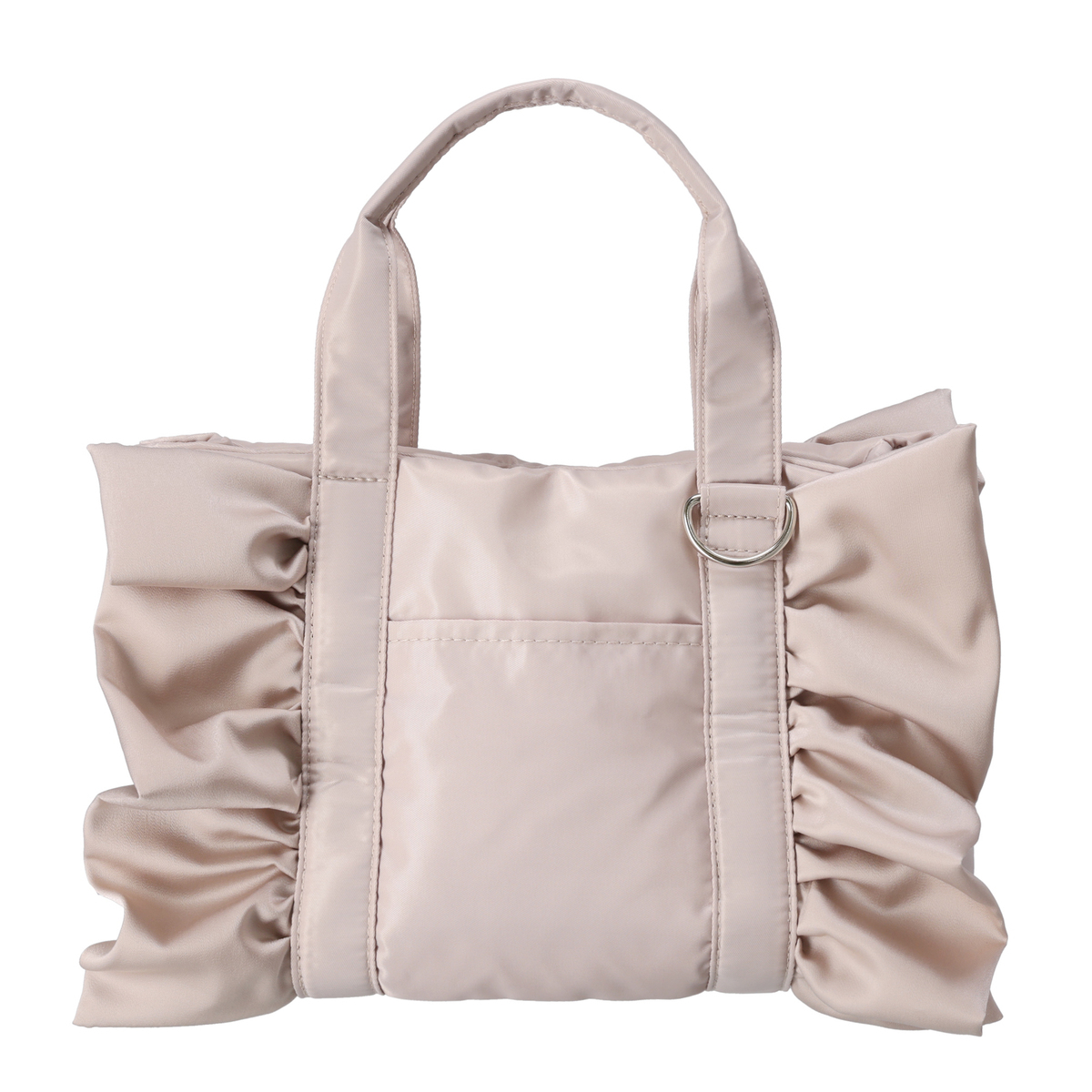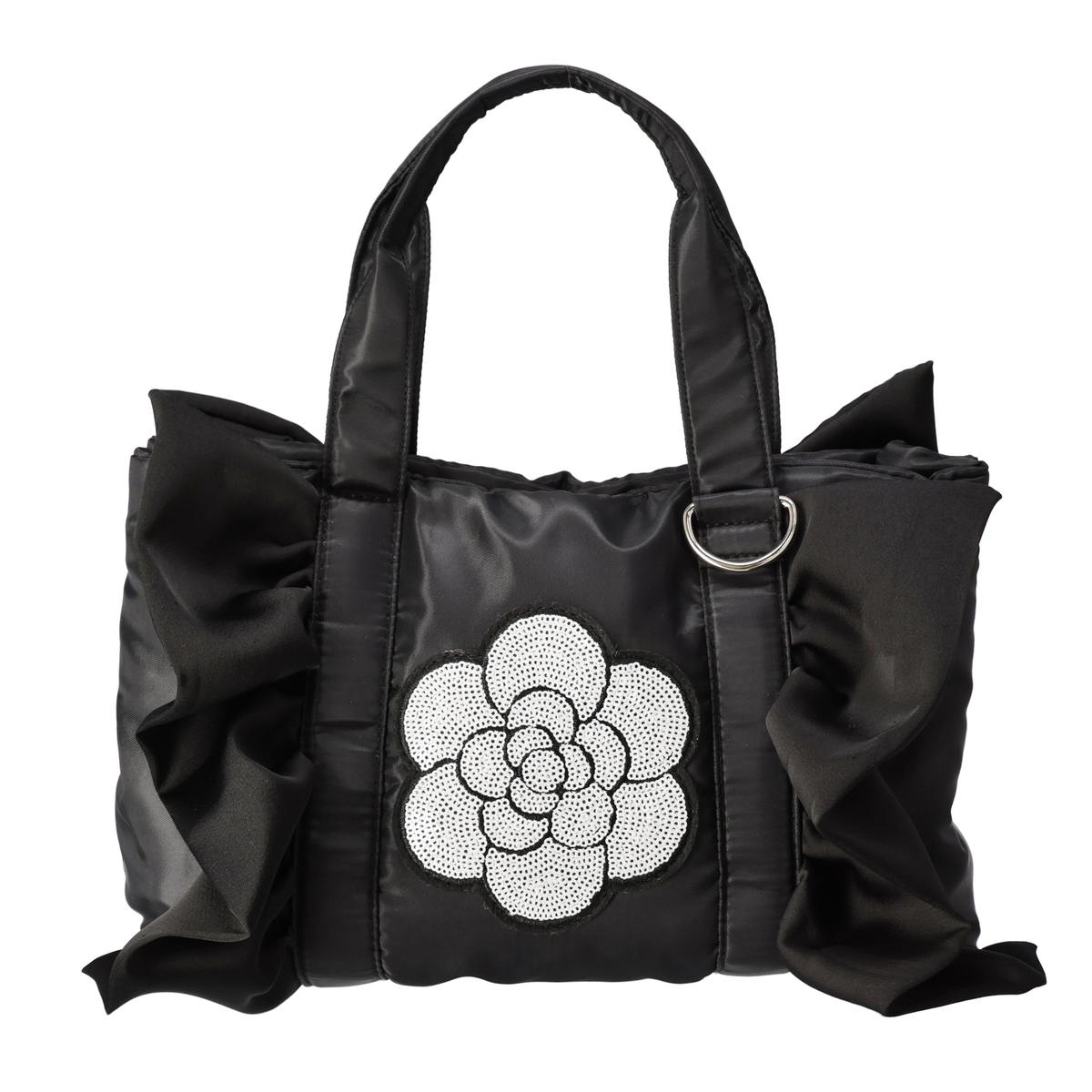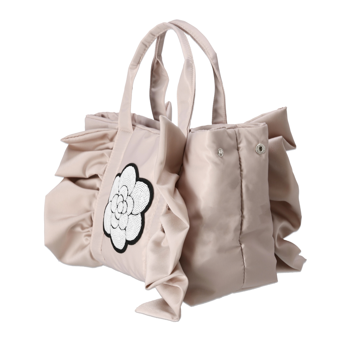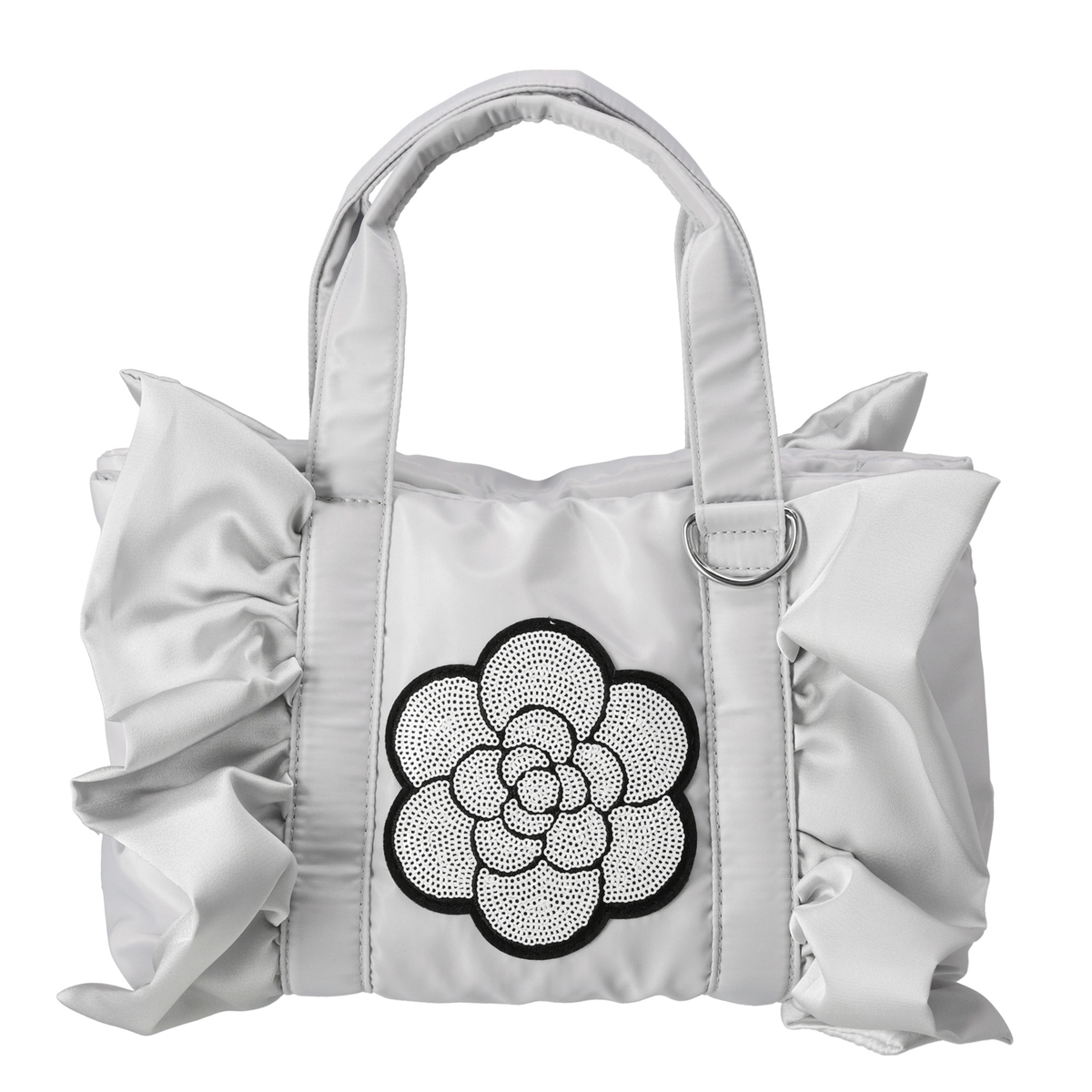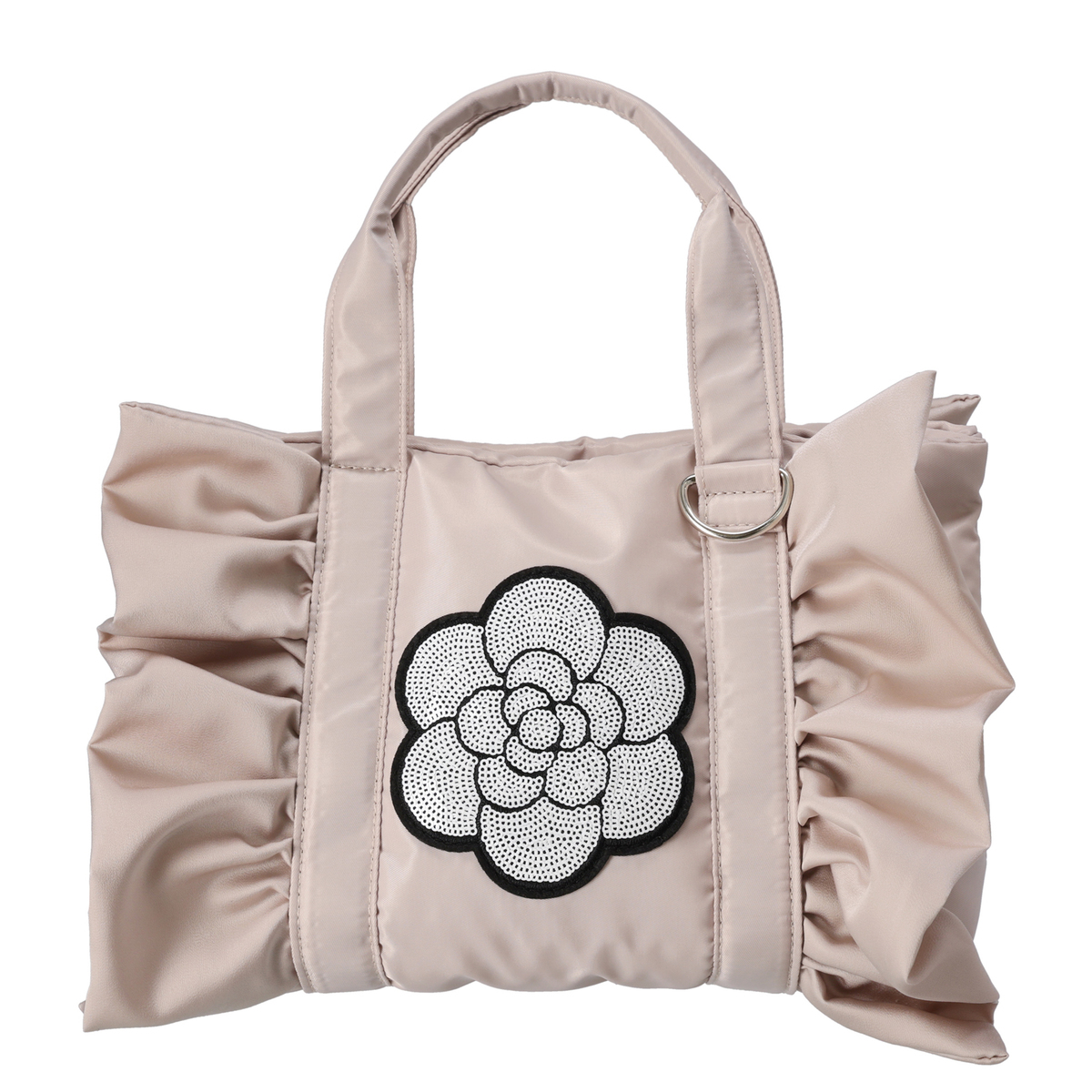 大人可愛いデザインのふりるトートバッグ。フロントのスパンコールを施した大きなカメリアがポイントです