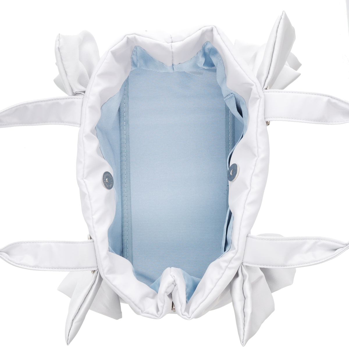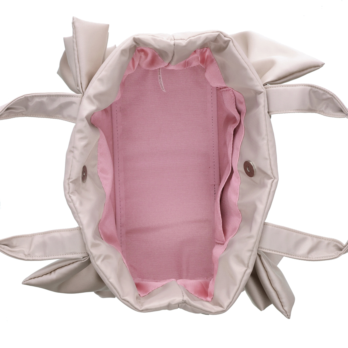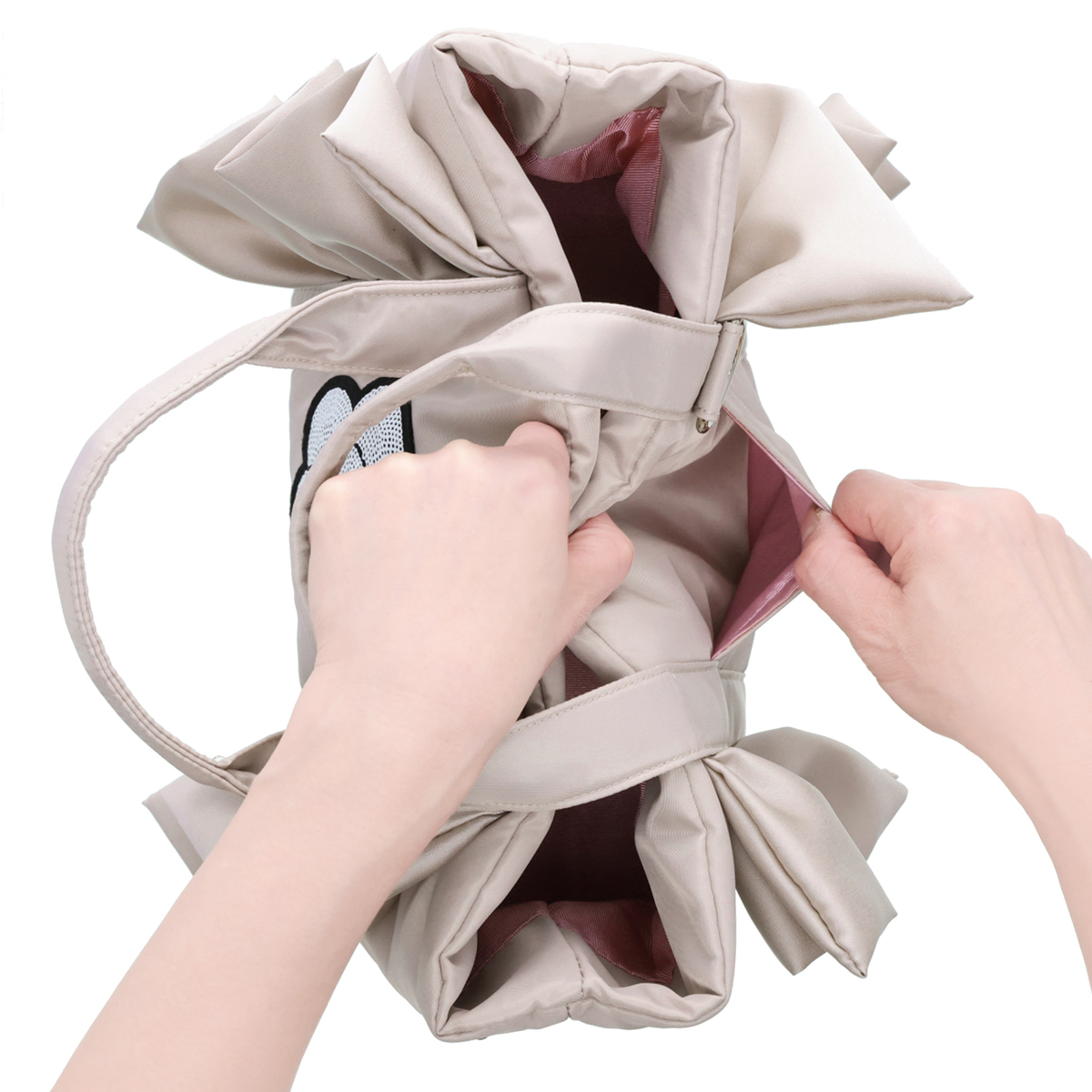 マチがしっかりあるので置いたときに倒れにくく、荷物が整理しやすい仕様。両サイドには荷物の量に合わせて留められるスナップボタン付きです