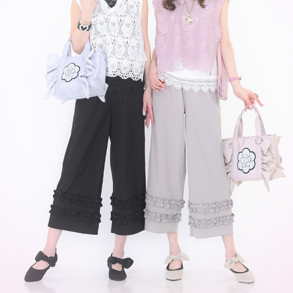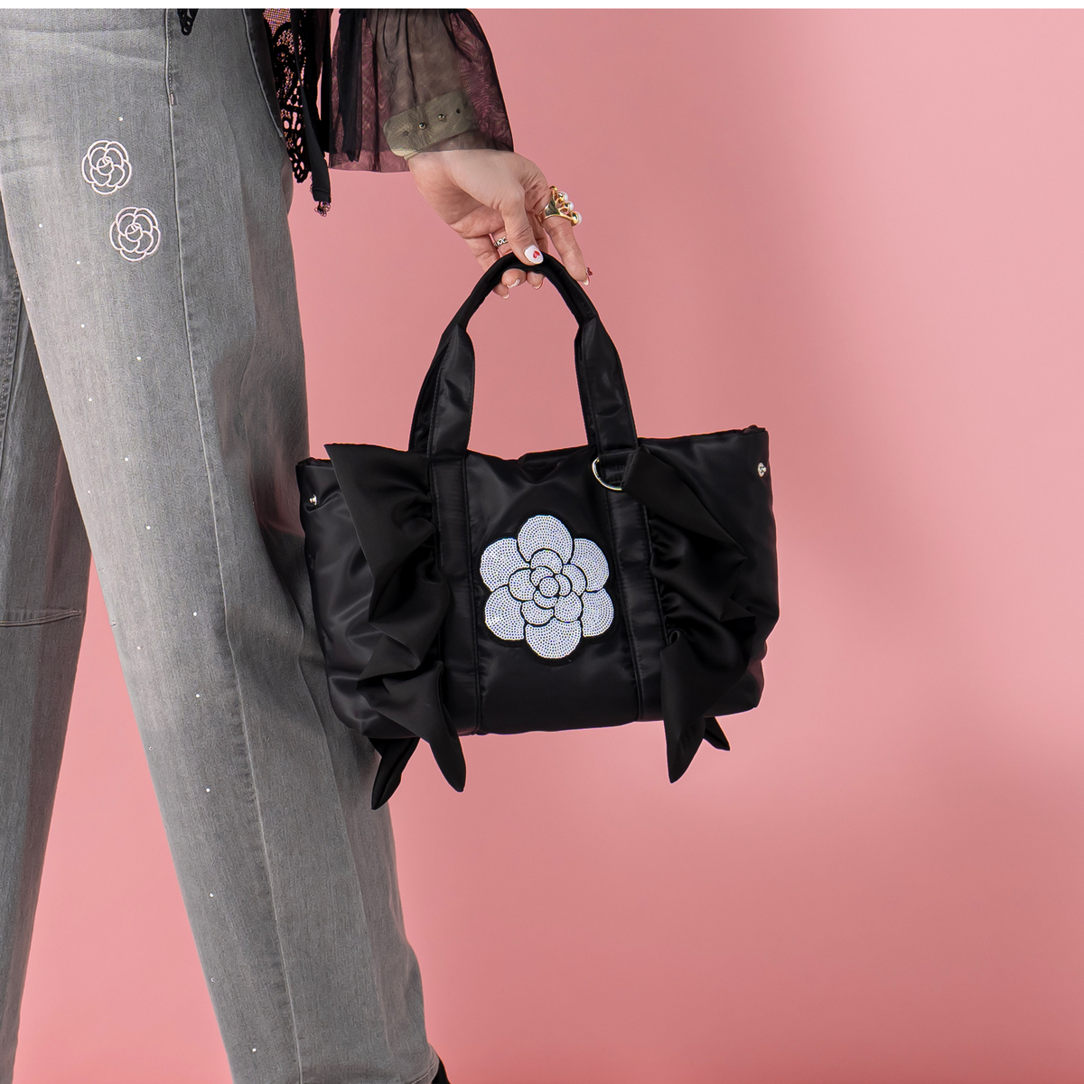 大人可愛いデザインのふりるトートバッグ。フロントのスパンコールを施した大きなカメリアがポイントです