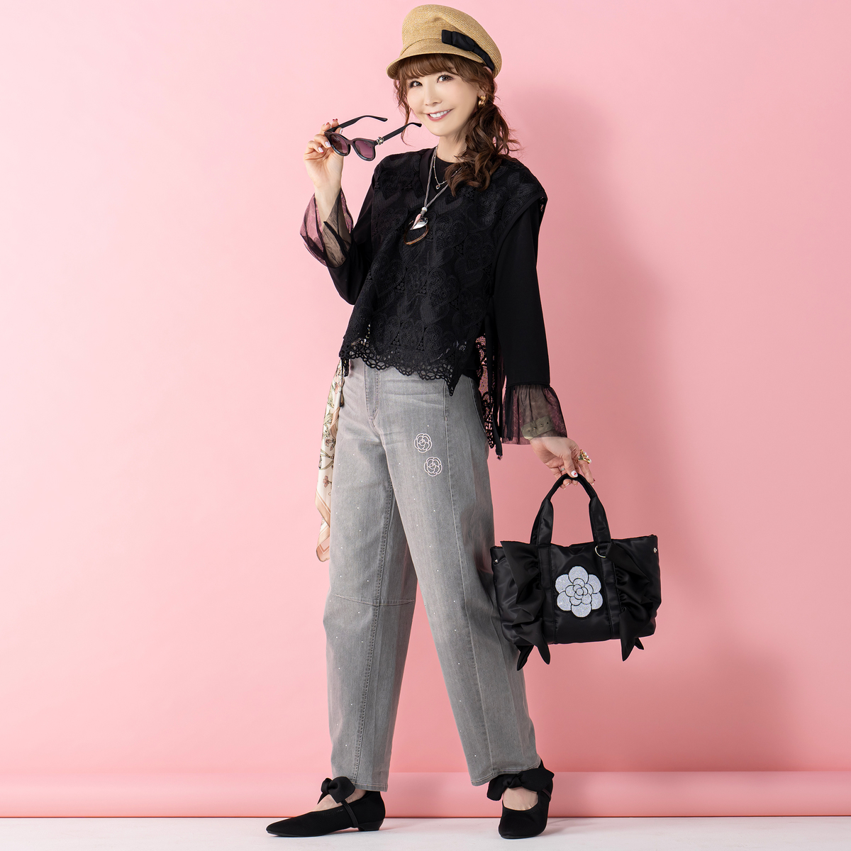 ブラックを購入しました。小ぶりのバッグだけど、思った以上にによく入ります。カメリアにフリルがかわいい。肩掛けも何とかできます。60代たけど、ブラックだから無難に持てますね。