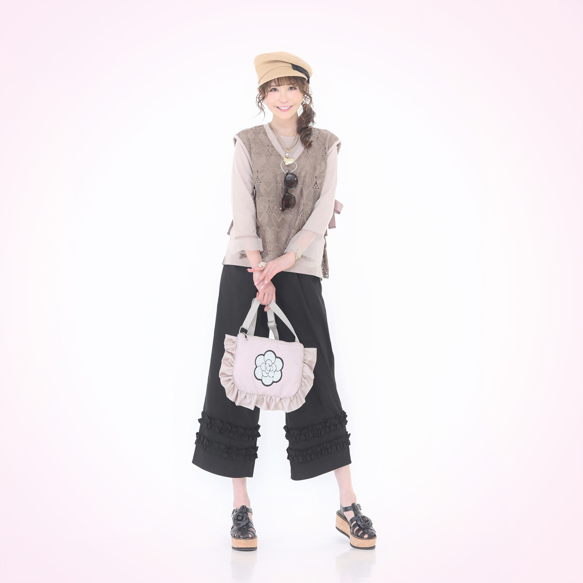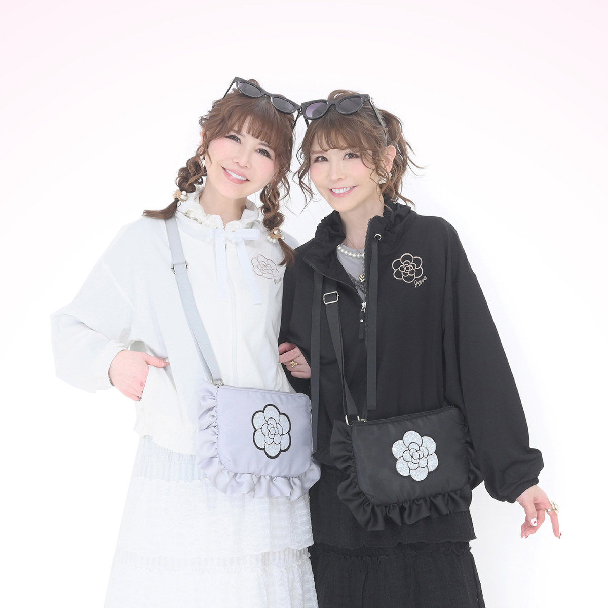 大人可愛いデザインのふりるポシェット。フロントのスパンコールを施したカメリアモチーフがポイントです