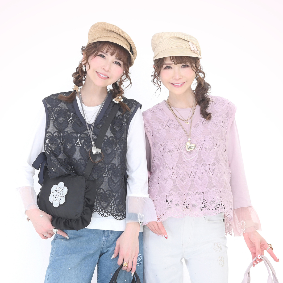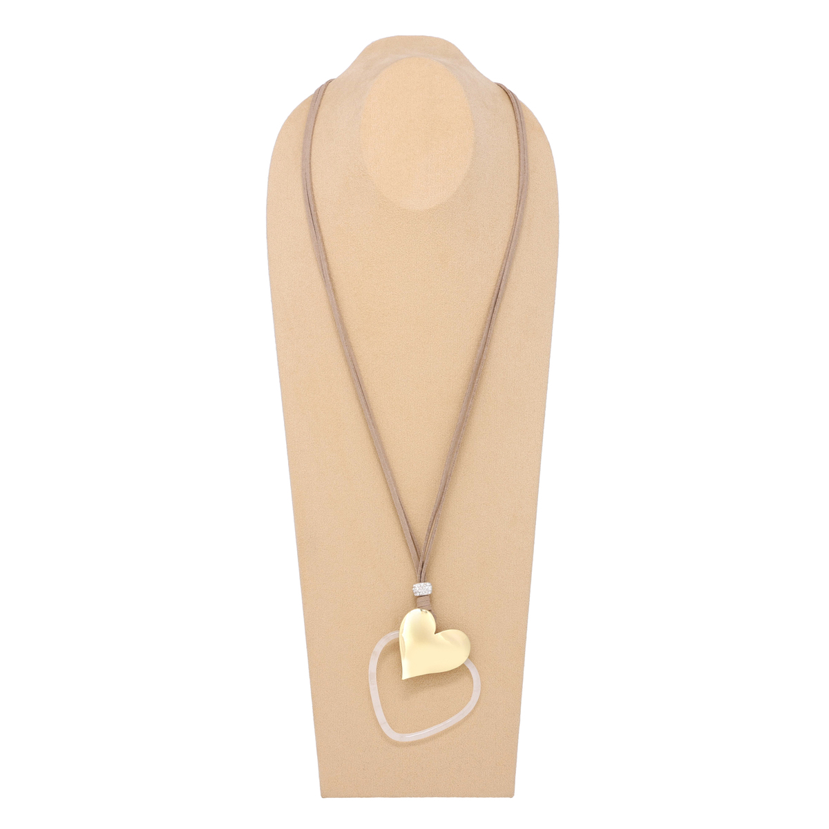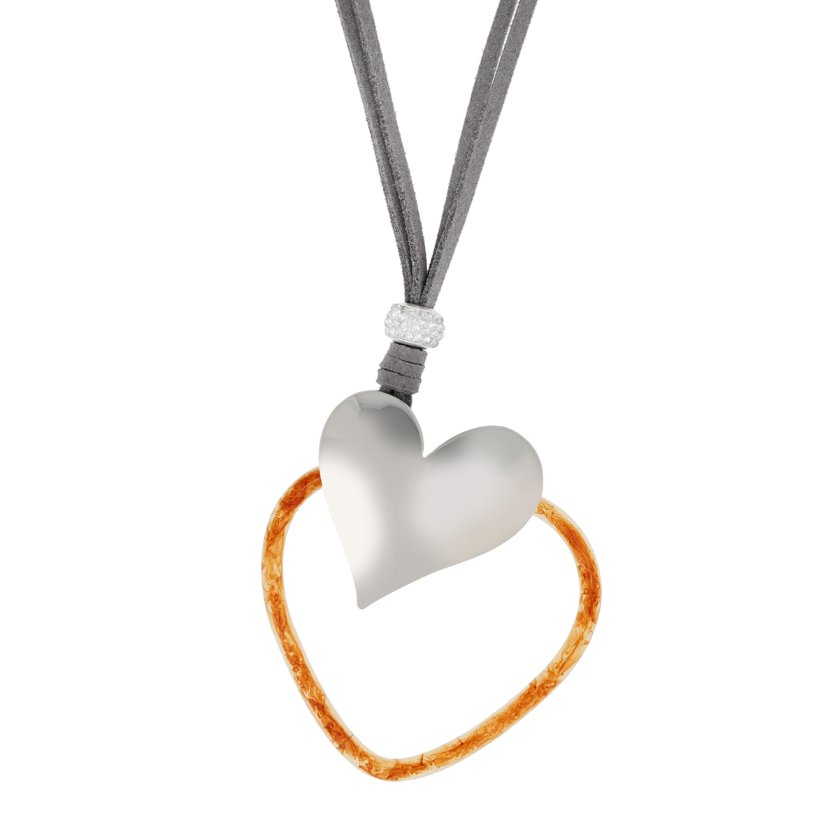 異素材のハートを重ねたデザインが映えるネックレス。アクリル樹脂の抜きハートとメタルハートを組合せた上品なデザインが視線を引き付けます。紐はスライド式で長さ調整ができ、付け根のラインストーンがカジュアルな中に上品なきらめきを添えます