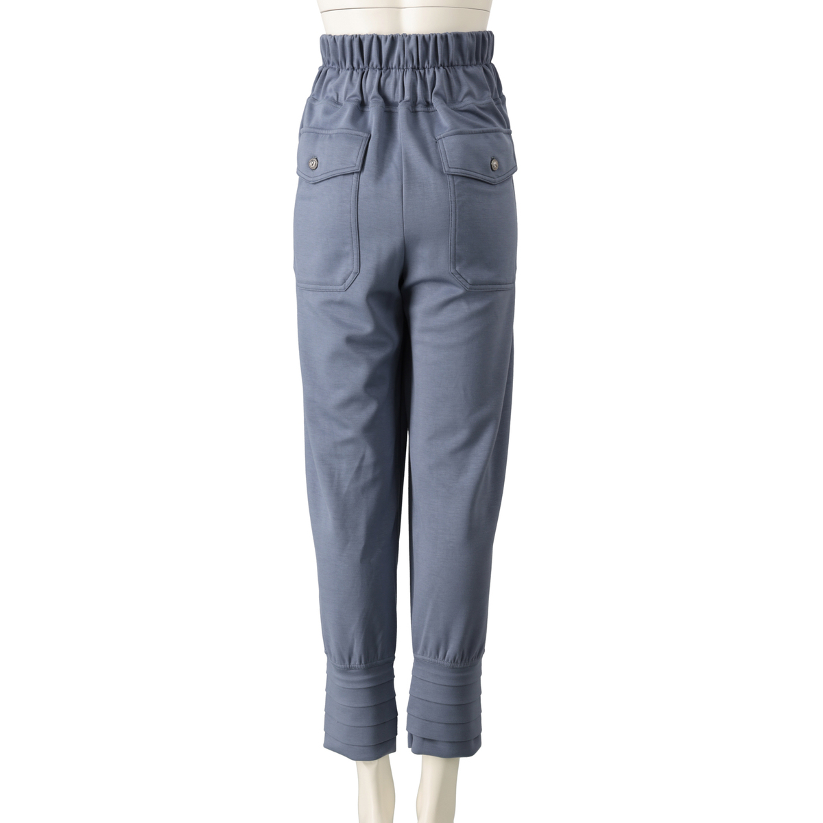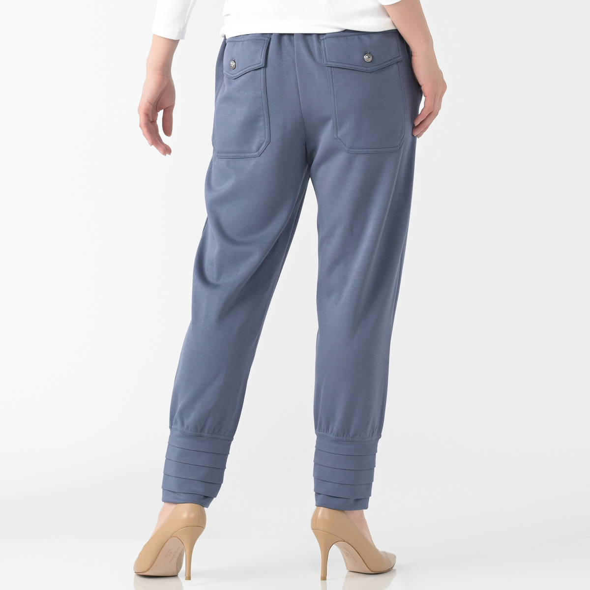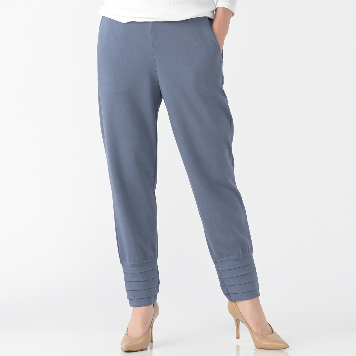 裾にタックを施したテーパードシルエットのパンツ。穿き心地の良いソフトダンボールニットを使用しました