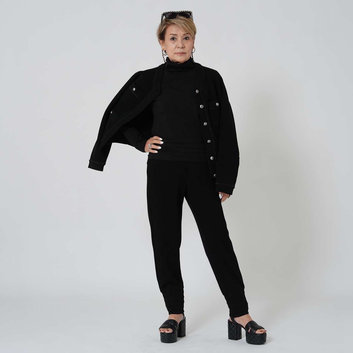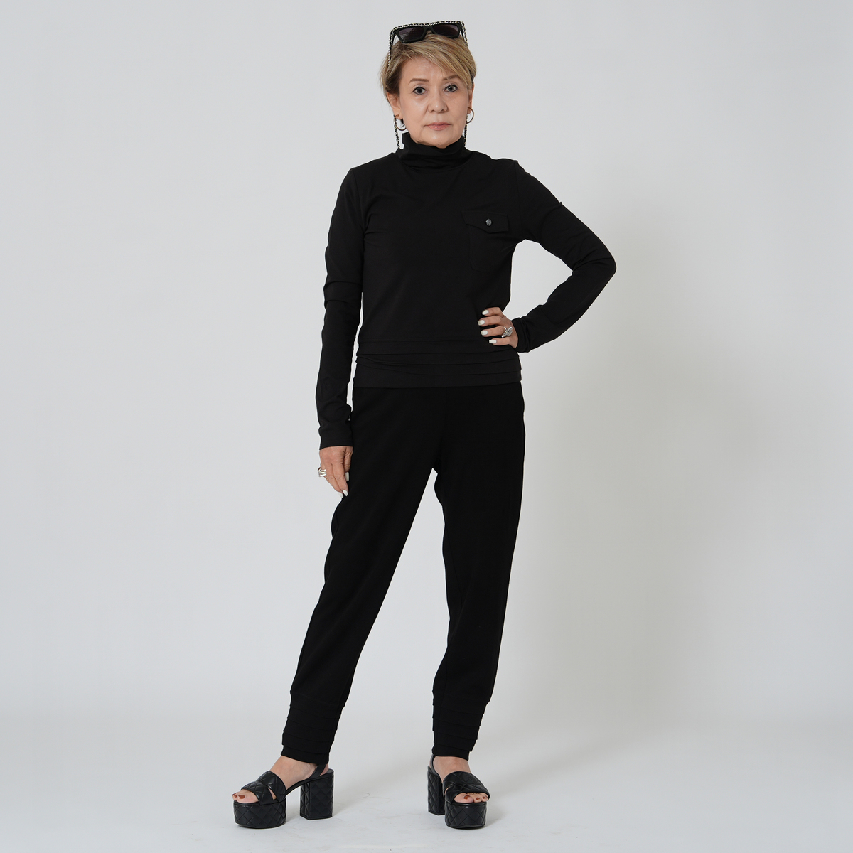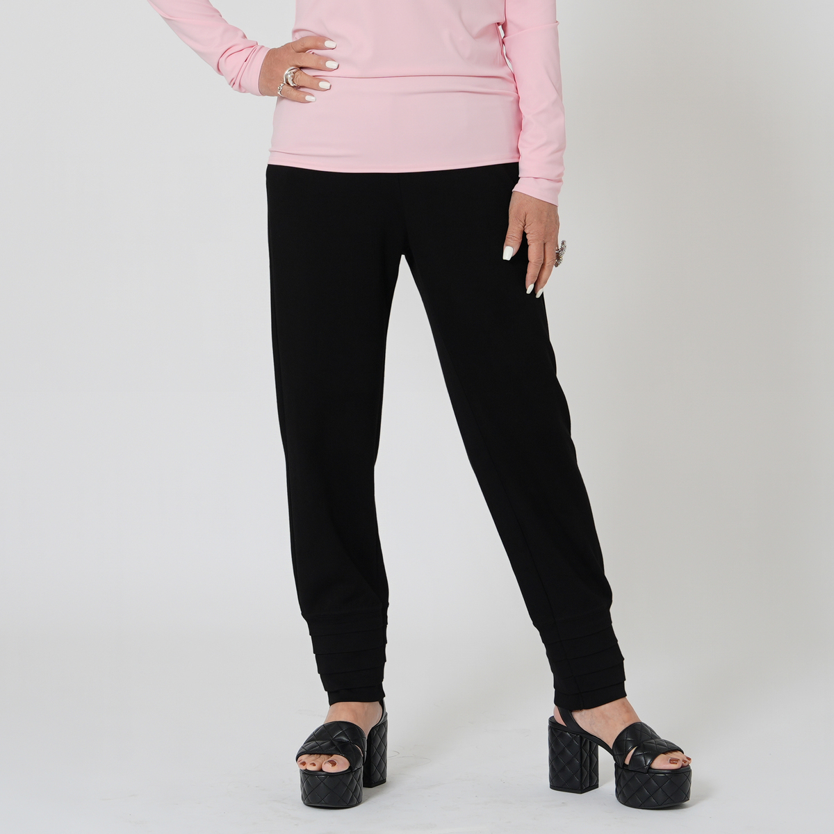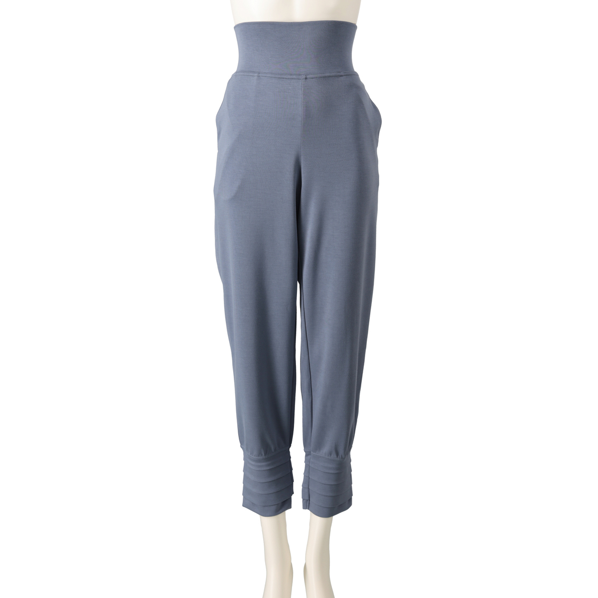 裾にタックを施したテーパードシルエットのパンツ。穿き心地の良いソフトダンボールニットを使用しました