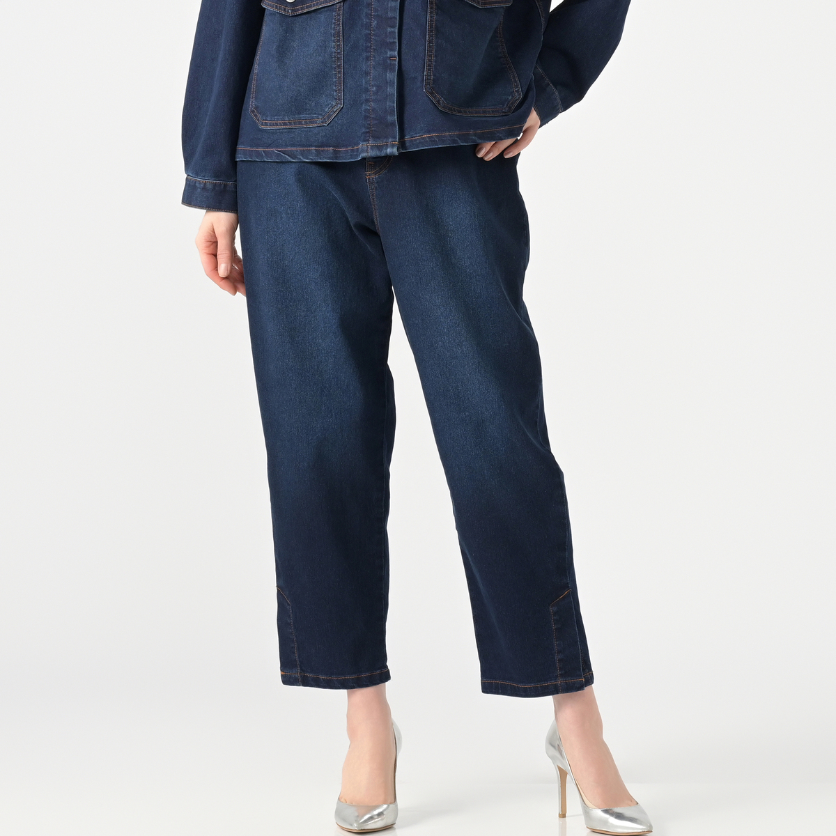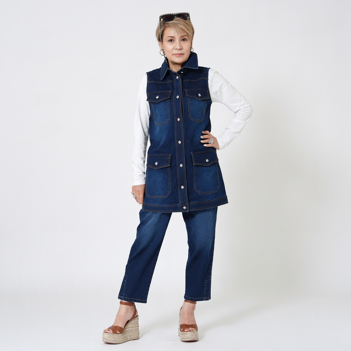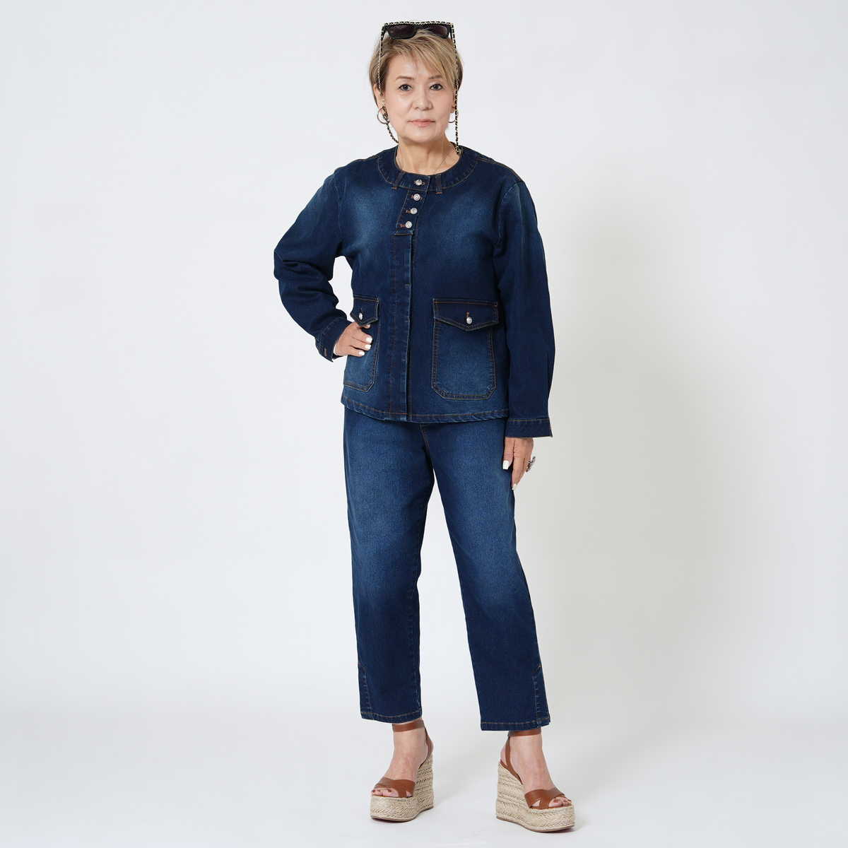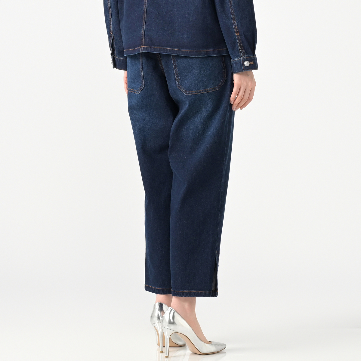 足元をすっきり見せてくれる、ストレッチデニムのアンクル丈パンツ。洗い加工とブラスト加工が施され、こなれ感のある表情に。セットアップも楽しめ、コーディネートが広がります