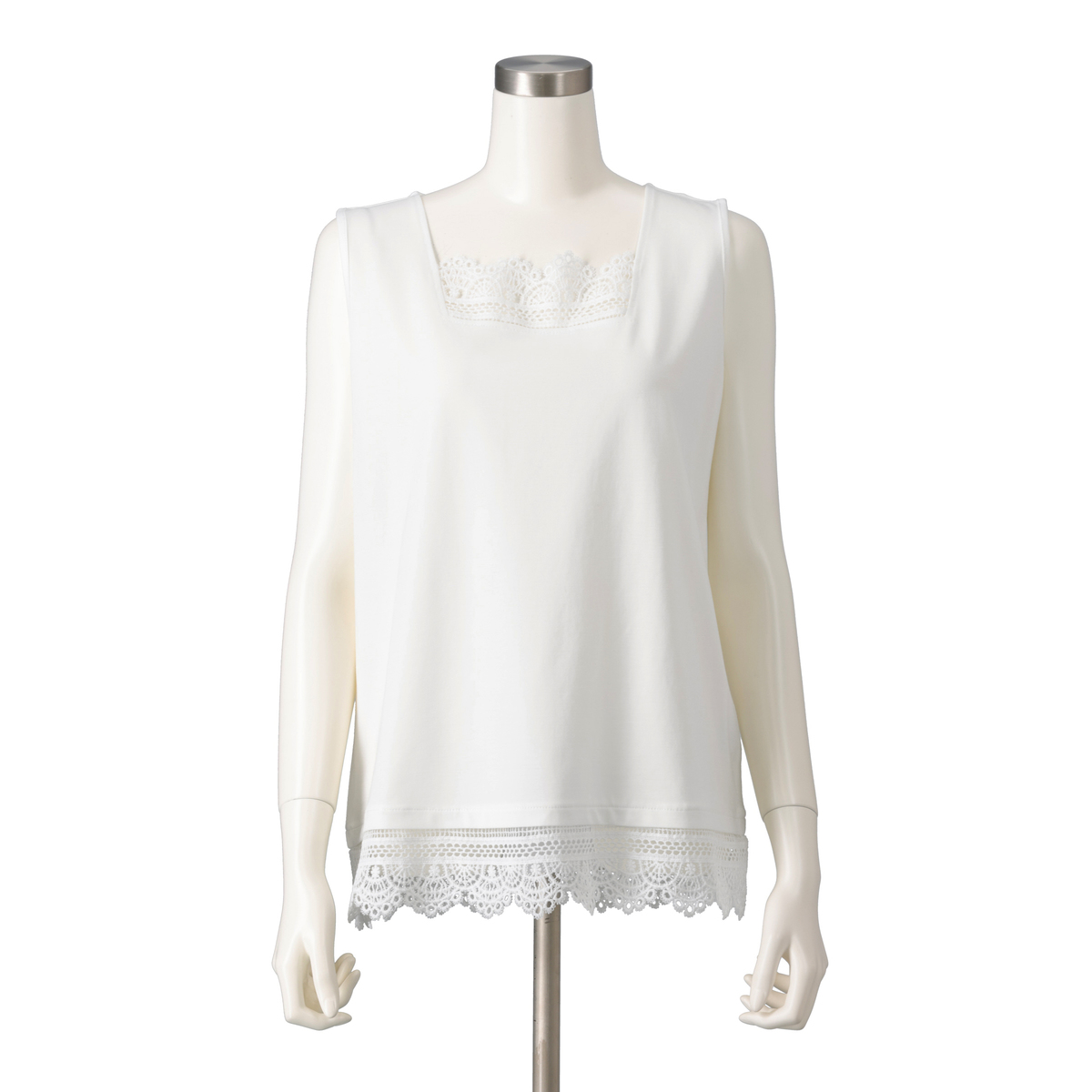 胸元と裾にスカラップレースをあしらい、お顔まわりやデコルテをきれいに演出。レースがちらりと覗くことで上品なアクセントとなり、レイヤードスタイルや様々なアイテムと合わせて幅広いコーデを楽しめます