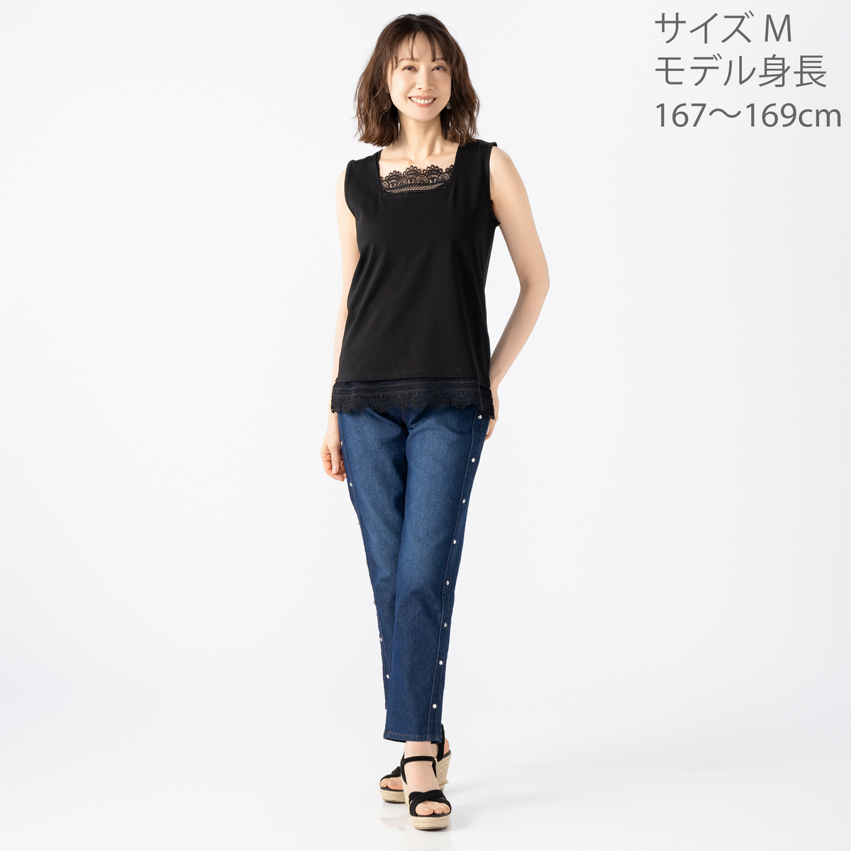 [商品寸法(ヌード)cm] サイズ バスト 着丈 肩幅 S:84(72〜80) 59 33 M:90(79〜87) 60 34 L:96(86〜94) 61 35 LL:102(93〜101) 62 36.5 3L:109(100〜108) 63 38 [素材] 本体:レーヨン62% ナイロン30% ポリウレタン8% レース部分:ポリエステル100% [お手入れ] 洗濯機洗い可 [注意事項] ※商品寸法の誤差は多少発生します。ご了承下さい ※洗濯時はネットを使用して下さい ※素材の特性上、洗濯や摩擦により表面が毛羽立ち白化する恐れがあります。ご注意下さい ※白、淡色を含む製品は、蛍光増白剤の入っている洗剤を使用しないで下さい。濃色の場合は、汗や雨などで濡れた状態や強い摩擦等で他の製品に色移りする場合がありますのでご注意下さい ※他の物と分けて洗濯後、すぐに形を整えて干して下さい ※アイロンは当て布を使用して掛けて下さい ※レース部分アイロン禁止 ※着用時の摩擦や洗濯により表面が毛羽立ち、毛玉が発生することがあります。毛玉は市販の毛玉取り器などで処理して下さい ※レース部分が引っ掛かり易いです ※着用・取り扱い時には、アクセサリーやバッグの金具等、引っ掛かり易い物にはご注意下さい ※ピリングとは、繊維の表面が着用中に摩擦されたり、静電気の影響で毛羽立ち、毛羽どうしが絡み合い、次第に大きくなって出来る毛玉のことです。これは風合いのソフトなものほど発生し易く、素材の性質上完全に防止する事の出来ない現象です ※ピリングが出来ましたら、無理に引っ張って取らず、早いうちにハサミでひとつひとつカットするか、毛玉取器をご使用下さい。手でむしり取ると、すぐ後からピリングとなったり、風合いが悪くなる恐れがあります 【中国製】