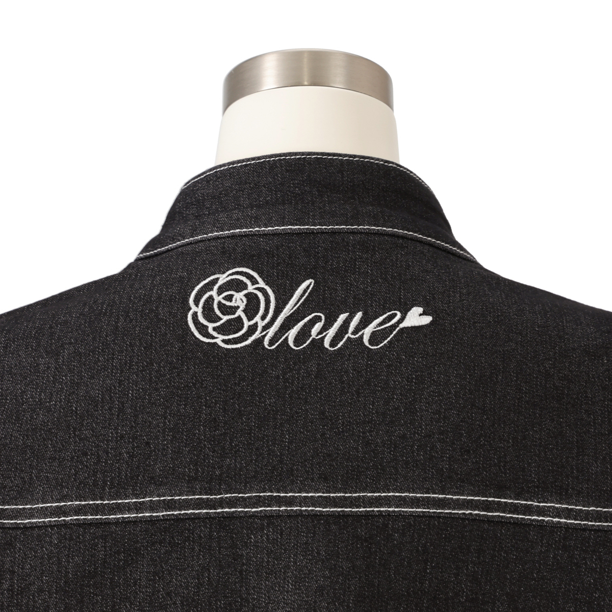 胸切り替え位置を高く設定することで視線が上がり、スタイルアップ効果が期待できます。衿はピンと立つ美しいフォルムで、後ろ中心部分にはカメリアとロゴ刺繍が施されています。裾がやや短めなので、どんなボトムスにもバランス良く合わせやすいデザインです
