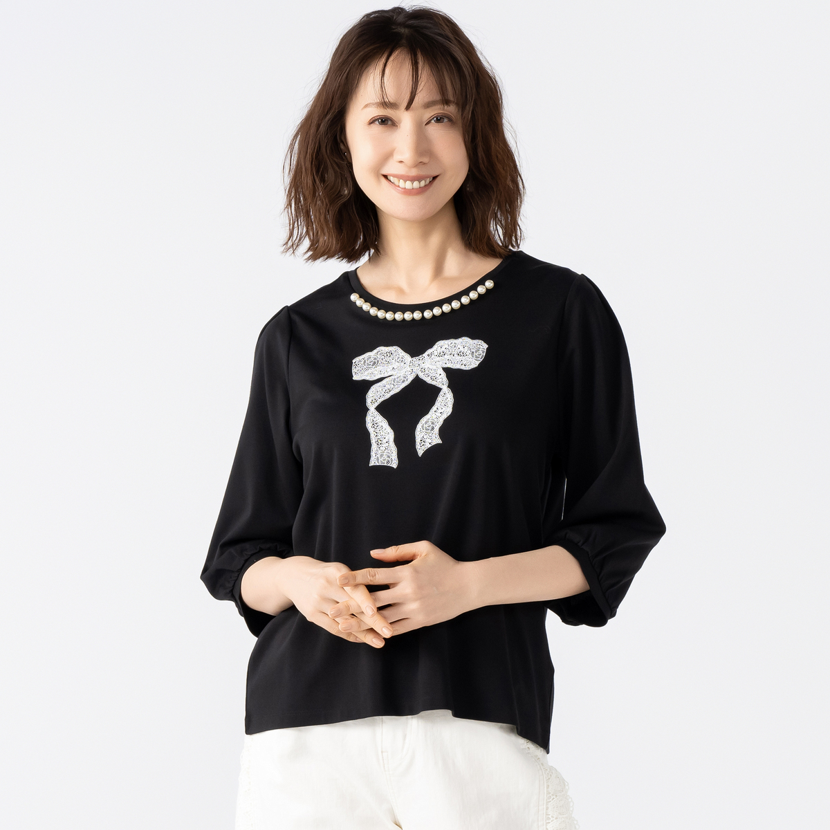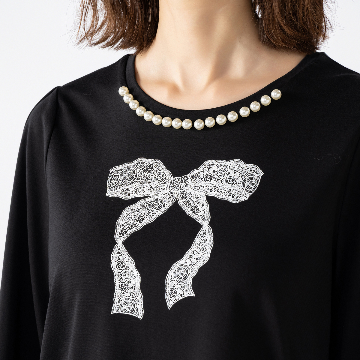 No. 752330 &LOVE パール調ビジューのレースリボンプリントトップス