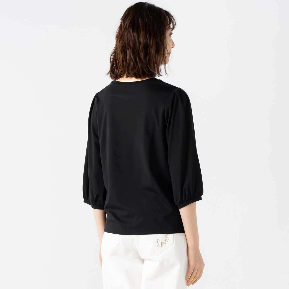 この生地感好きです。158㎝バストCカップ通常Mです。サイズ表記の肩幅いつもより大きめですね。ゆったりめのMって感じです。接触冷感みたいにヒンヤリします。首元のパールも綺麗に付いてました。黒なのでパール引き立ちます。⭐︎−1は袖の長さが中途半端で好きじゃない。ひじ上にしてほしいけど、それぞれ好みがあるのでしかたないですよね。