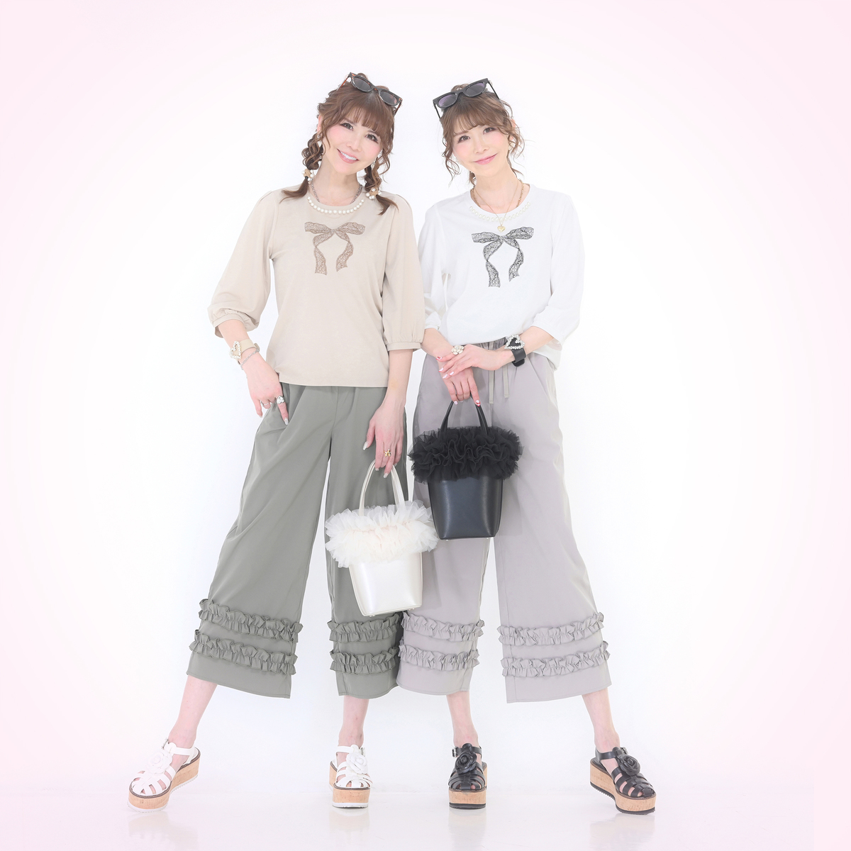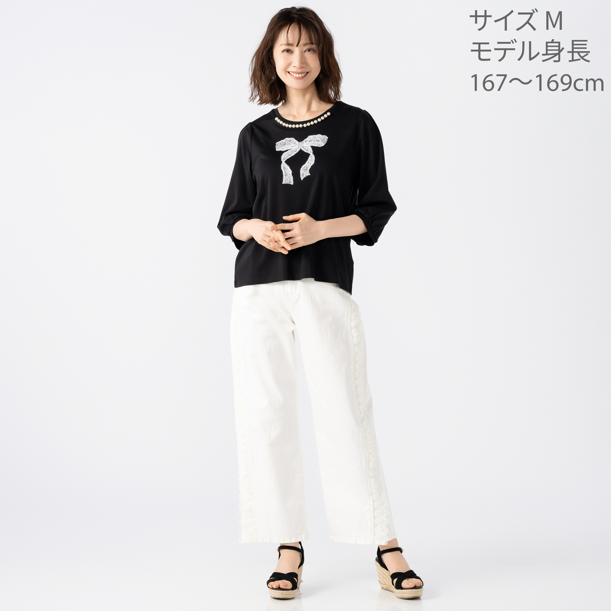 大人に馴染むレースリボンプリントが上品に映えるデザイン。色によってラバーと顔料を使い分けた単色プリントは甘さがほどよく、衿ぐりにはパール調ビジューを添えて明るい表情に。動くたびにやさしくきらめく仕上がりです