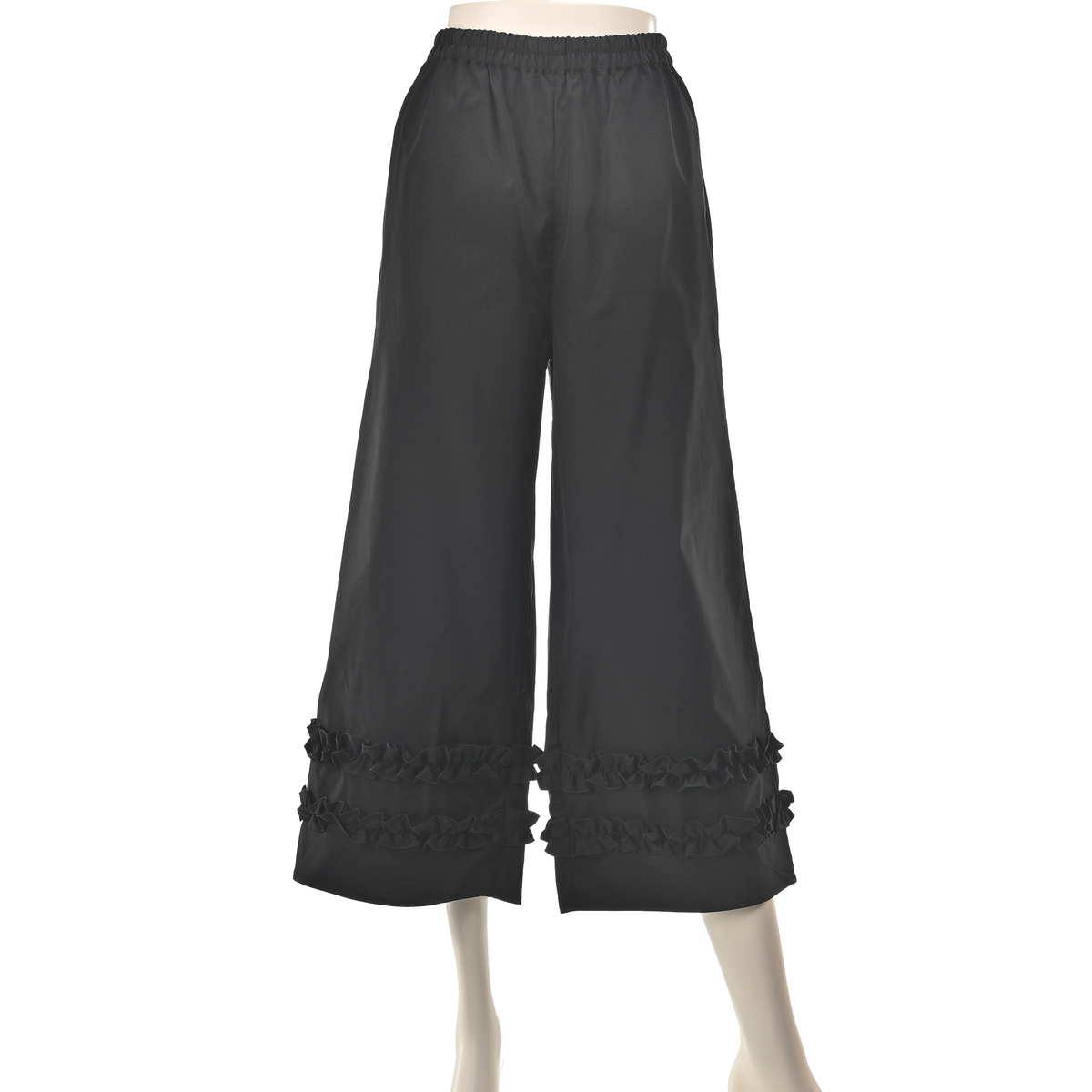 [商品寸法(ヌード)cm] サイズ ウエスト ヒップ 股下 S:65(58〜64) 104(82〜90) 56 M:69(64〜70) 108(87〜95) 56 L:73(69〜77) 112(92〜100) 56 LL:77(77〜85) 116(97〜105) 56 3L:85(85〜93) 124(102〜110) 56 サイズ 前股ぐり わたり幅 S: 32 33 M: 33 34 L: 34 35 LL: 35 36 3L: 36 38 [ウエストゴム] 全体に有 [素材] ポリエステル100% [お手入れ] 洗濯機洗い可 [注意事項] ※商品寸法の誤差は多少発生します。ご了承下さい ※淡色製品には、蛍光増白剤入り洗剤を使用しないで下さい ※洗濯後はすぐに脱水し、形を整えて干して下さい。長時間水につけたままにしないで下さい ※洗濯の際は裏返しにし、洗濯ネットをご使用下さい ※デリケートな素材を使用しておりますので、爪やアクセサリーなどの引っ掛かりによりキズがつきやすくなっております。縫い目や生地を強く引っ張らないようご注意下さい ※濃色商品は、染色の性質上、洗濯すると色落ちする場合があります。また、着用中の摩擦により、他の衣料やバッグ、椅子などに色移りすることがあります。 淡色・白物とは分けて着用・洗濯して下さい ※雨や汗等で濡れた状態で着用すると色移りすることがあります。濡れた場合は早めに洗濯して下さい ※洗濯後は重ね置きをしないで下さい ※アイロンの際は、あて布をご使用下さい ※フリル部分は、スチームアイロンを浮かしながら掛け、形を整えて下さい ※ゴム部分へのアイロンはお避け下さい ※この製品は、撥水加工を施しています。永久的なものではなく、洗濯やクリーニングを繰り返すことで効果は徐々に薄れていきます。洗濯や使用により撥水加工の効果が弱くなった場合は、市販の撥水スプレー等のご使用をおすすめします 【中国製】