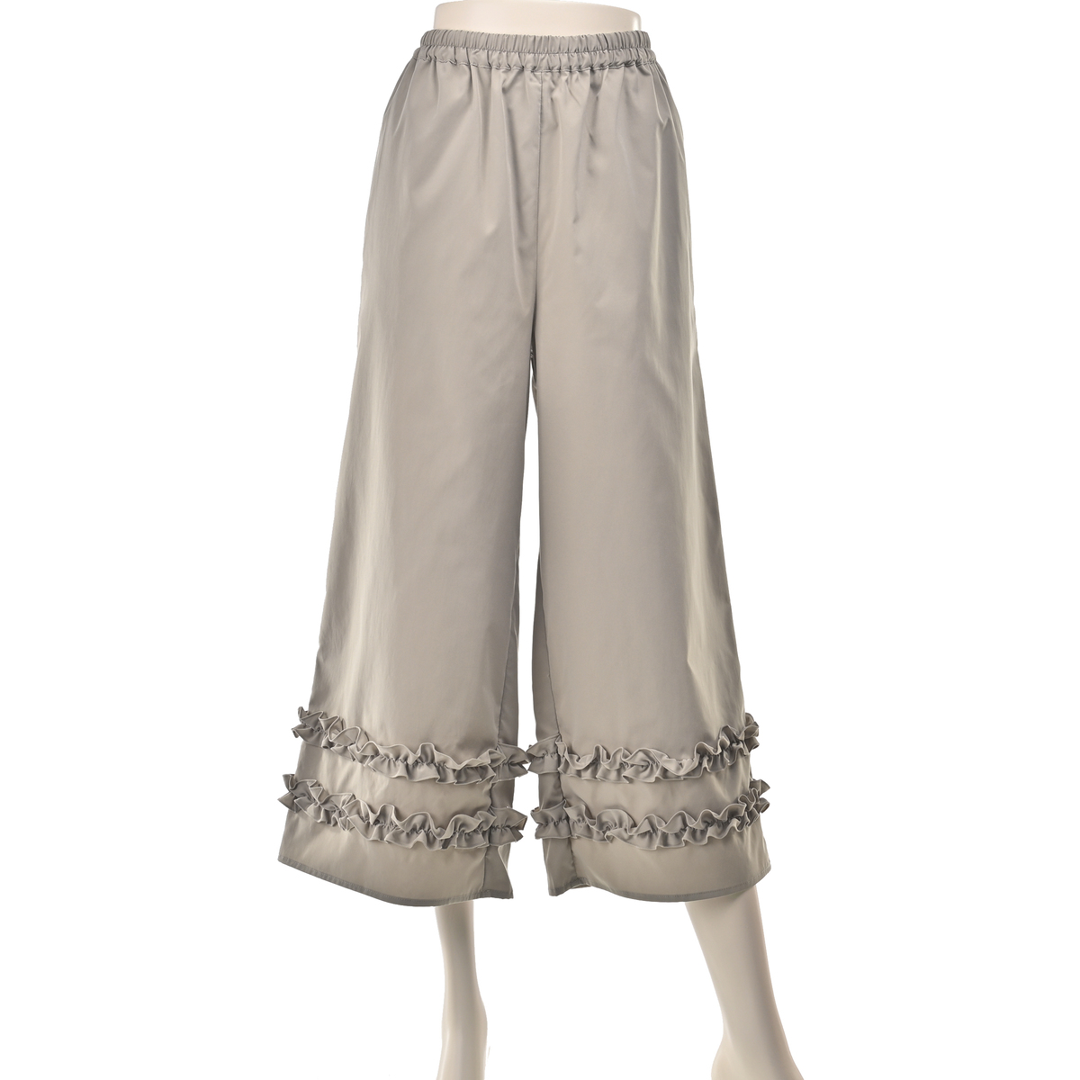 撥水加工を施した、雨の日も楽しめるスカーチョ。程よい密度の織りと張り感のある布帛素材で、カジュアル過ぎないきれいめな素材感です。裾に細幅のフリルを2段重ねて華やかさをプラスし、動きに合わせてふわりと揺れるデザインがフェミニンな印象を演出します