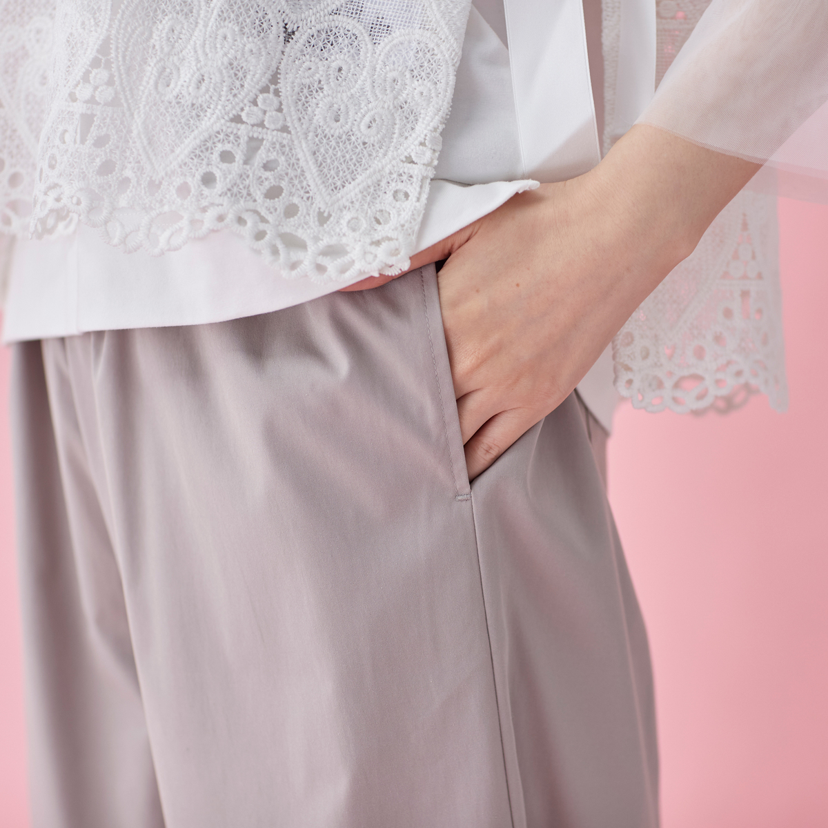 ウエストは総ゴム仕様で、内側は調整紐付き。わたり幅はゆったりめに仕上げ、体型を上手にカバーしながらストレスフリーな穿き心地です。両サイドとヒップには便利なポケット付きで実用性も兼ね備えています