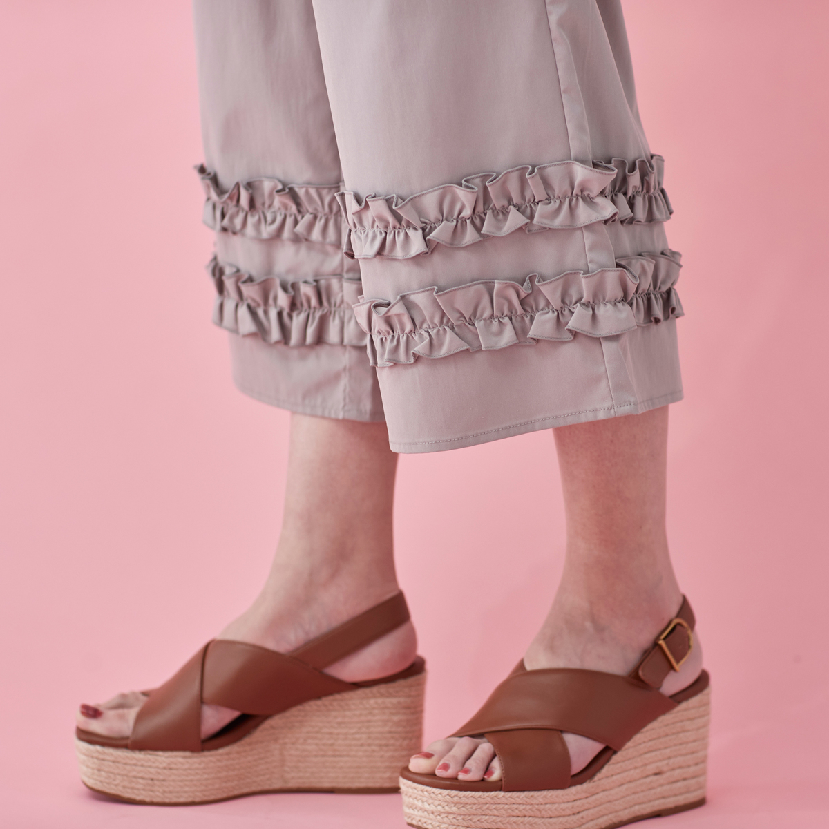 撥水加工を施した、雨の日も楽しめるスカーチョ。程よい密度の織りと張り感のある布帛素材で、カジュアル過ぎないきれいめな素材感です。裾に細幅のフリルを2段重ねて華やかさをプラスし、動きに合わせてふわりと揺れるデザインがフェミニンな印象を演出します