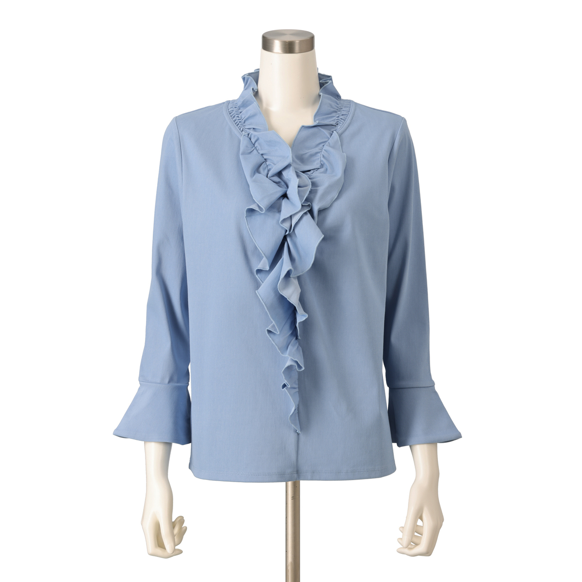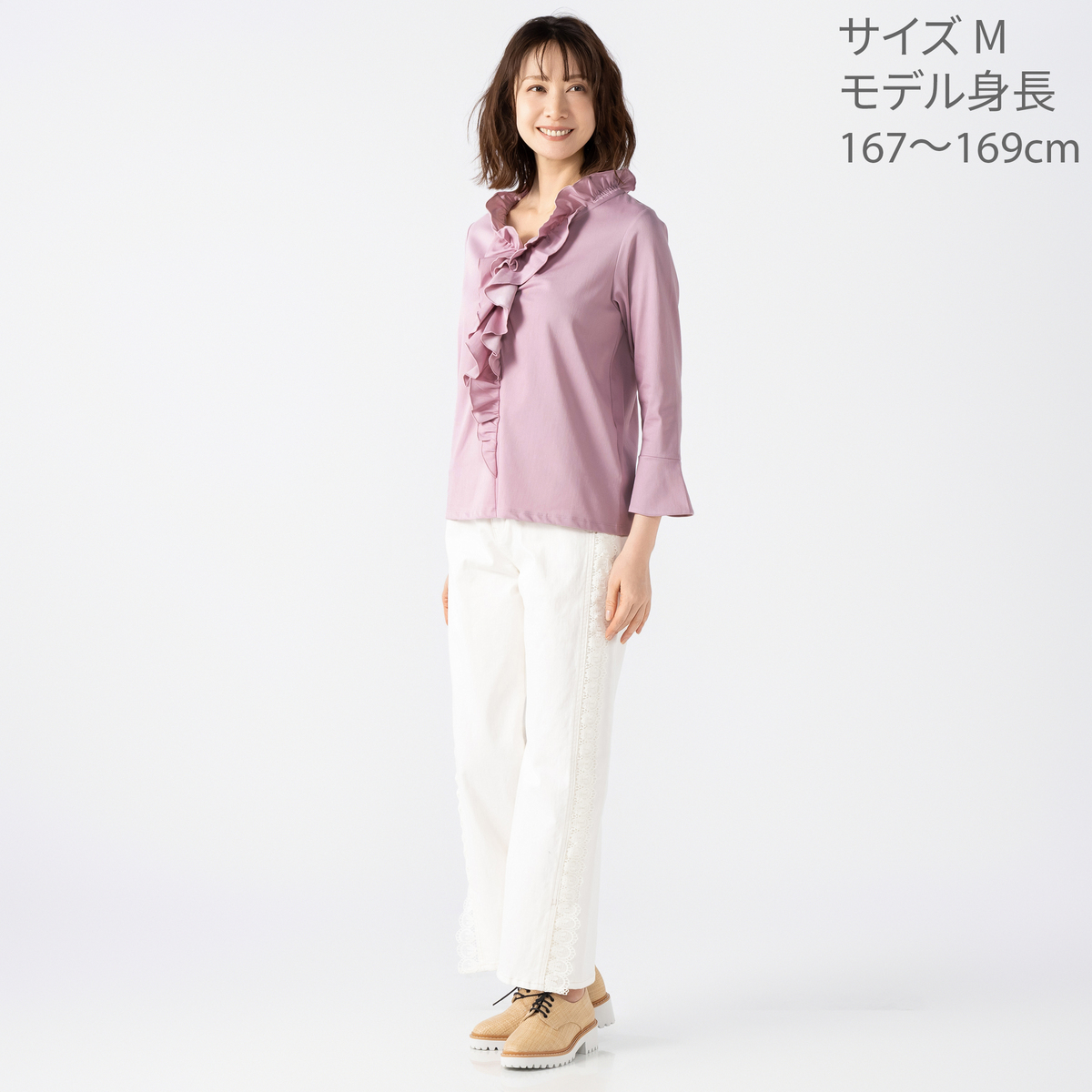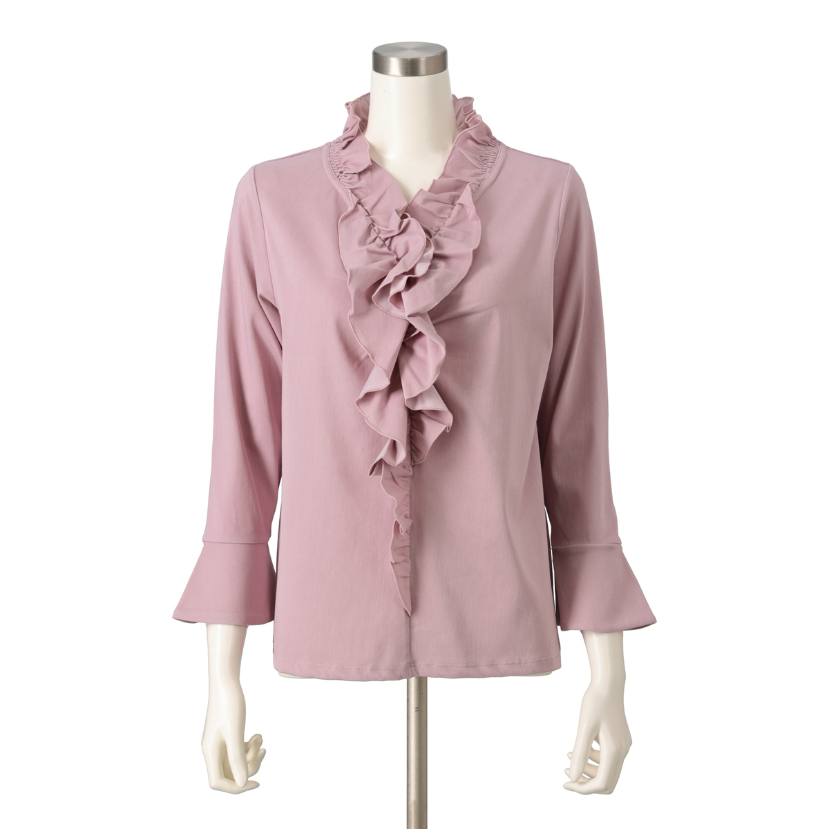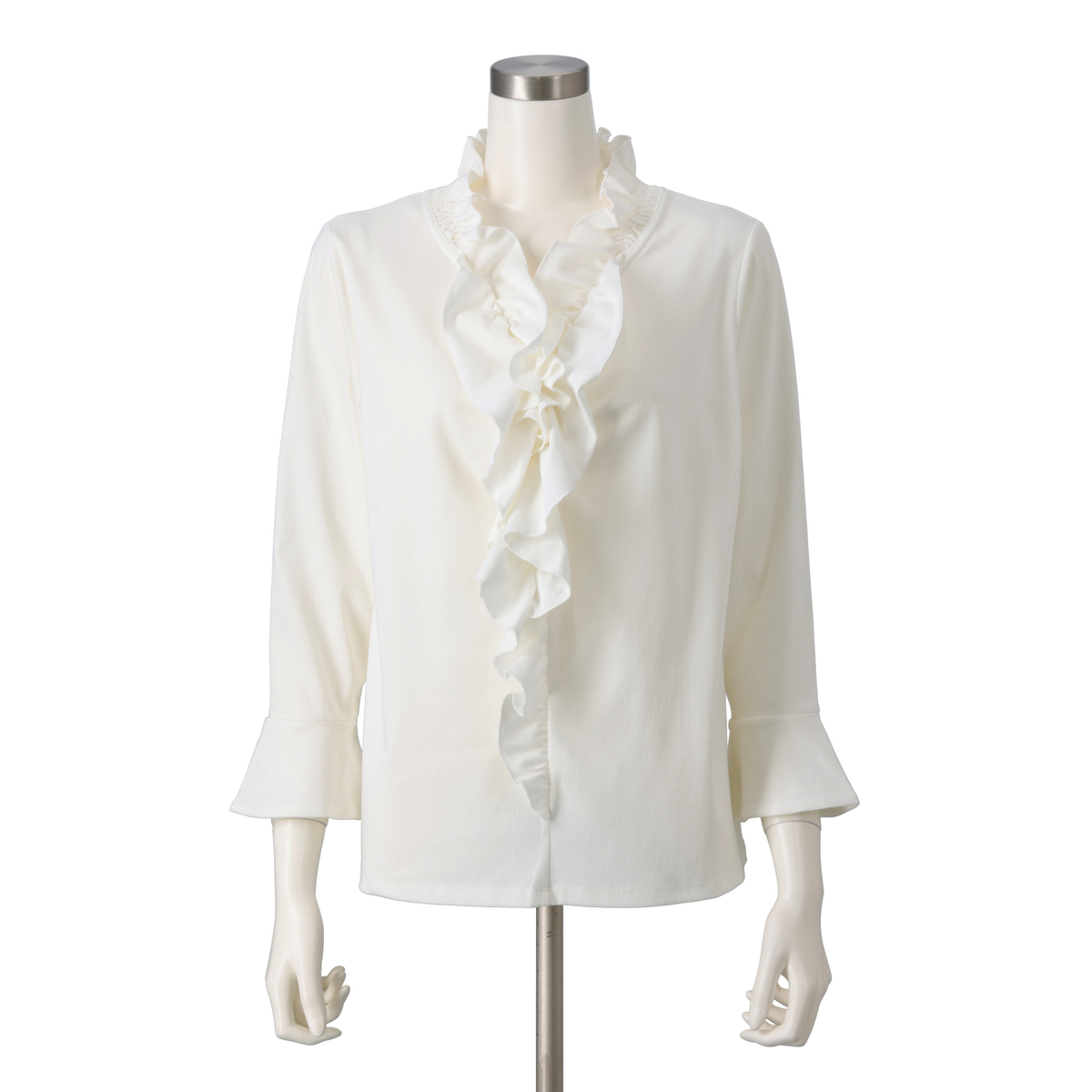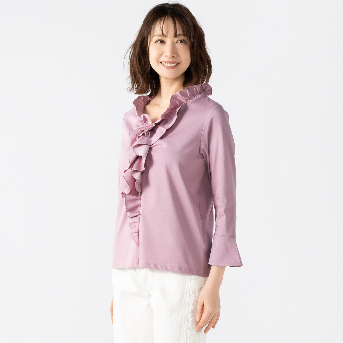 衿ぐりから前中心にかけてたっぷりとフリルをあしらい、顔まわりを明るく見せるデザインに。適度な丈感の袖口フレアが軽やかに揺れ、程よい華やかさがやさしく広がります