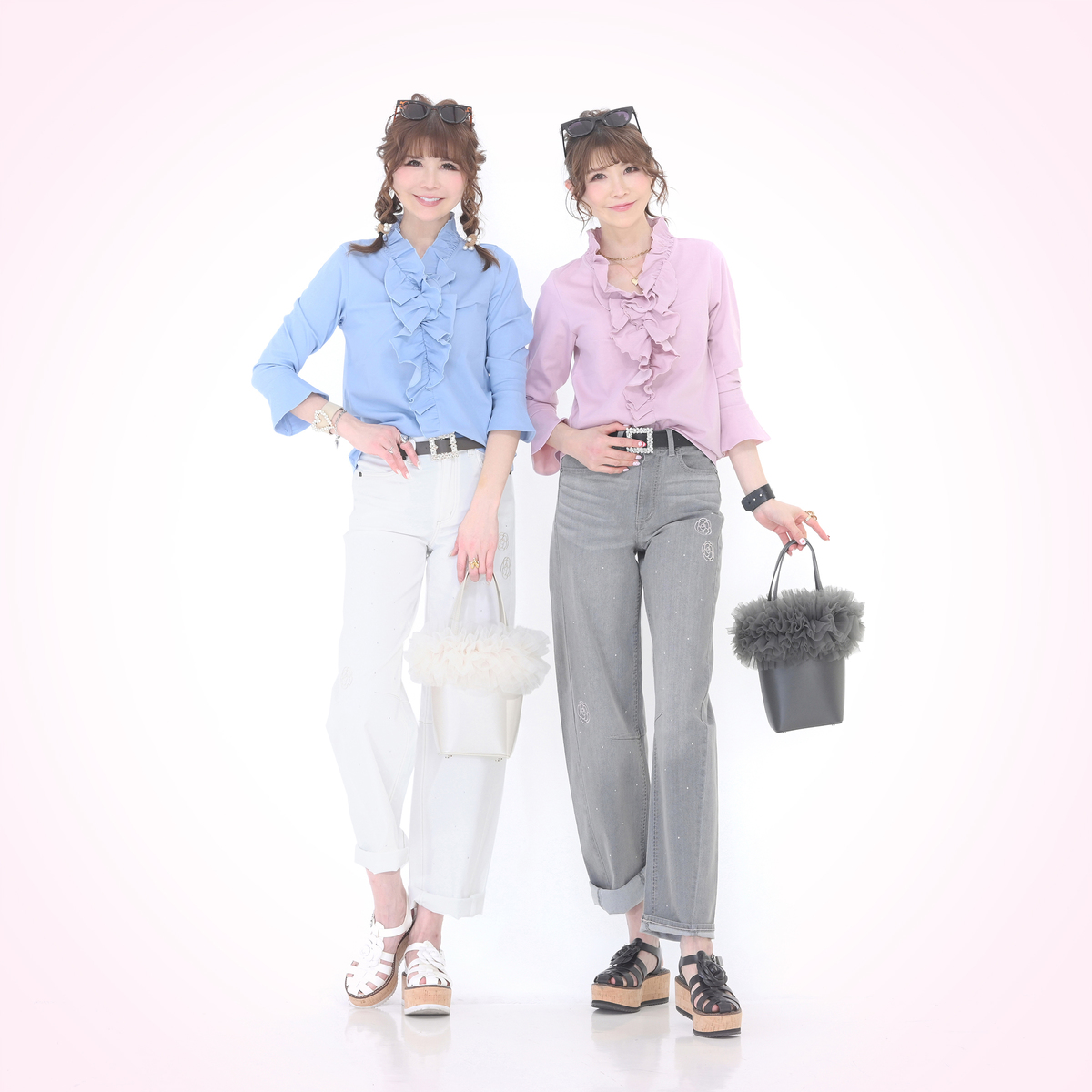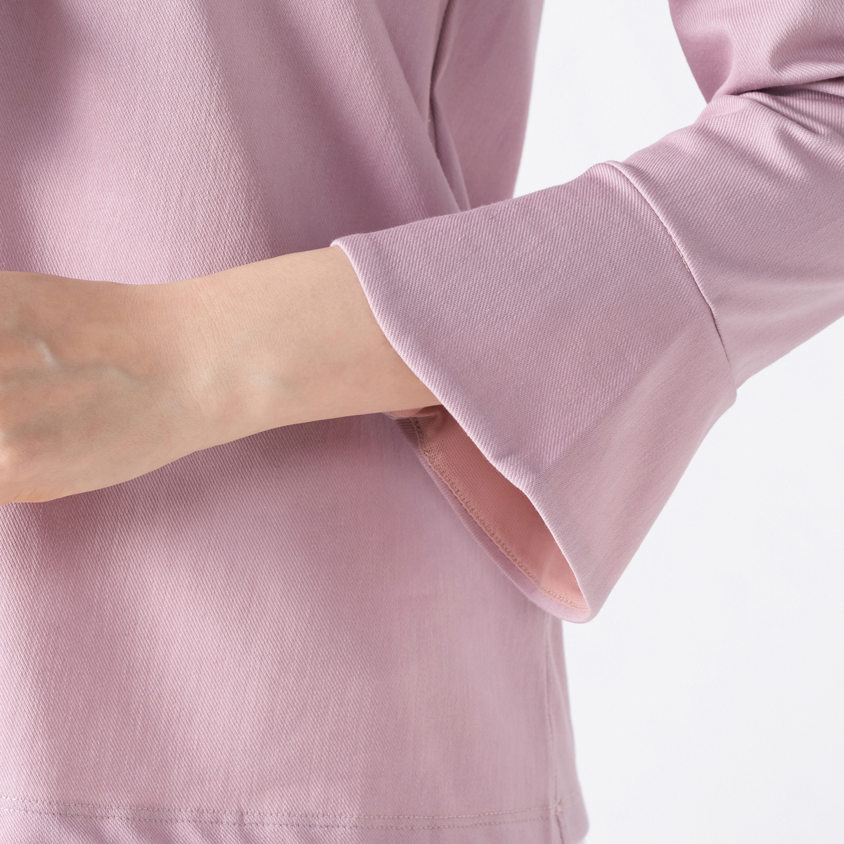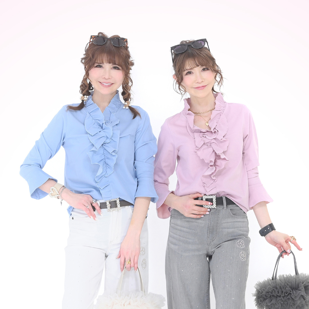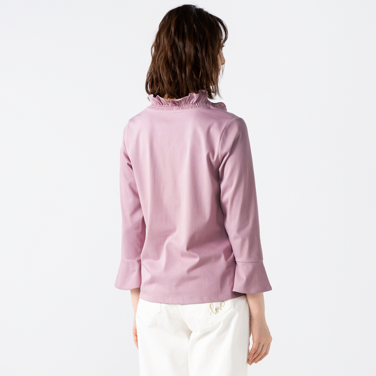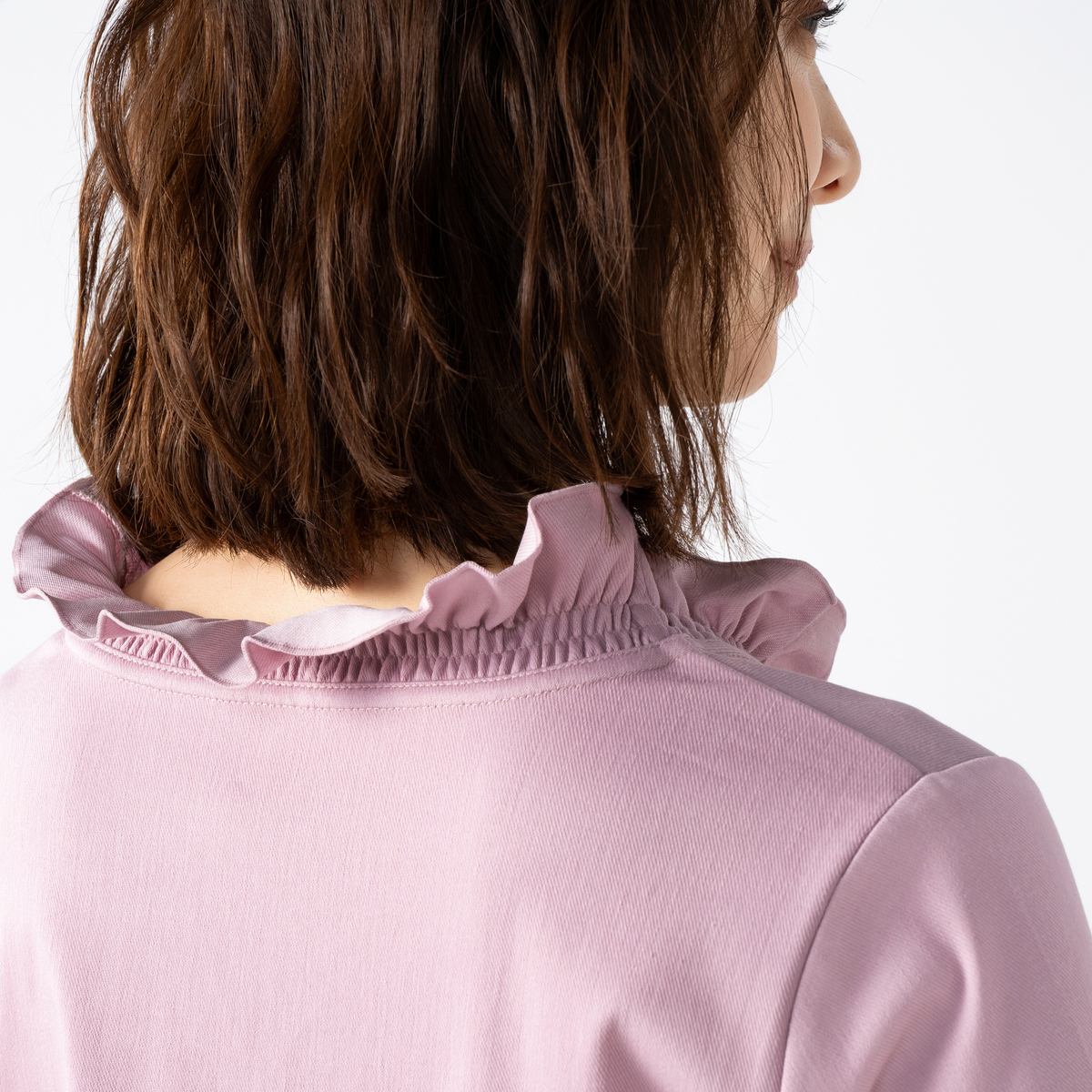 衿ぐりから前中心にかけてたっぷりとフリルをあしらい、顔まわりを明るく見せるデザインに。適度な丈感の袖口フレアが軽やかに揺れ、程よい華やかさがやさしく広がります