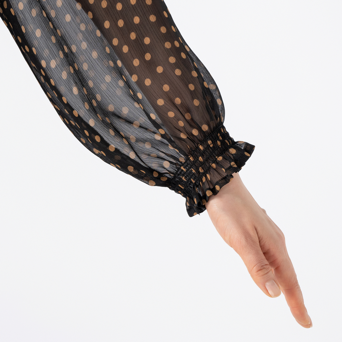 なめらかな落ち感がある、楊柳シフォンにドットプリントを施した布帛素材。裾に向かって自然に落ちるシルエットです。前後身頃には裏地付き。袖は肩まわりがコンパクトに見え、腕周りもすっきりと華奢な印象をもたらしてくれます