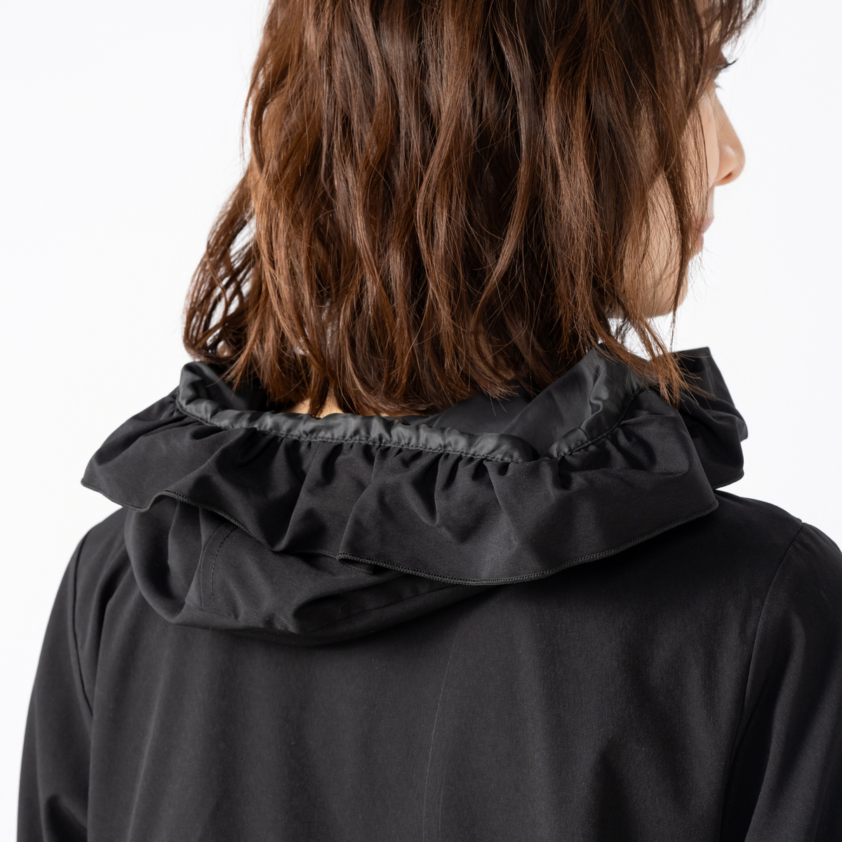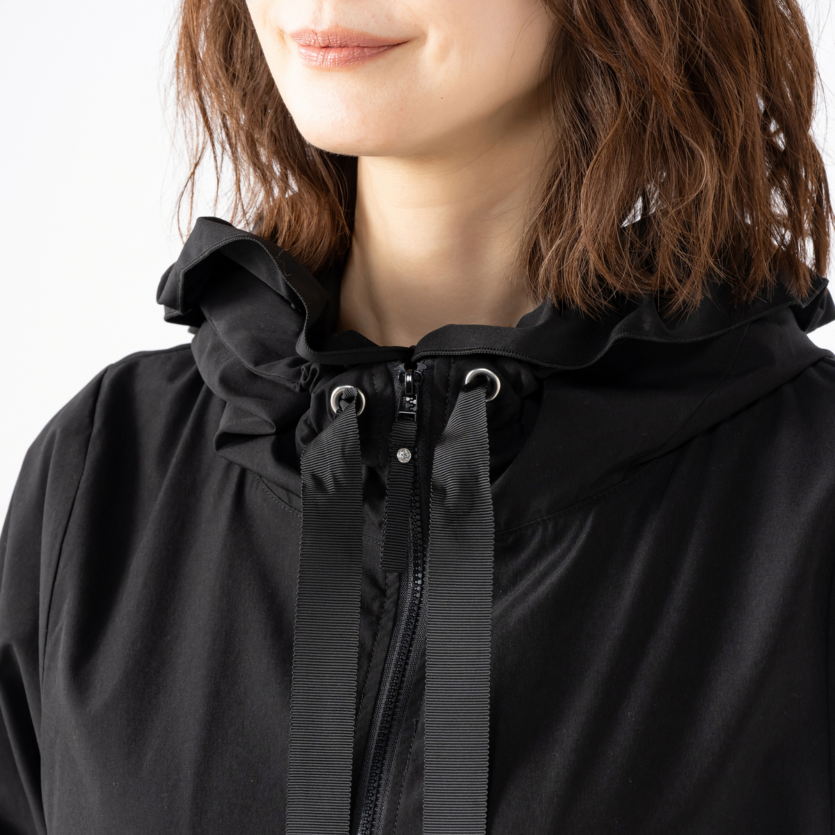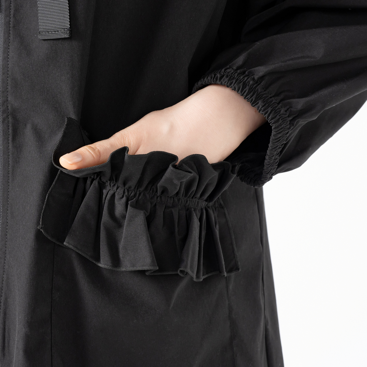 フードの端やフロントポケットにフリルを施した撥水フードフリルコート。フロントのポケットには動くたびふわりと揺れるドラマティックなフリルをデザイン。フリルの位置を少し高めにすることで、ウエストラインがすっきり見え、自然な細見え効果も期待できます
