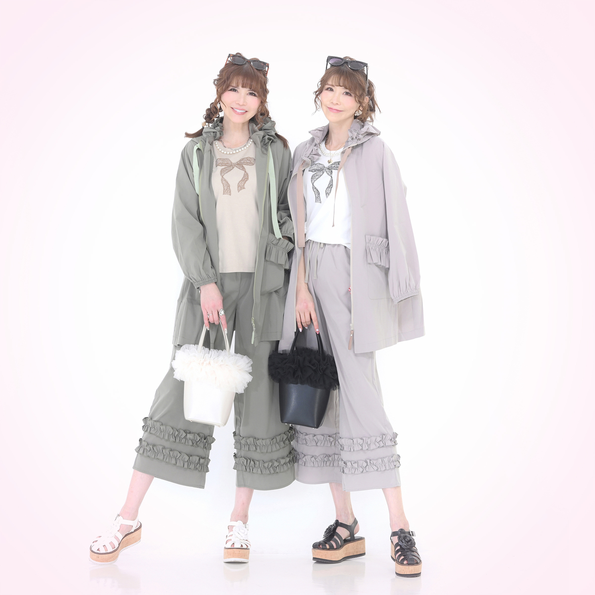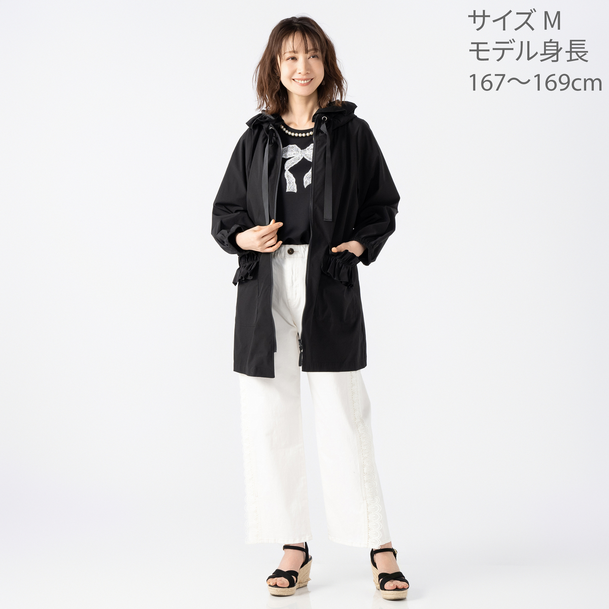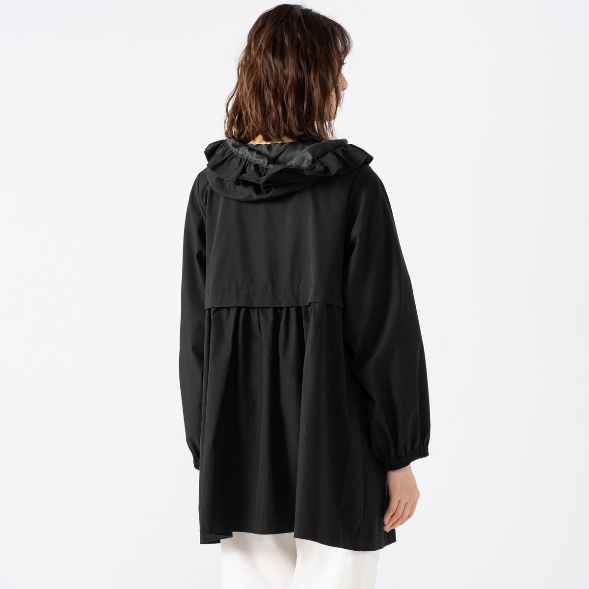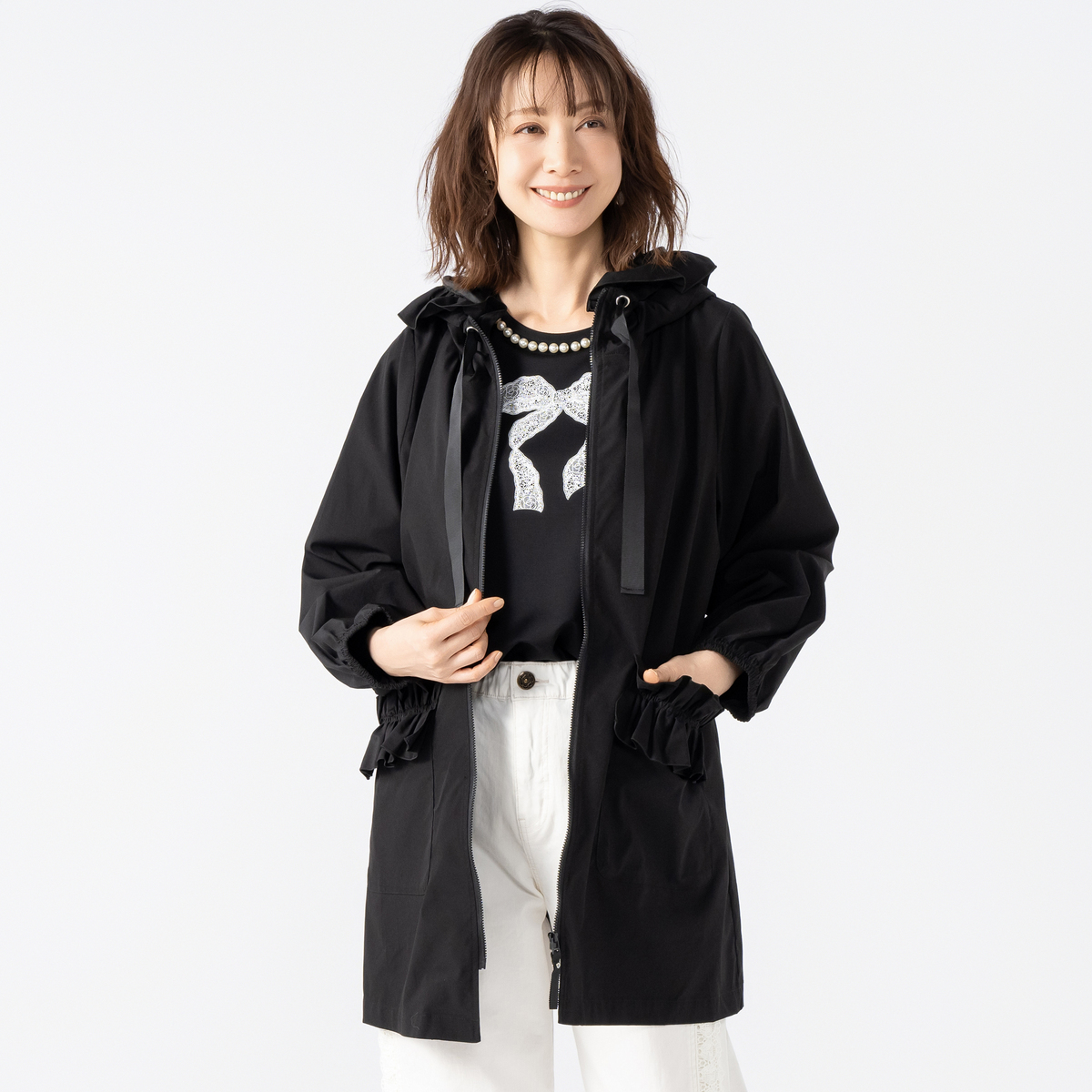 フードの端やフロントポケットにフリルを施した撥水フードフリルコート。フロントのポケットには動くたびふわりと揺れるドラマティックなフリルをデザイン。フリルの位置を少し高めにすることで、ウエストラインがすっきり見え、自然な細見え効果も期待できます