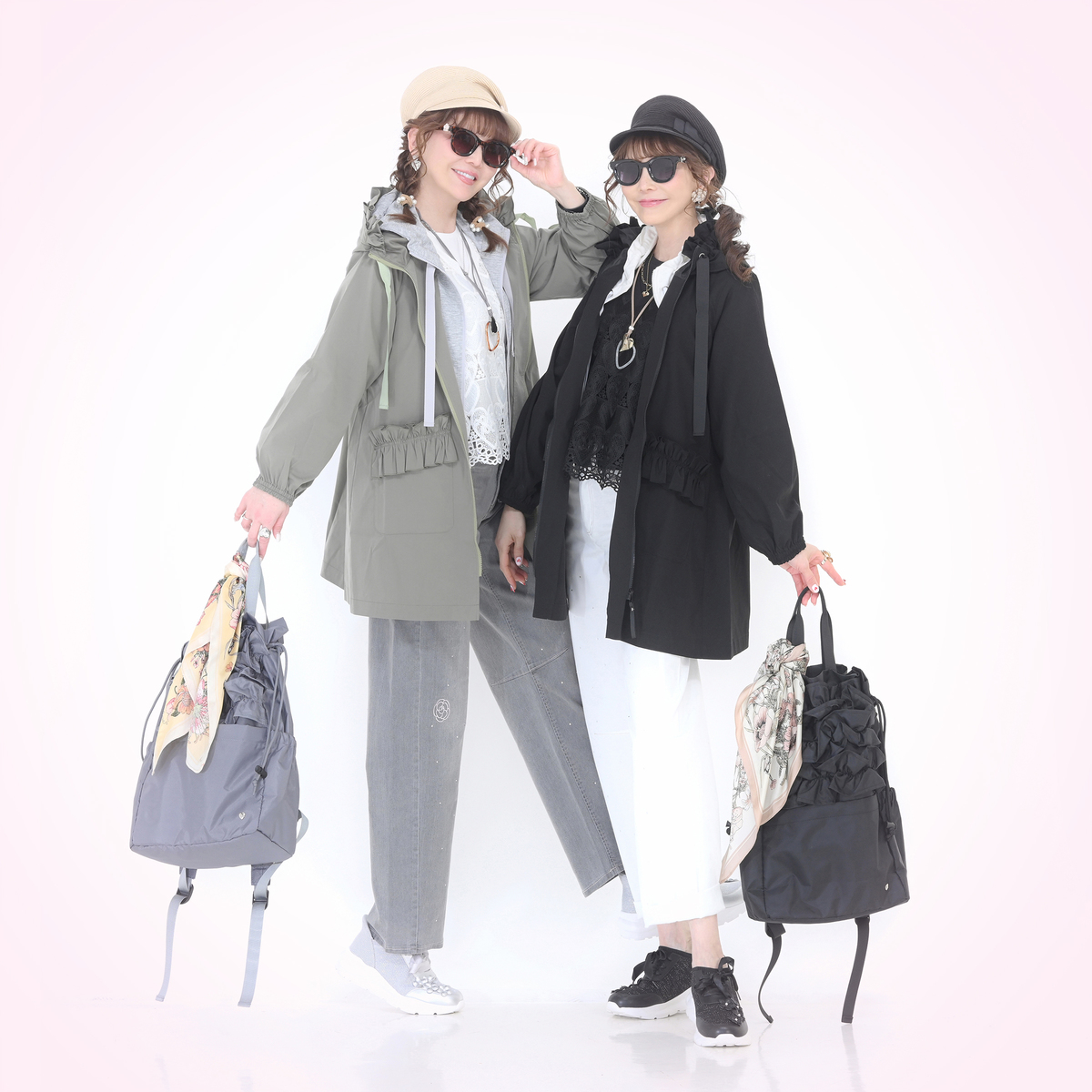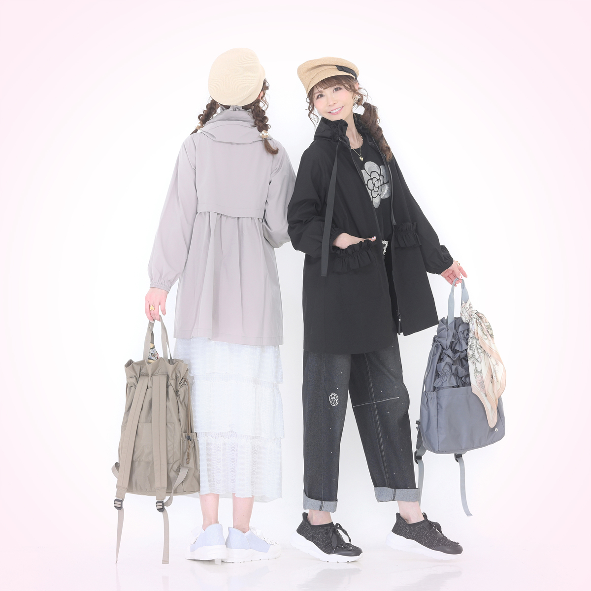 セットインスリーブで二の腕周りが気になりにくく、気になる部分を自然にカバーしてくれるボックスシルエットです。前ファスナーはフードの上端まで閉じることができ、首元をやさしく包み込み雨風の日にも安心感のあるデザイン。グログランテープの持ち手やラインストーンのカシメなど、細部までこだわっています
