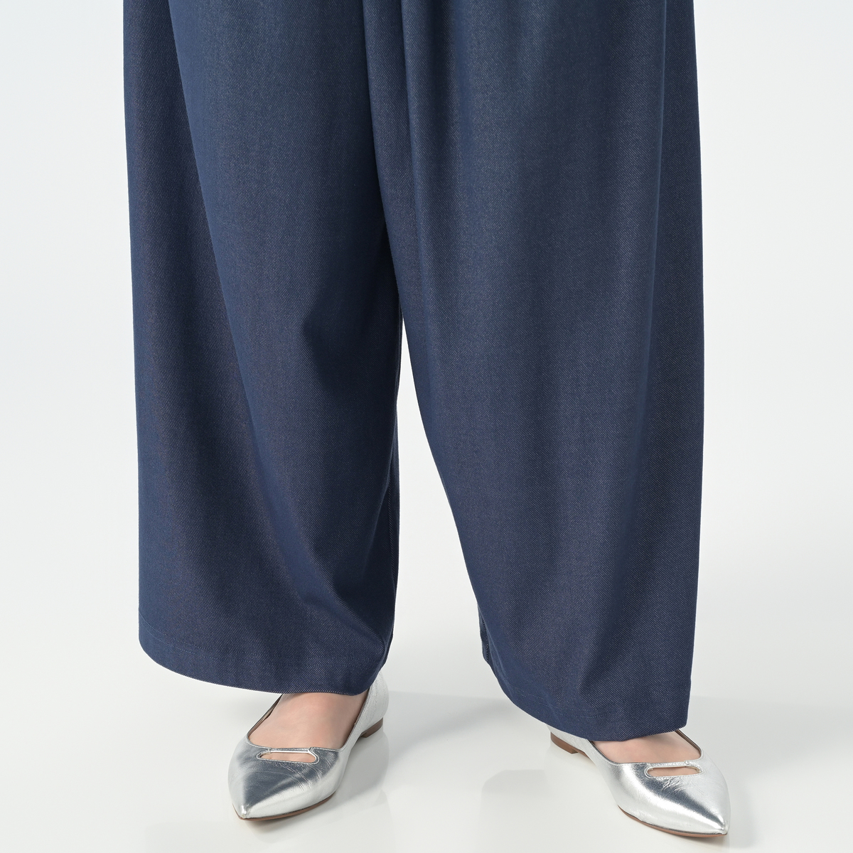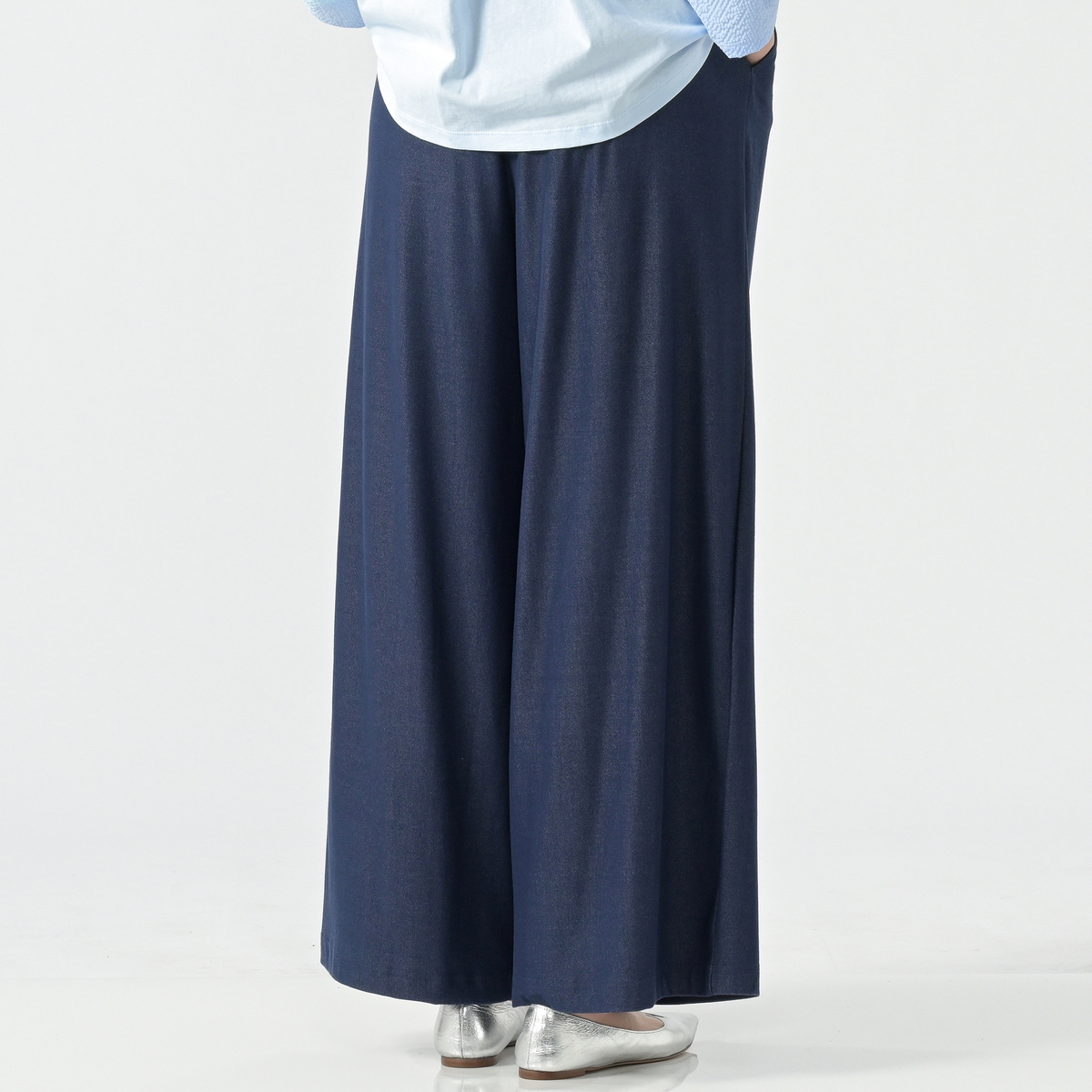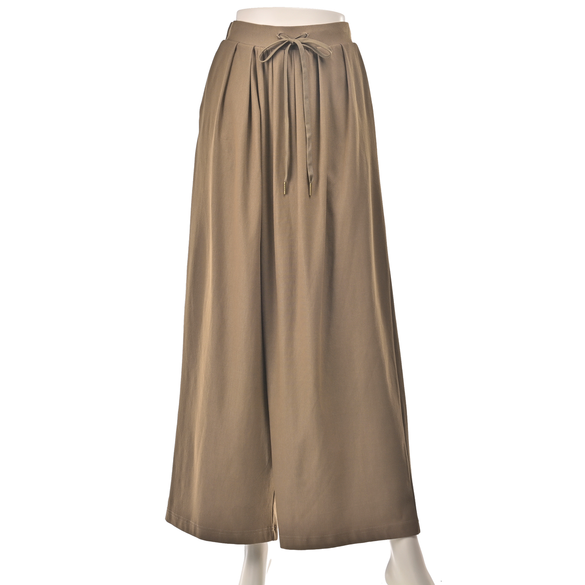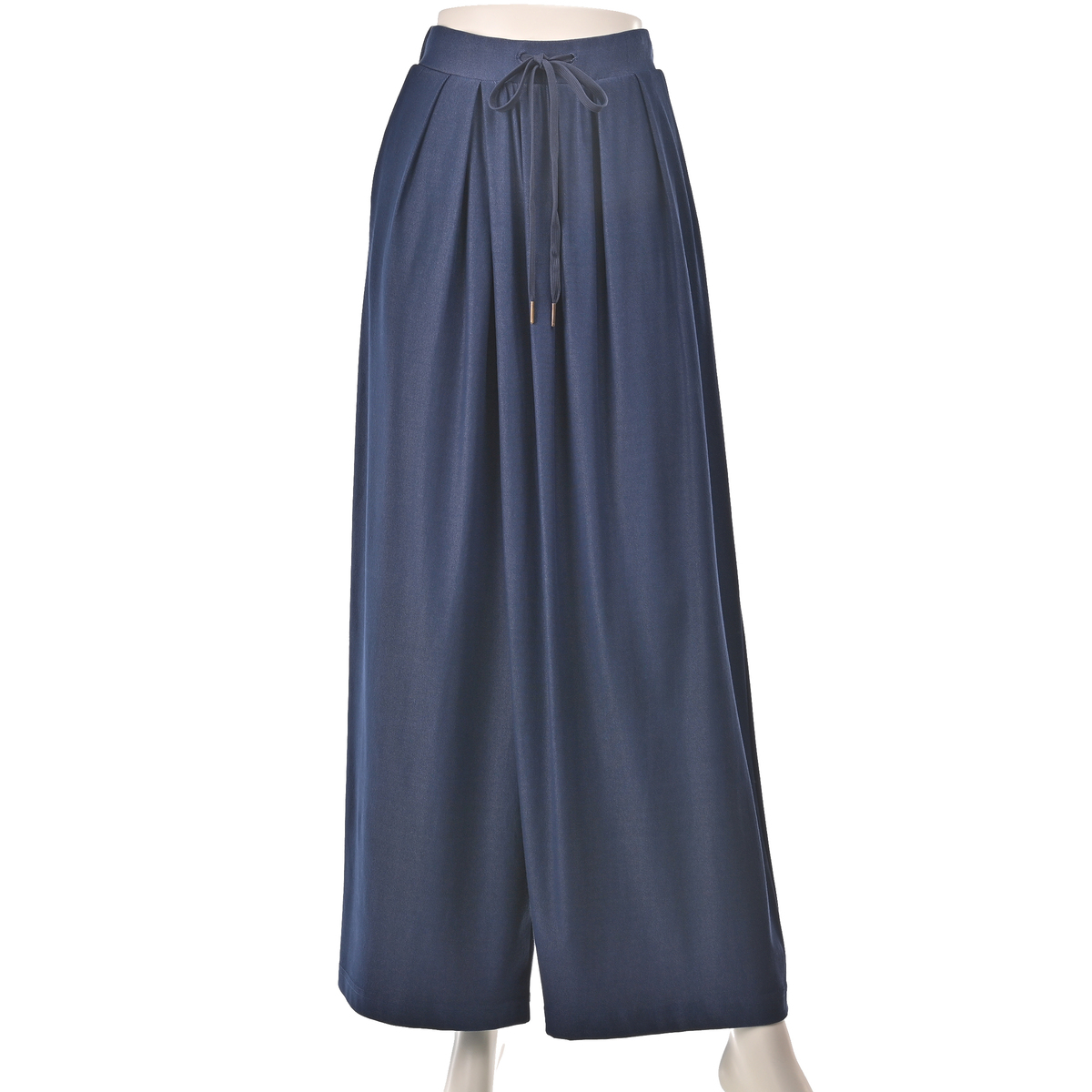 フロントにタックを入れたストレートパンツです。繊維中に油脂分を含むエニワイズ加工で、しっとりとした肌触り。ウエストは後ろにゴムを入れ、楽な穿き心地に仕上げました