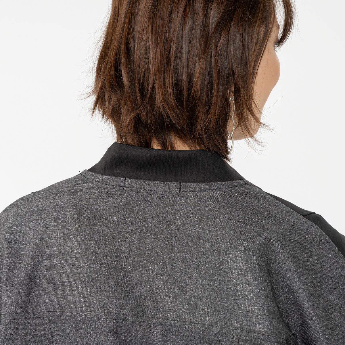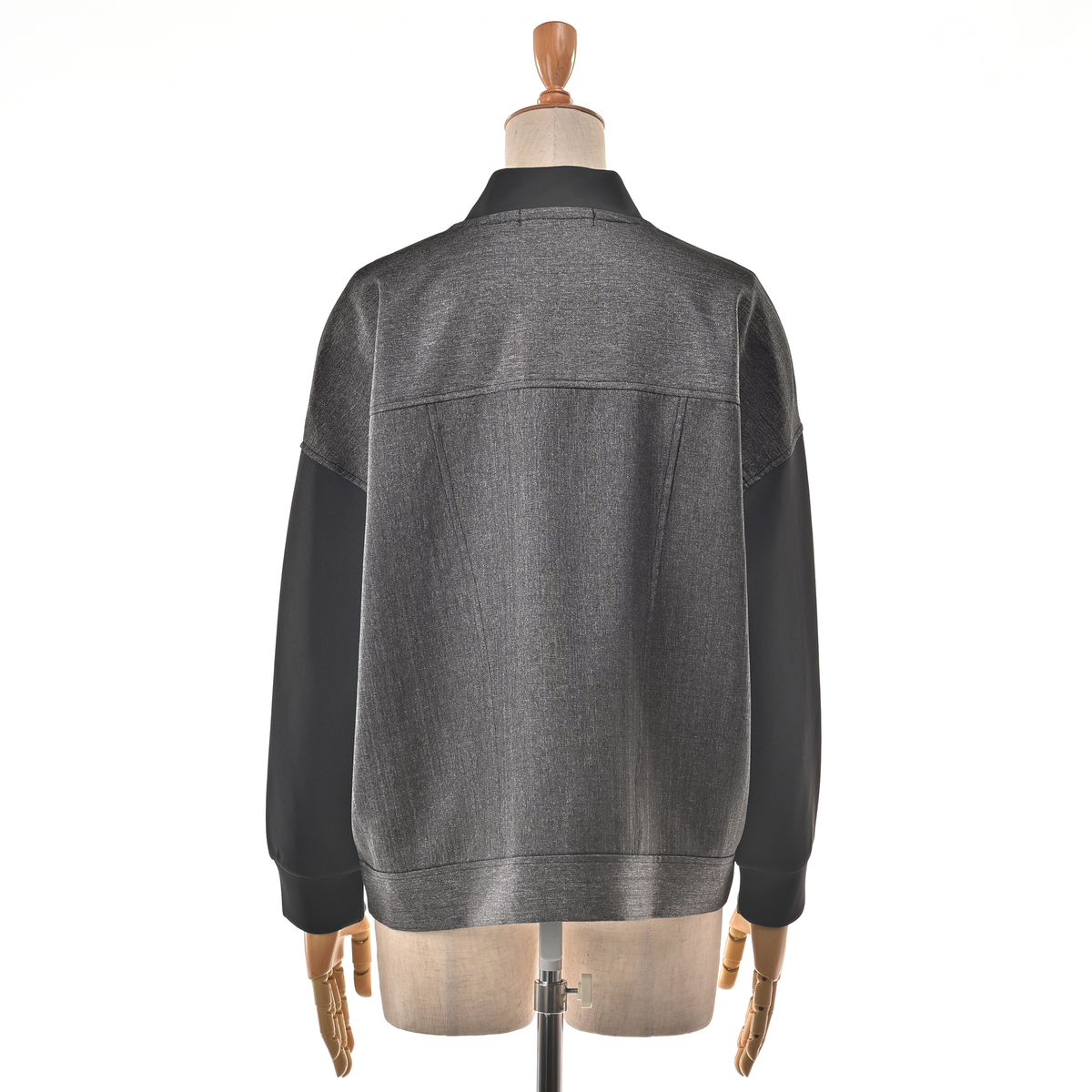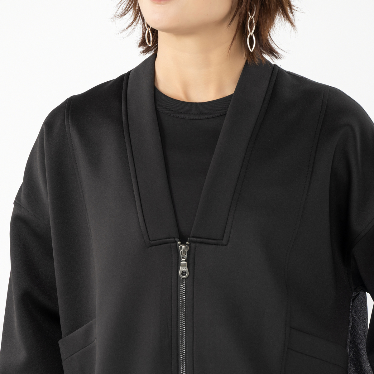 カットソーと布帛を組合せた異素材使いのブルゾン。すっきりとしたVネックラインが特徴です