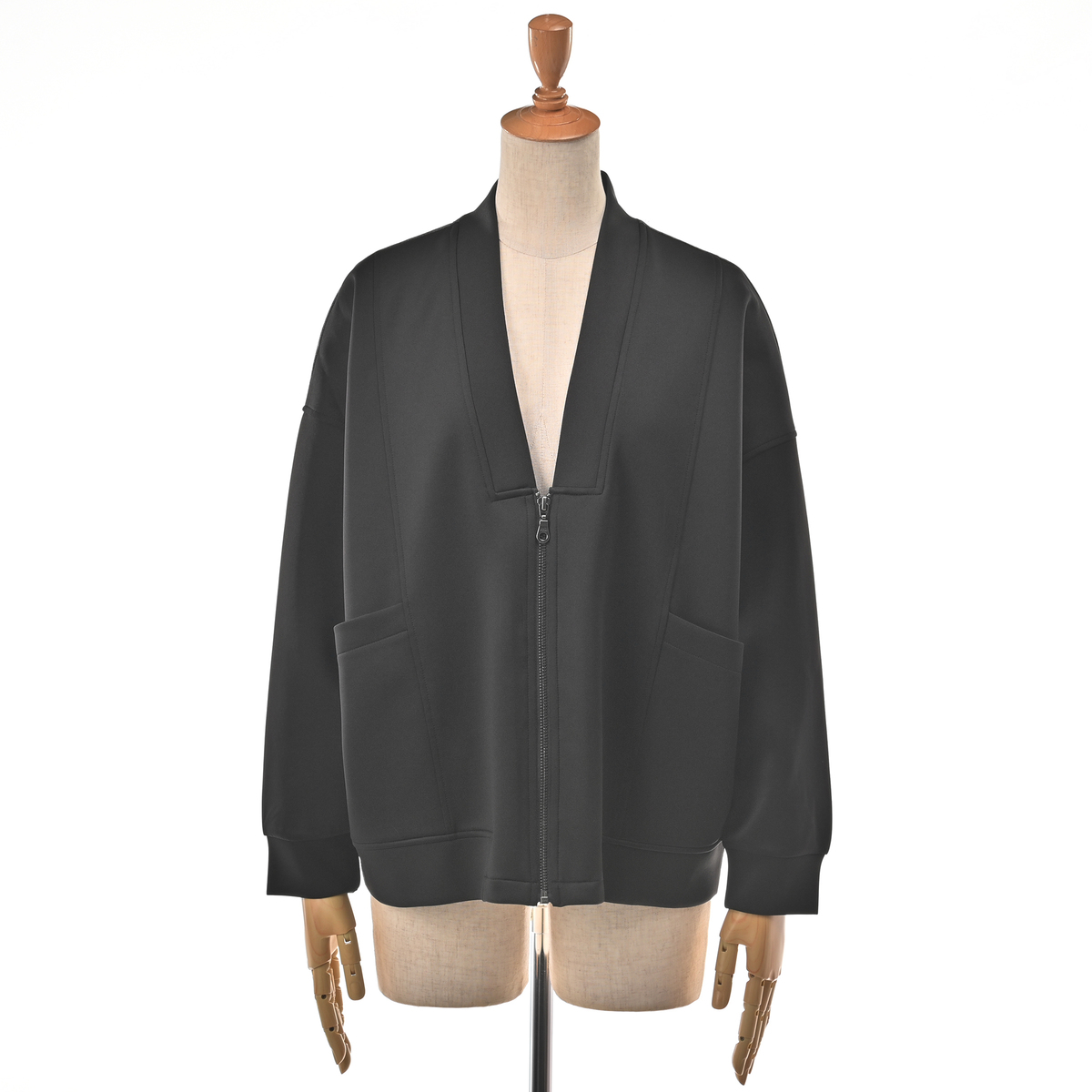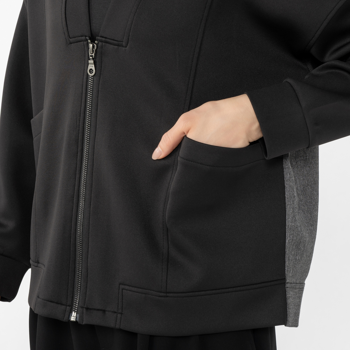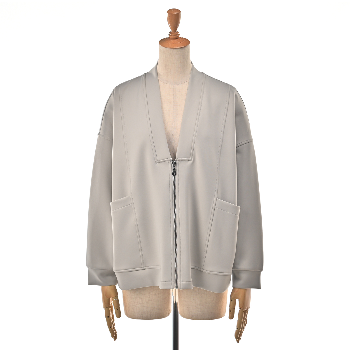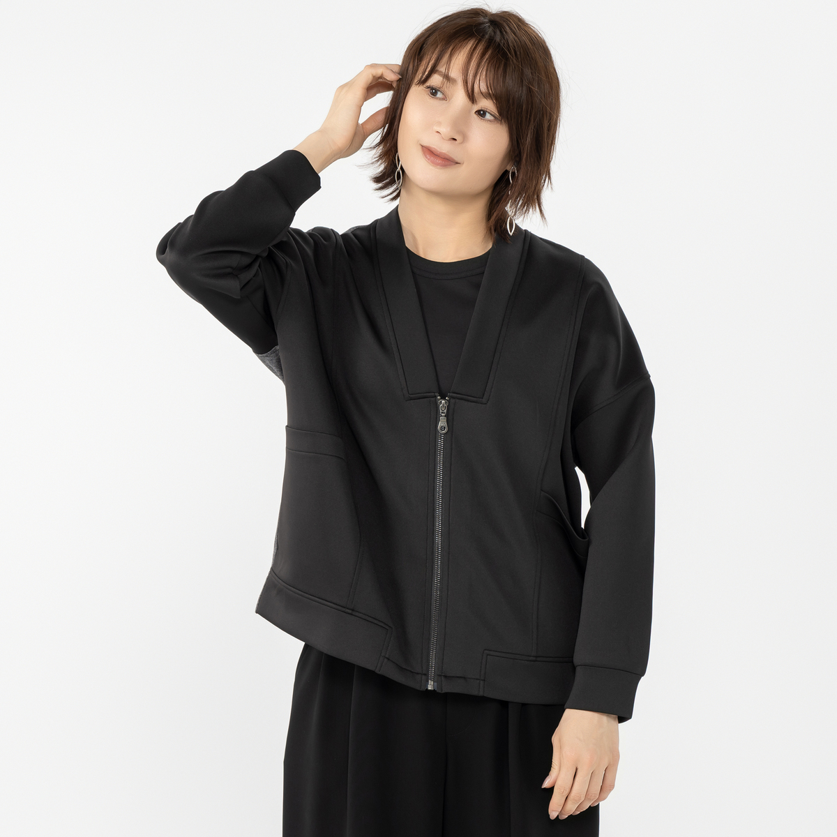 カットソーと布帛を組合せた異素材使いのブルゾン。すっきりとしたVネックラインが特徴です