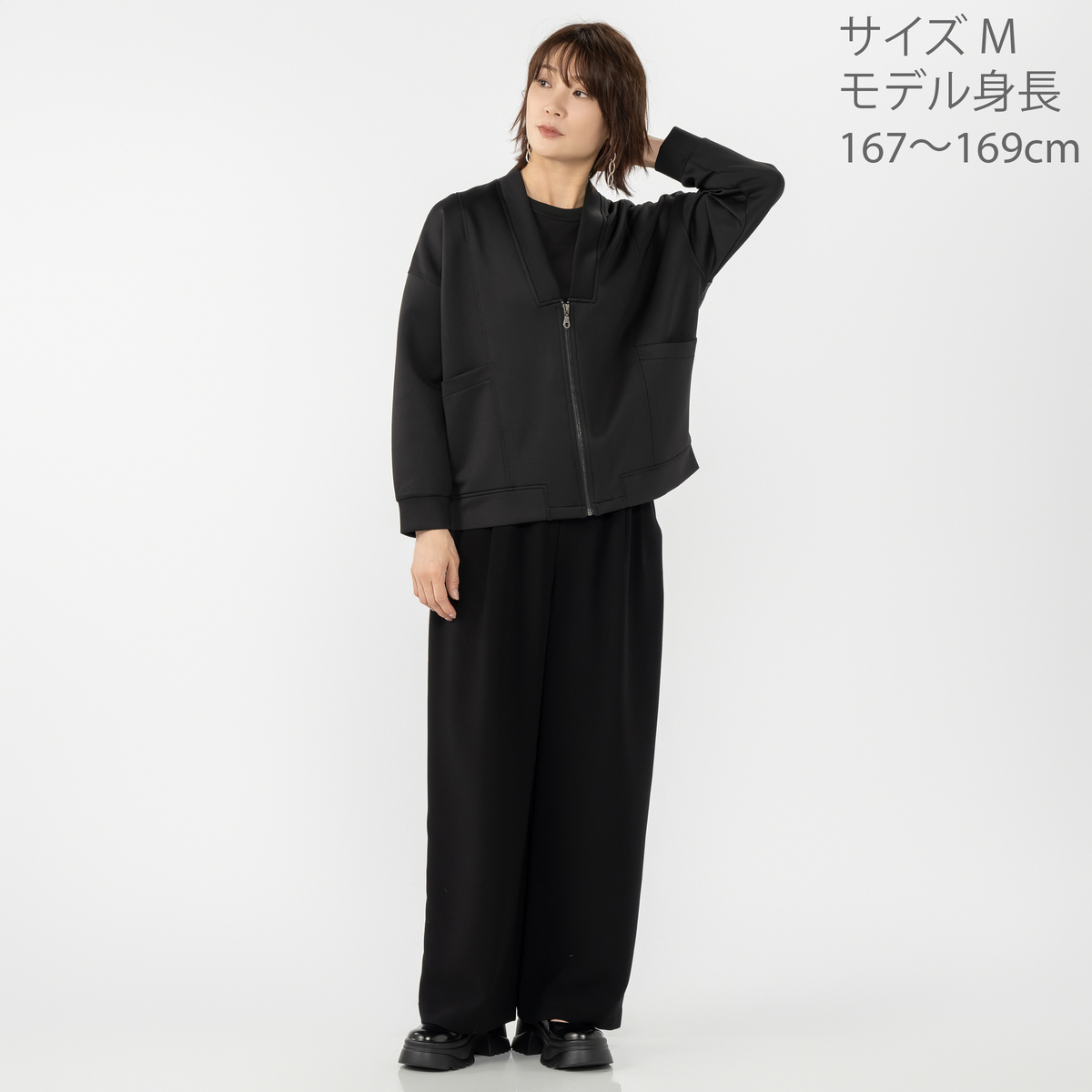 ゆったりとしたサイズ感で、ボリュームのあるトップスの上にも重ねやすく、モードな着こなしが楽しめます