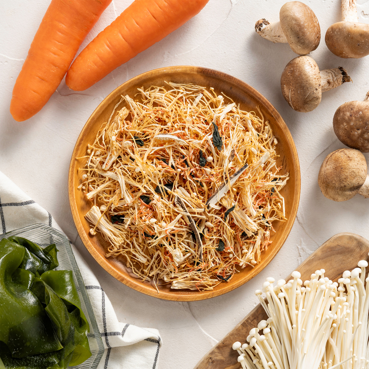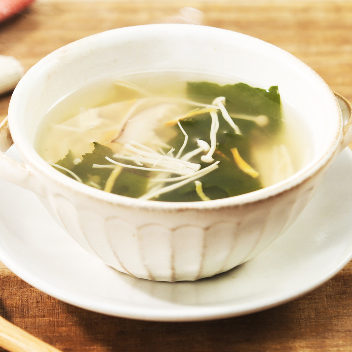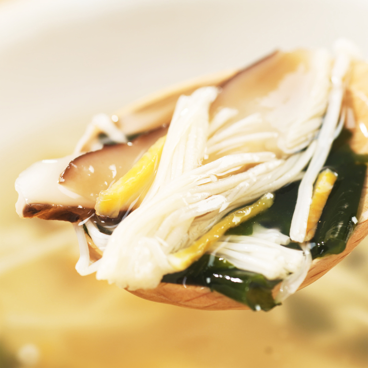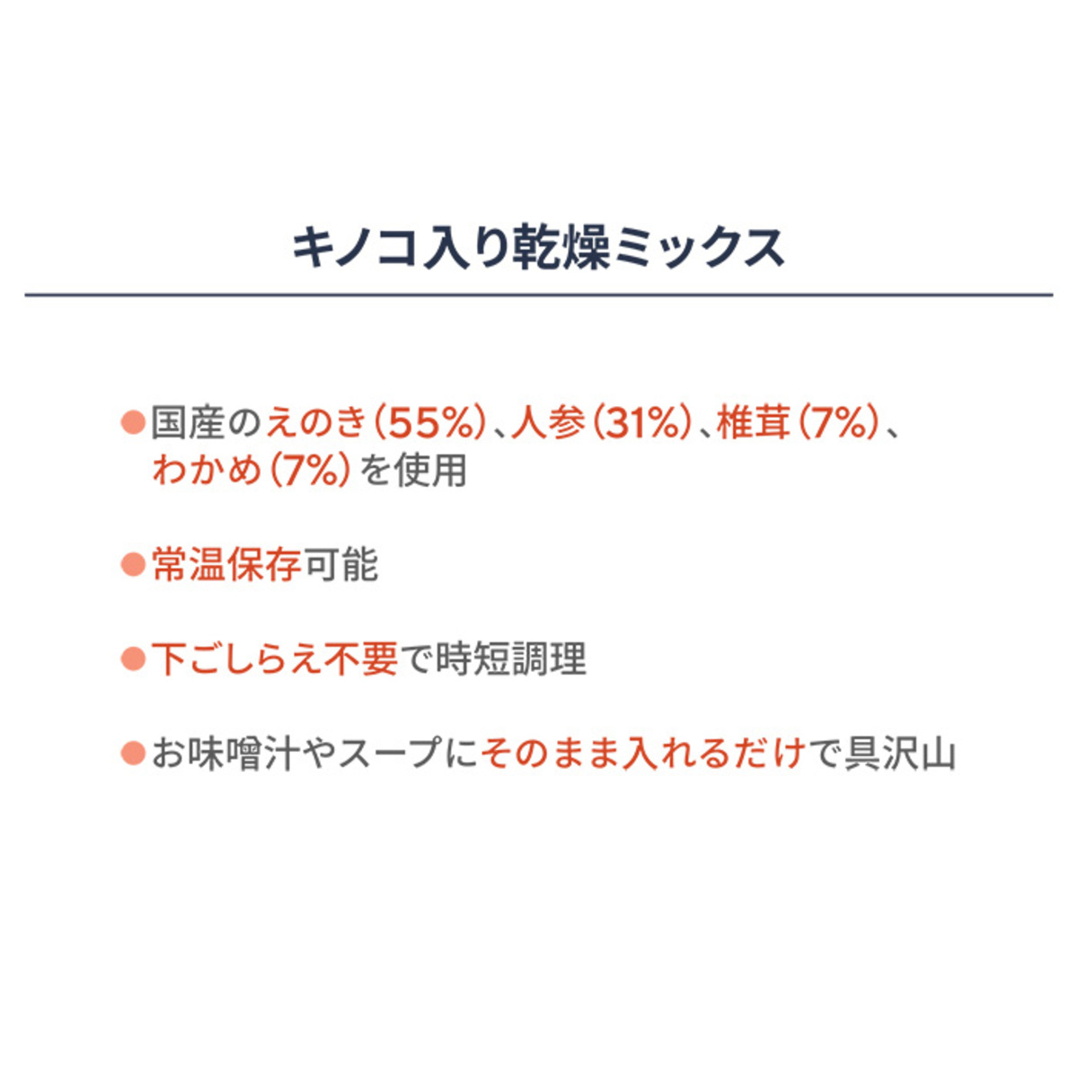 配合率はえのき55%、人参千切り31%、椎茸3mm7%、わかめ7%。下ごしらえ不要で時短調理。お味噌汁やスープにそのまま入れるだけで具沢山に。出汁が出るので、汁物には水から加えるのがおすすめです