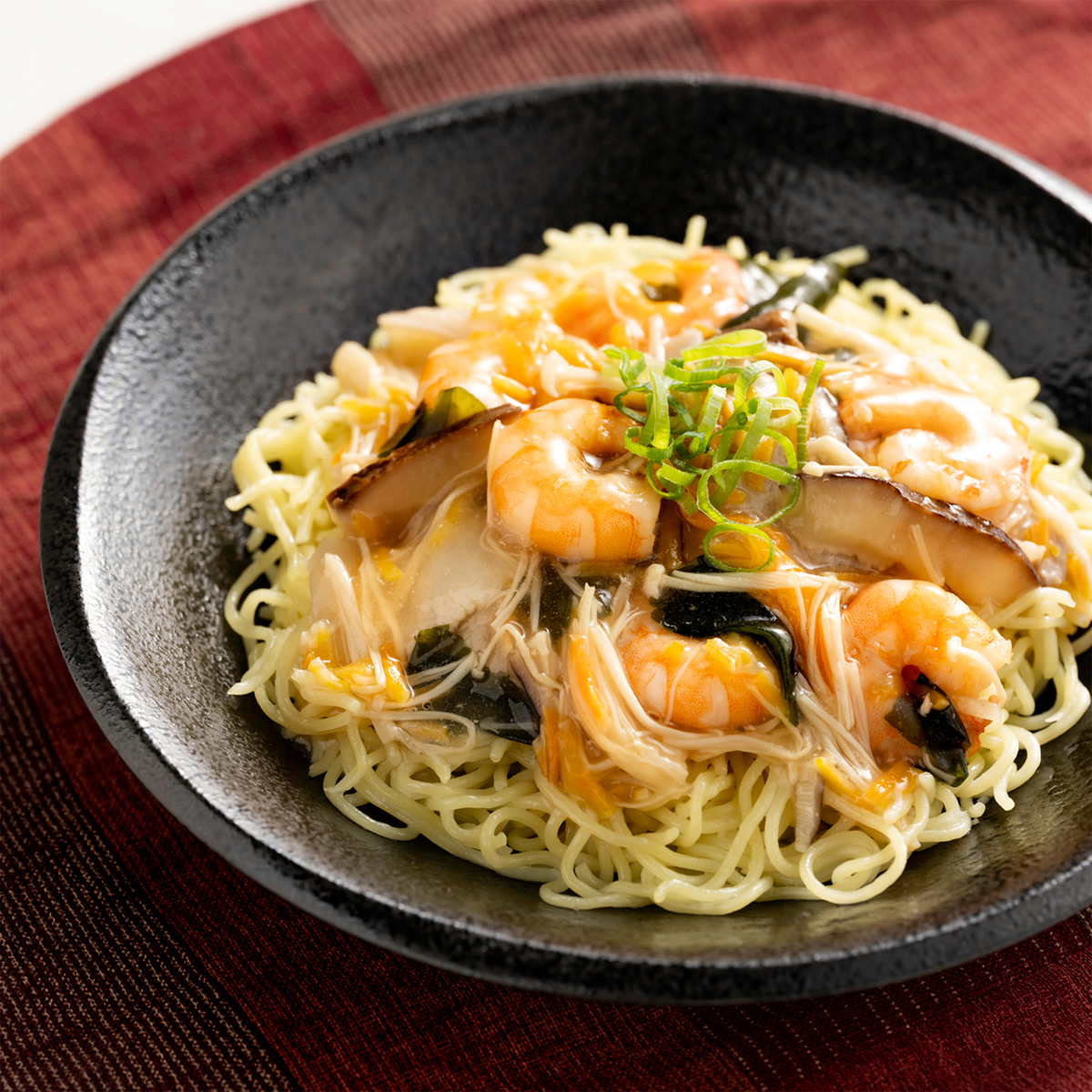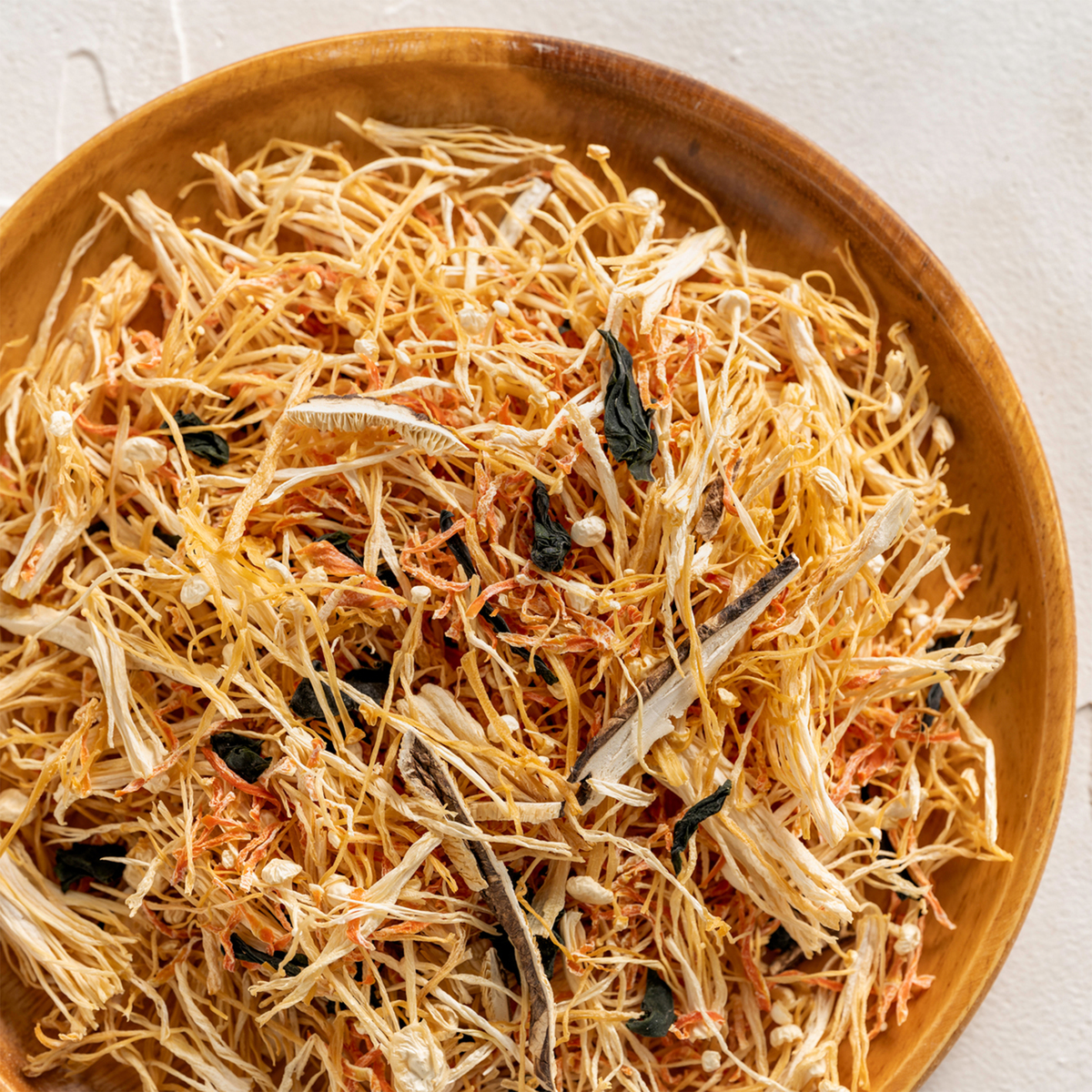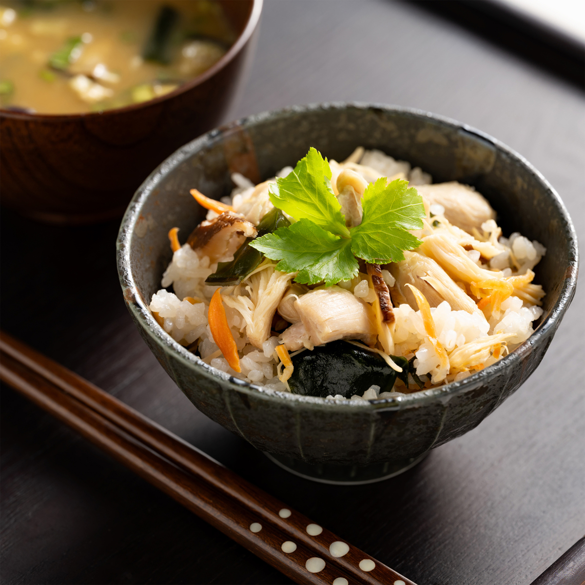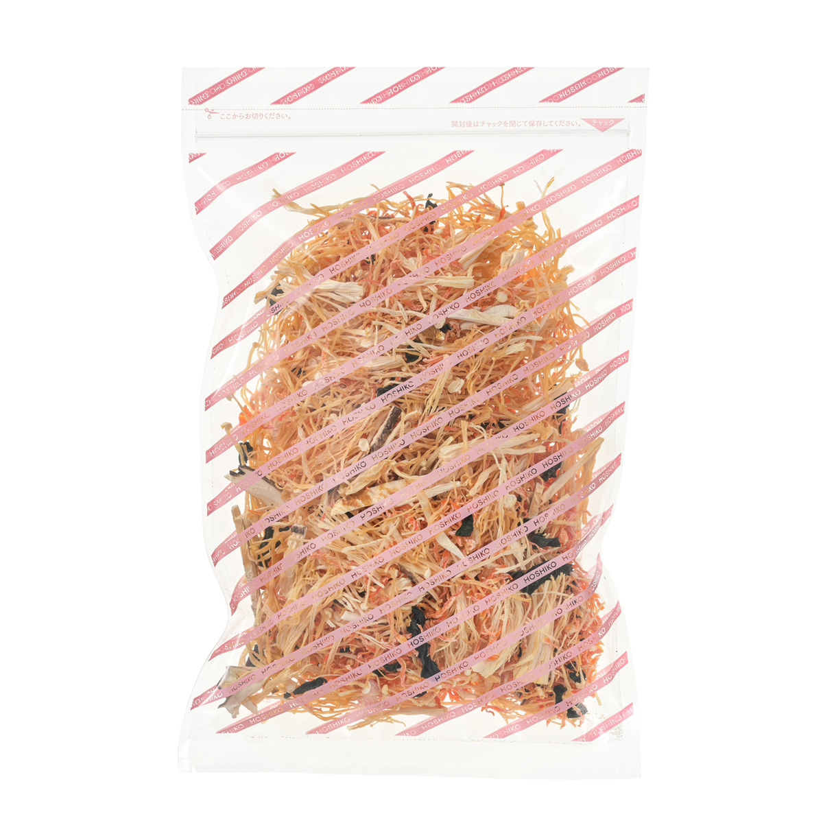 配合率はえのき55%、人参千切り31%、椎茸3mm7%、わかめ7%。下ごしらえ不要で時短調理。お味噌汁やスープにそのまま入れるだけで具沢山に。出汁が出るので、汁物には水から加えるのがおすすめです