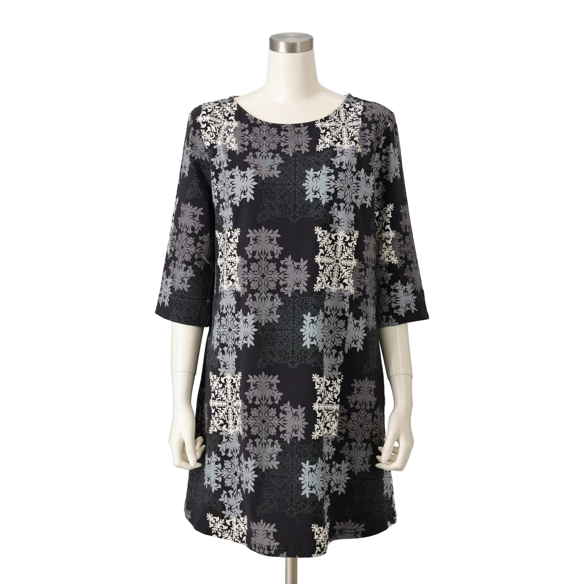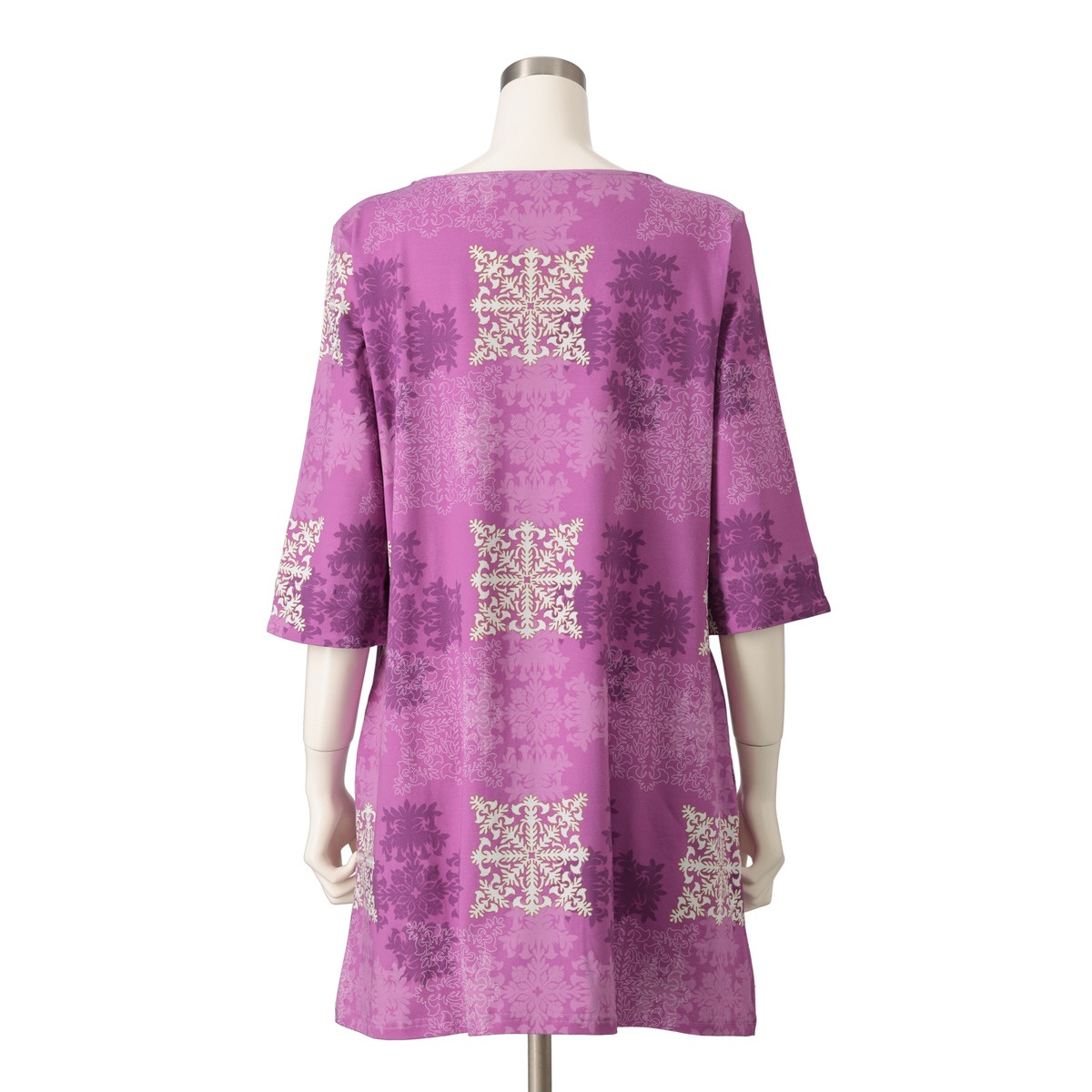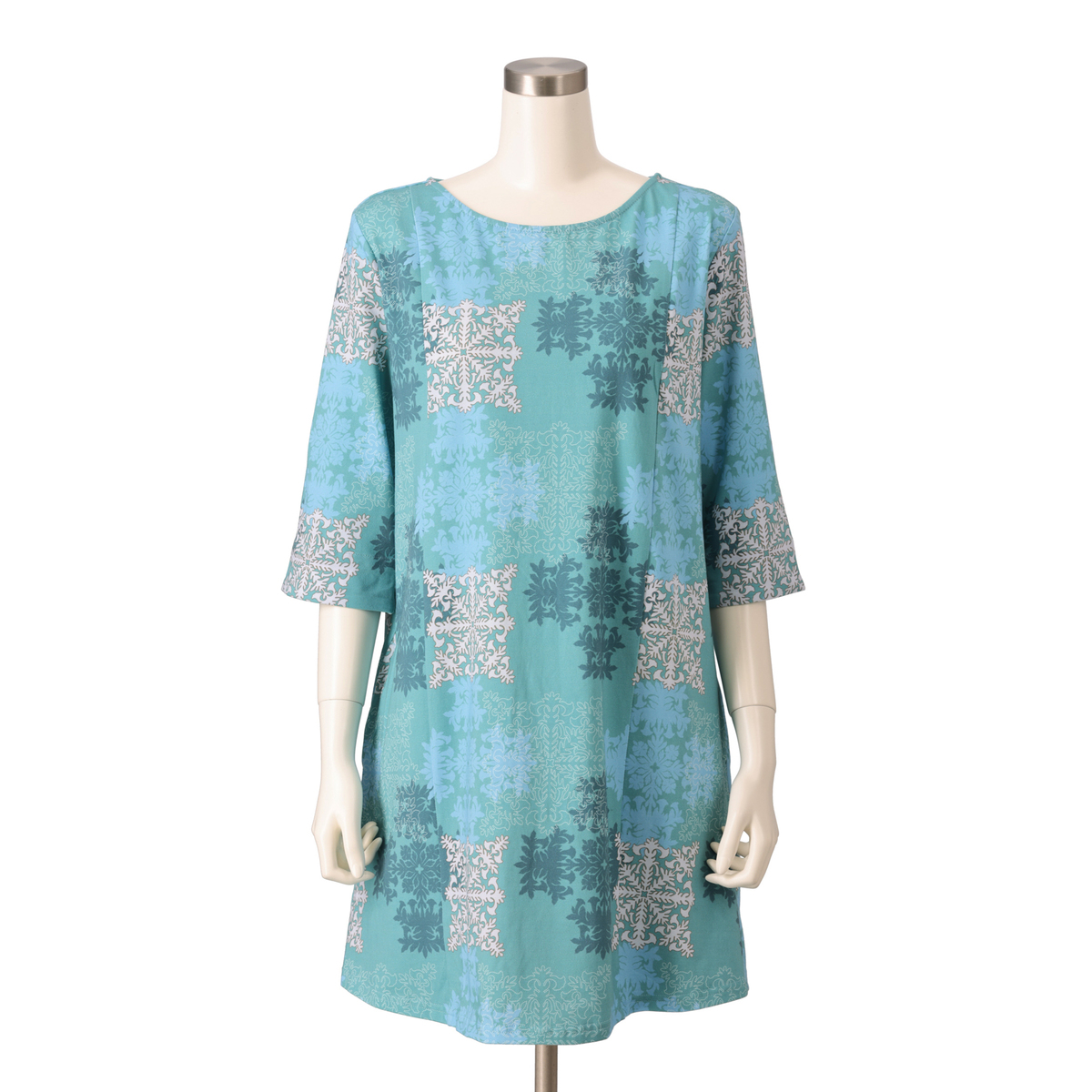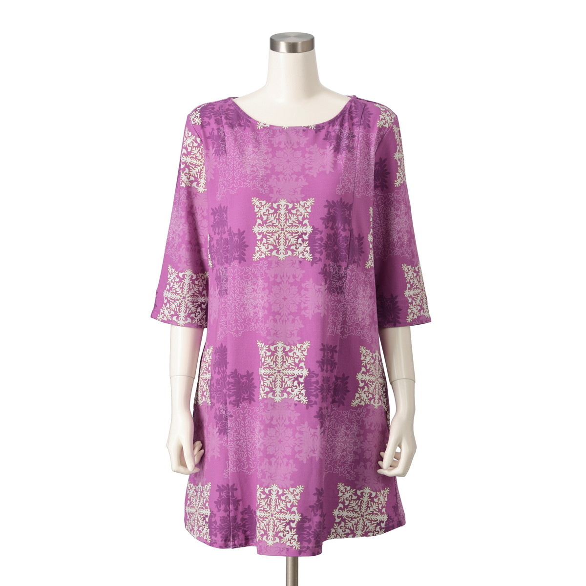 エンゼルストランペットのハワイアンキルトを大胆にプリントしたボートネックのカットソー。ゆったりしたシルエットで着やすく、デイリーで活躍してくれます