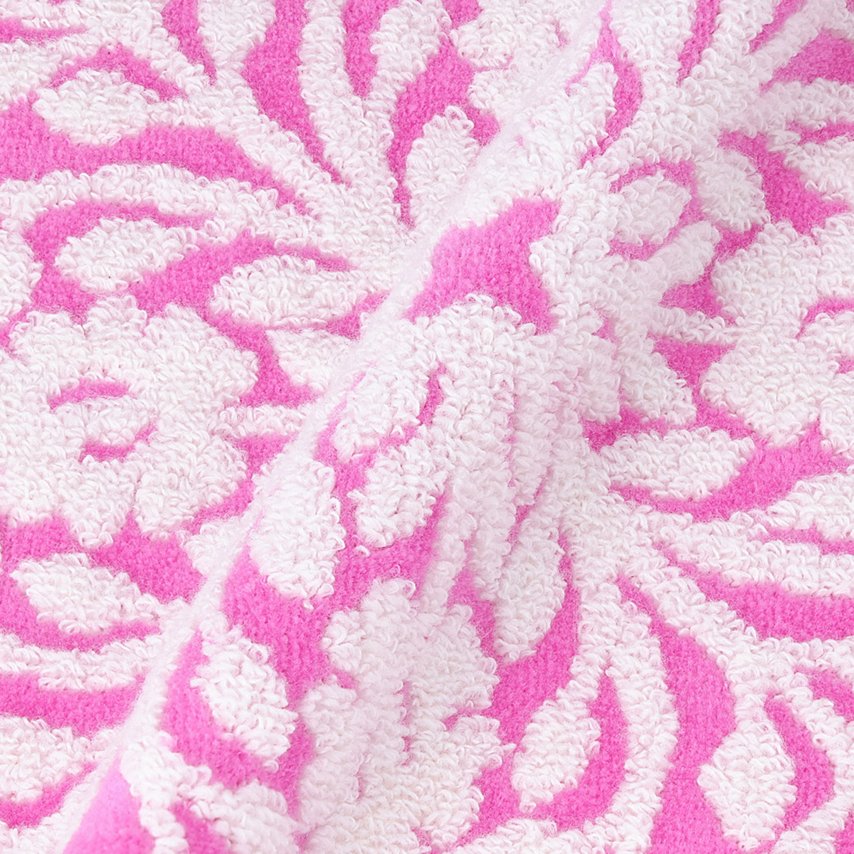 無撚糸蒸シャーリング加工で柄の部分はループ状になっており、柄を鮮やかに表現。グランド部分はシャーリングカットされ凹凸感のある仕上がりに。柄の部分には無撚糸を使用しているのでフワフワとした肌触りをお楽しみいただけます