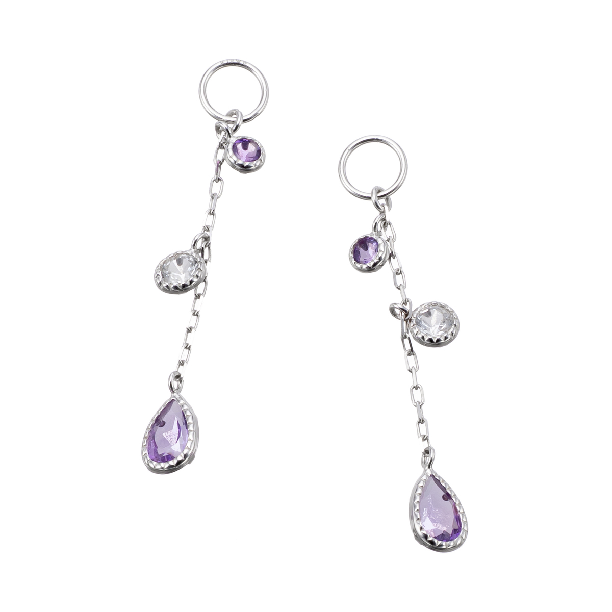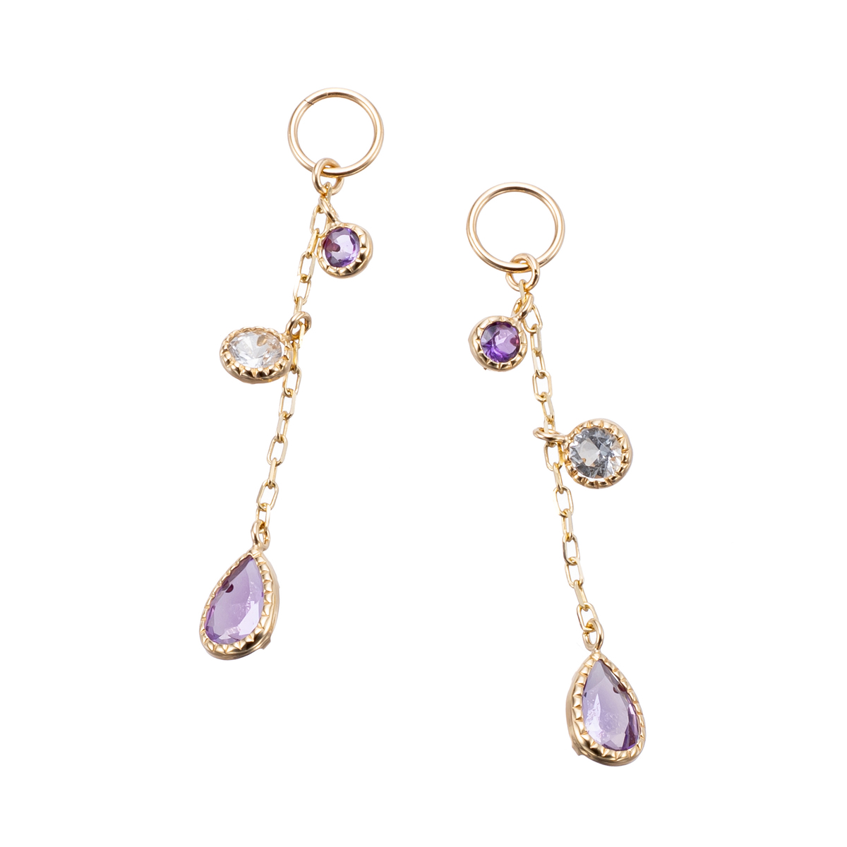 素材:[アメシスト] ラウンドシェイプ 裏爪留め 2石、 ペアシェイプ 裏爪留め 2石 [ホワイトトパーズ] ラウンドシェイプ 裏爪留め 2石 チャーム内径約3.0mm 長さ:約27.0mm(マルカン含む) 横:約3.5mm [地金] 10Kイエローゴールド または 10Kホワイトゴールド ■チャーム装着可のピアリングに通すことが可能です ■素材の大きさ・形・色合い、製品のサイズは1点1点多少異なります 【日本製】