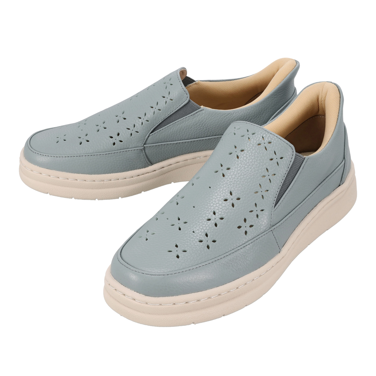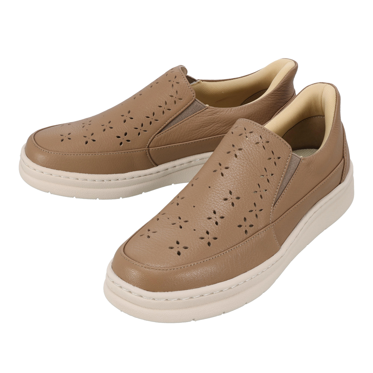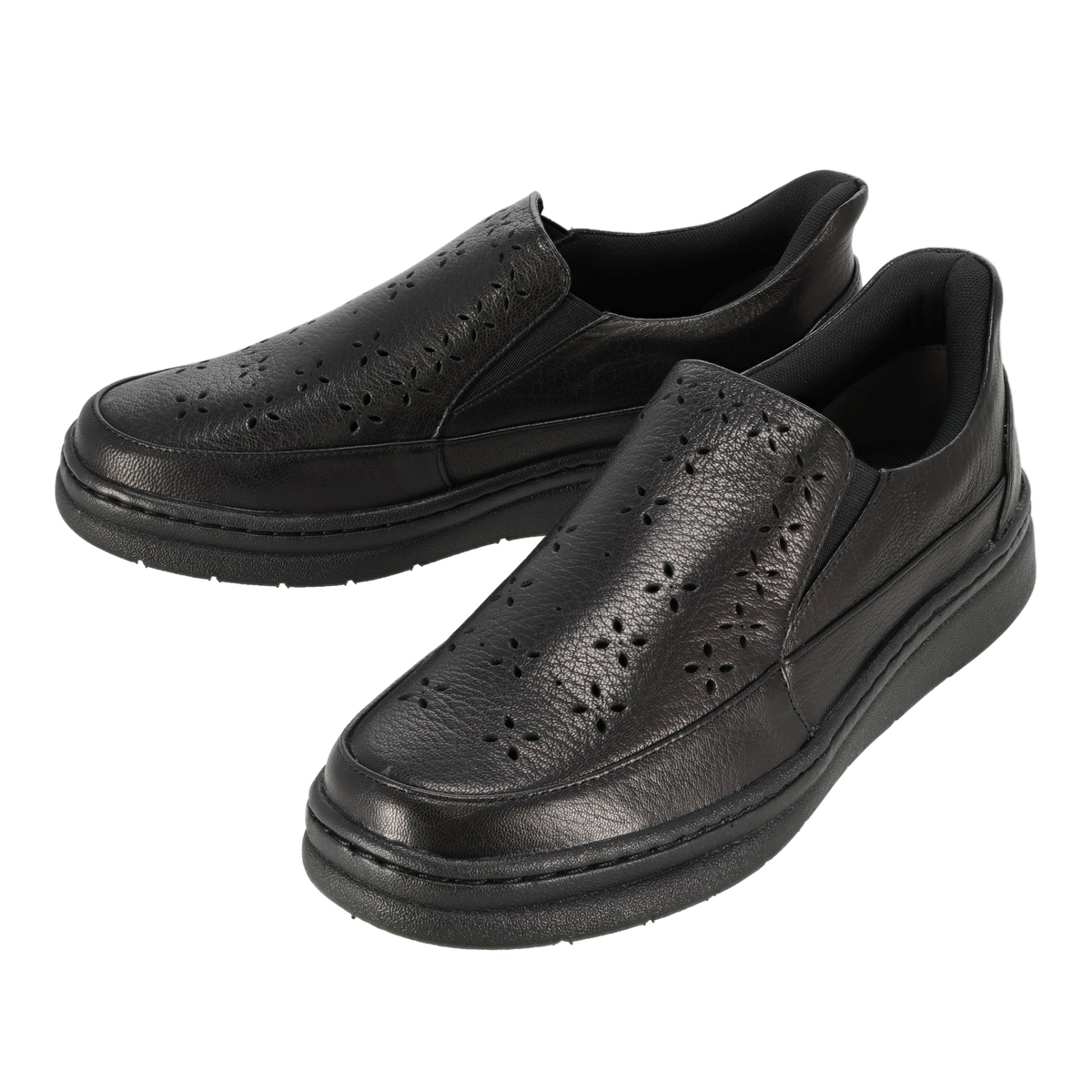 パンチングデザインのスリッポン。両サイドにはゴム入りで、脱ぎ履きしやすく、歩行時にも甲を圧迫しにくく。革の特性の塑性と弾性が損なわれることのない、甲革を吊り込まない袋縫い製法で足を優しくしっかりと包み込みます