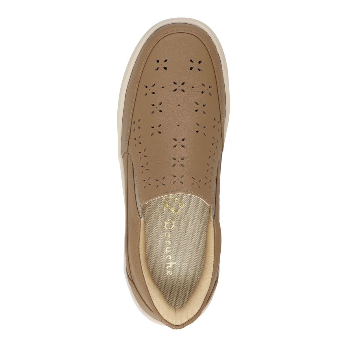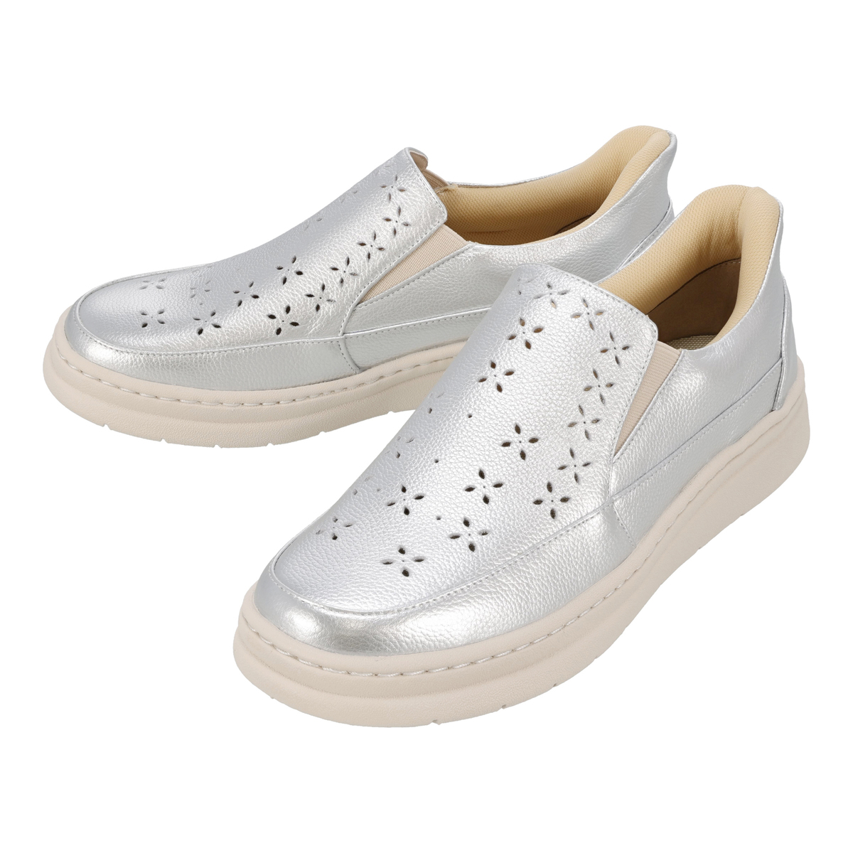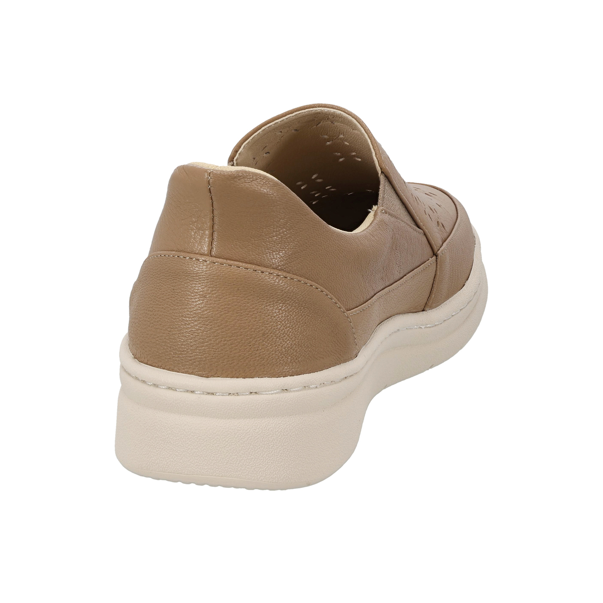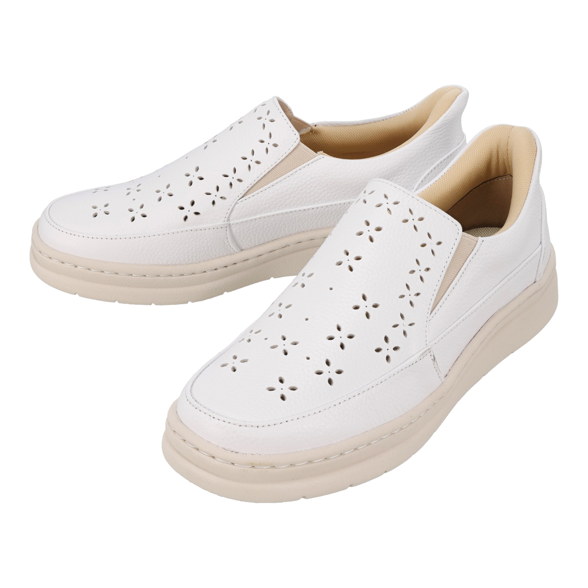 パンチングデザインのスリッポン。両サイドにはゴム入りで、脱ぎ履きしやすく、歩行時にも甲を圧迫しにくく。革の特性の塑性と弾性が損なわれることのない、甲革を吊り込まない袋縫い製法で足を優しくしっかりと包み込みます
