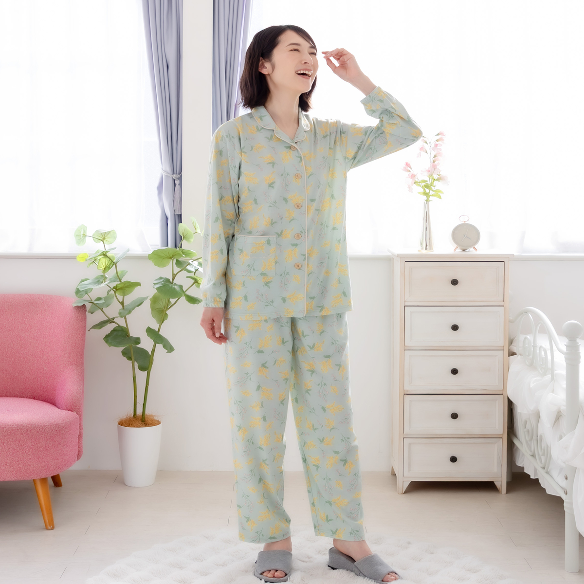 フラワーショップでも有名な「日比谷花壇」とコラボしたプリント柄は、2種類とも葉をモチーフにした柄に。フローリストさんから提案された色と柄をベースに、快眠を目指すパジャマらしいアレンジを施しました。快適なぐっすり時間をお過ごしください