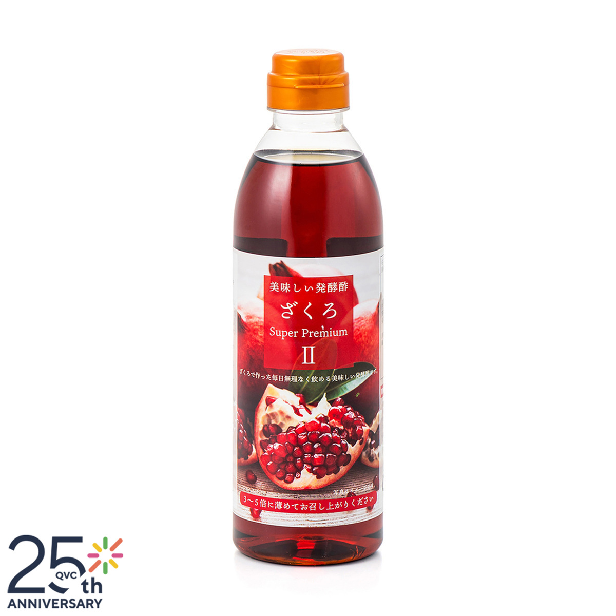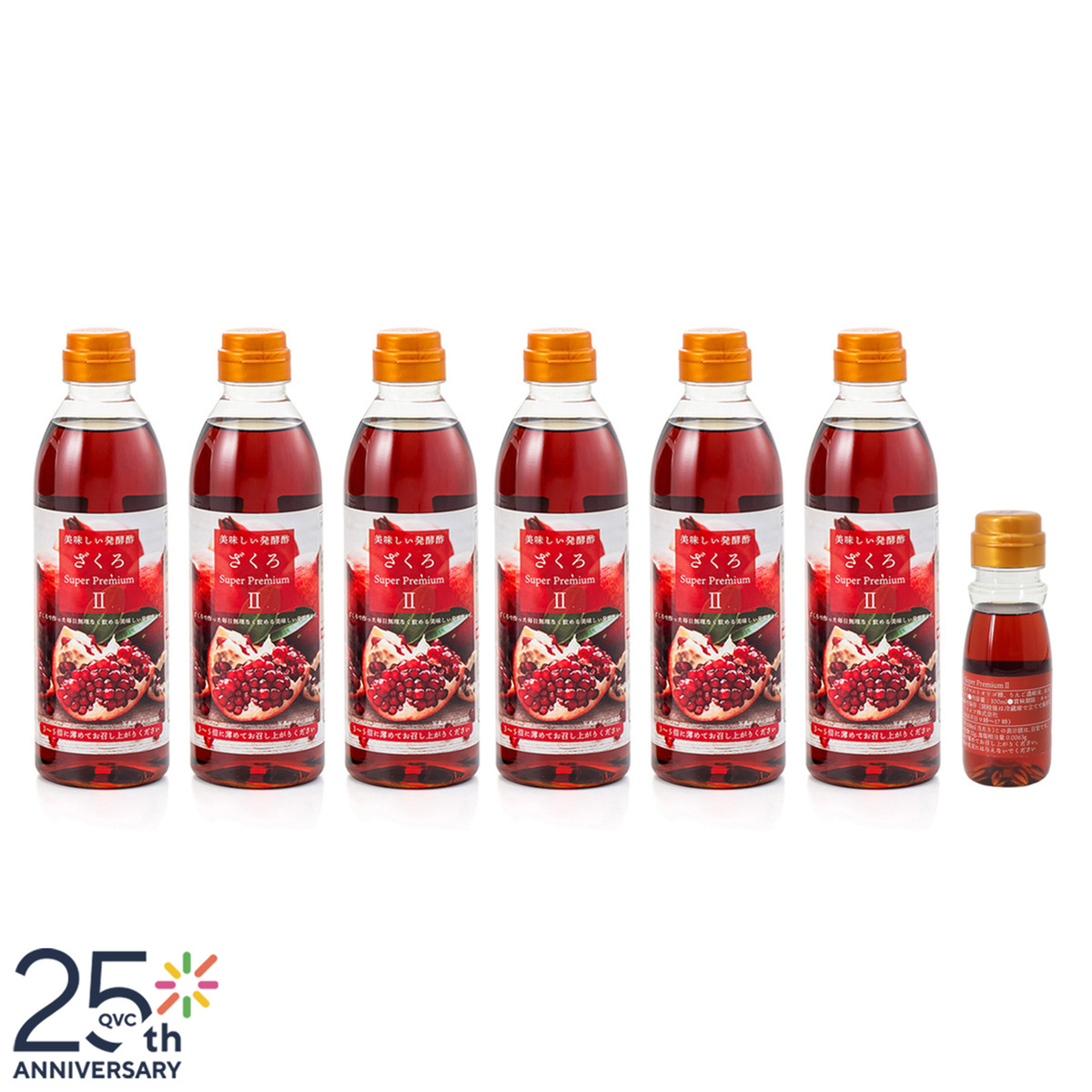 ザクロエキスをじっくり発酵させたフルーティで美味しい健康酢。1本(500ml)に1個約200〜250gのざくろを約6個使用しています。QVC25周年を記念して、6本+100mlのミニボトルの特別セットで登場です