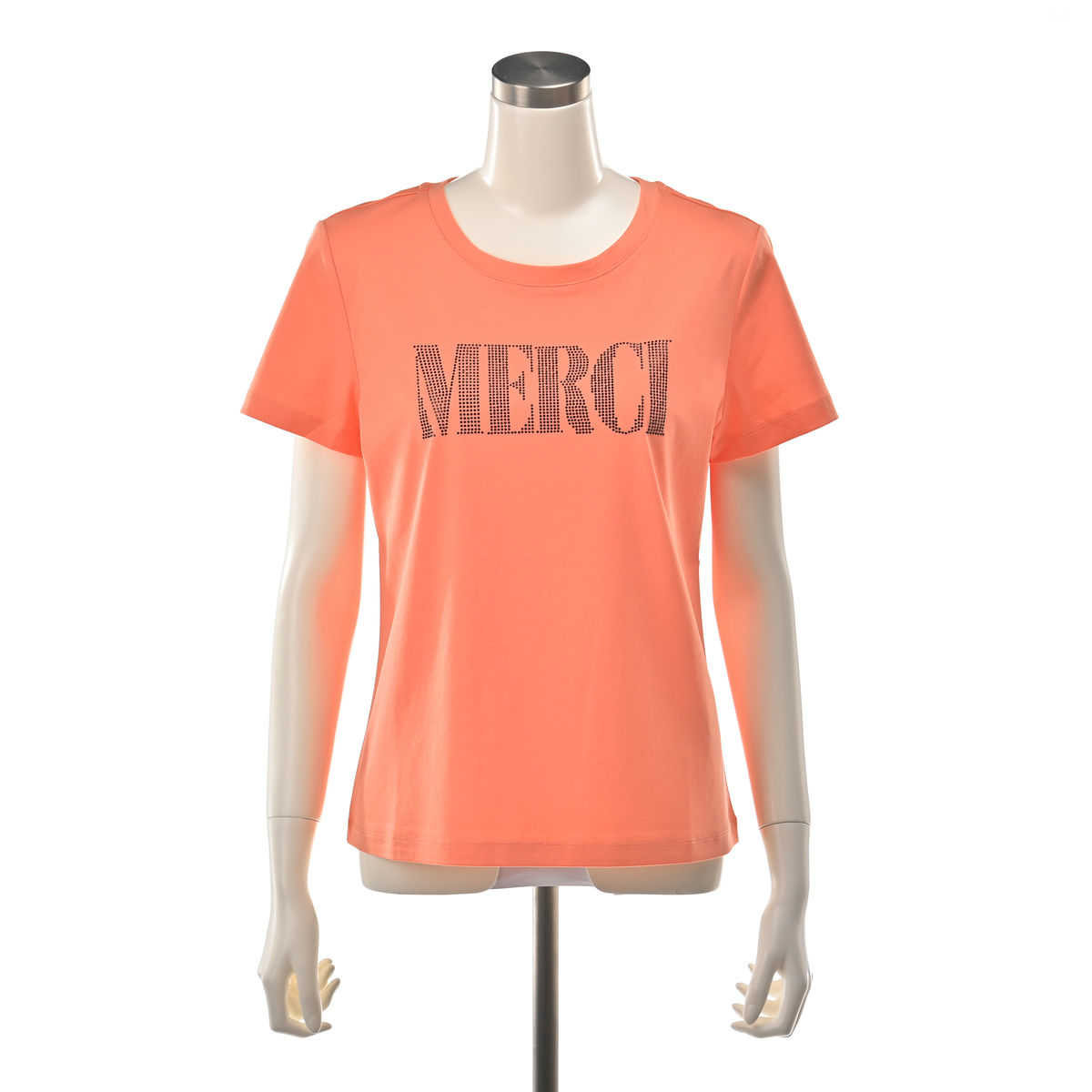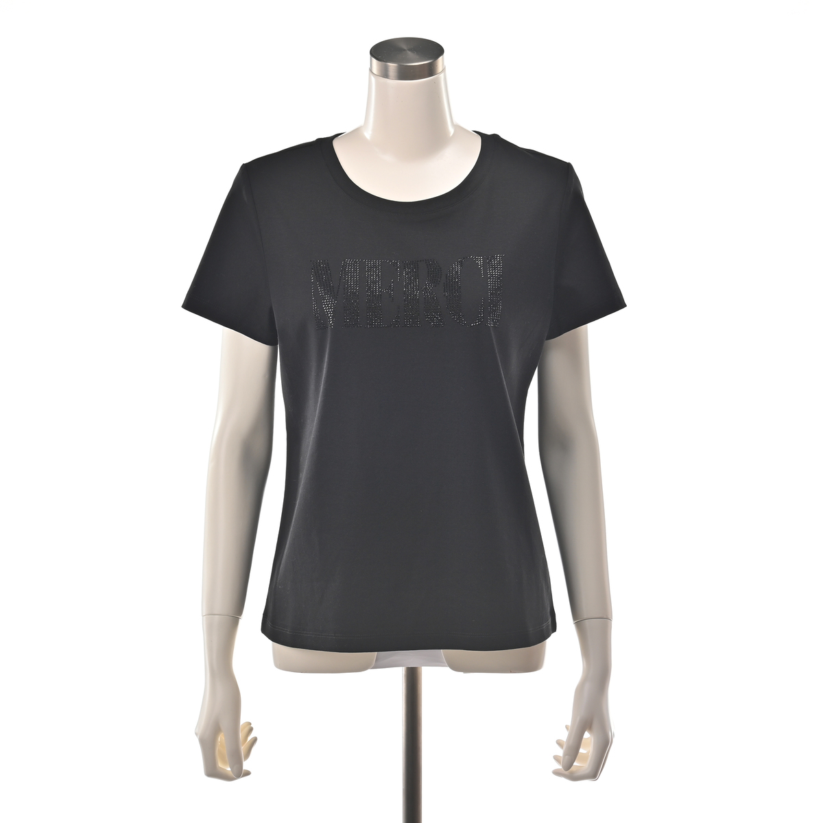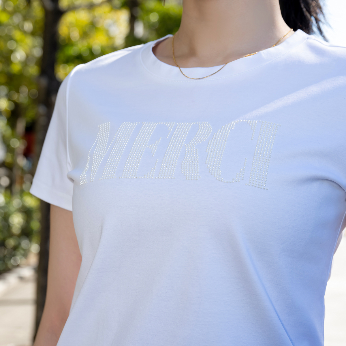 胸元の「MERCI」をビジューであしらい、遊び心を添えたTシャツ。ビジューがアクセサリーのように輝き、ネックレスいらずで装いが華やぎます。ジャケットの中にすっきり収まる形が欲しいという声から生まれた、大人のためのコンパクトシルエットです